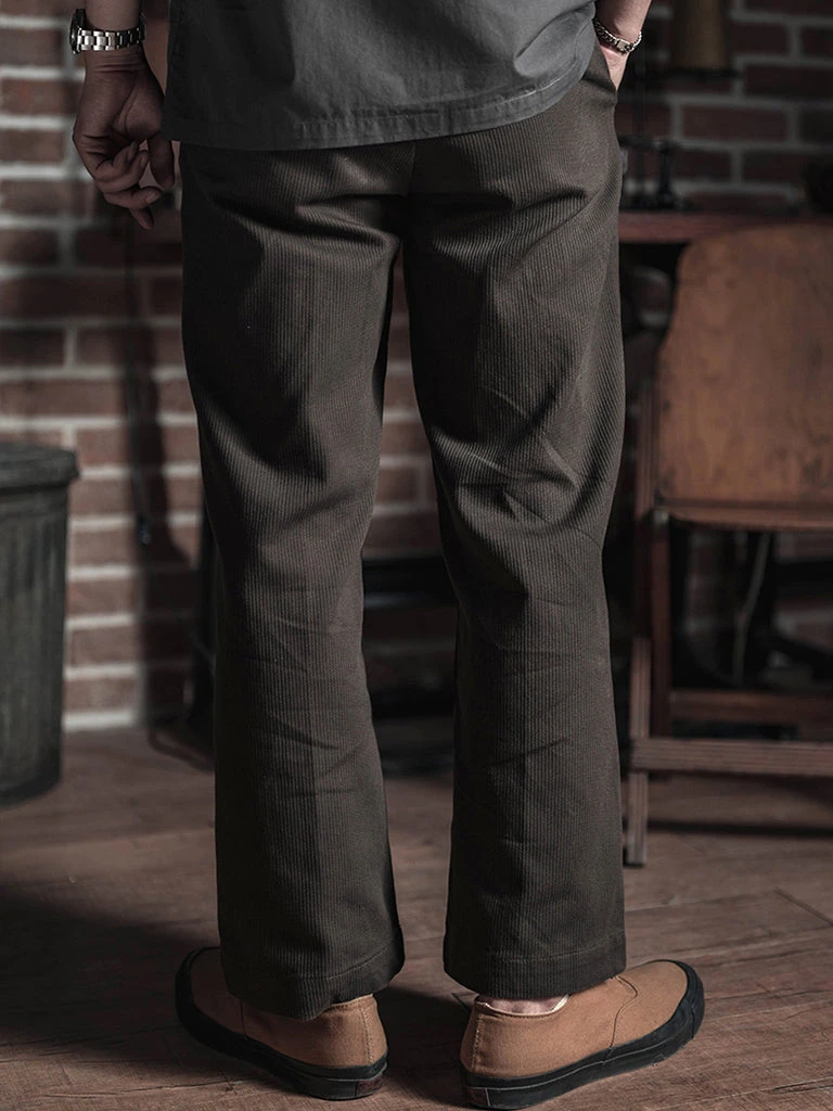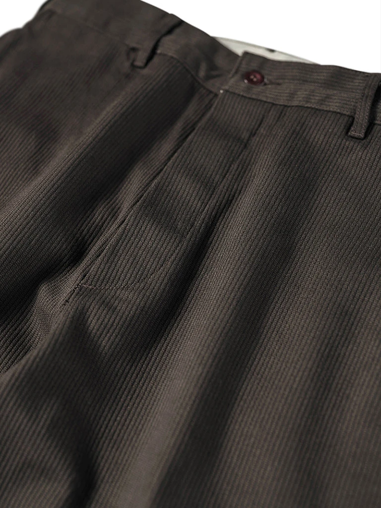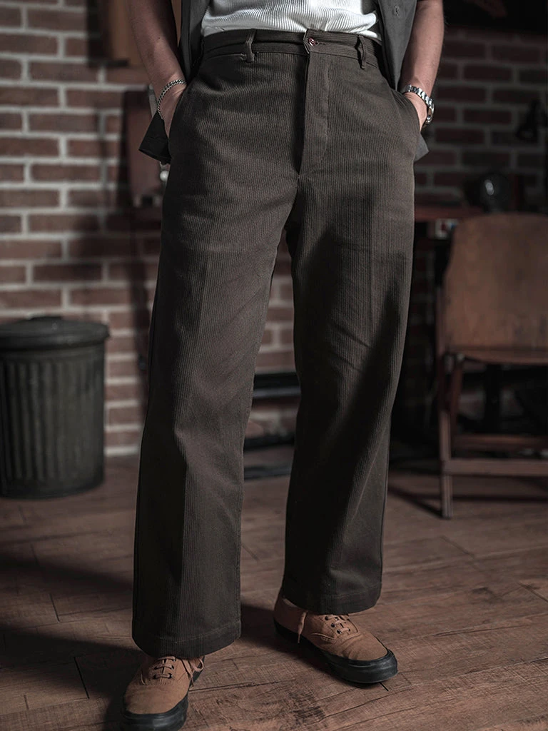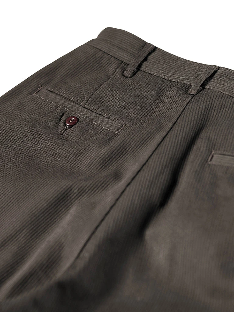 These trousers are not made of corduroy but are made of custom yarn-dyed Bedford cord fabric, with a classic high-waisted look and wider legs, giving a strong sense of retro.