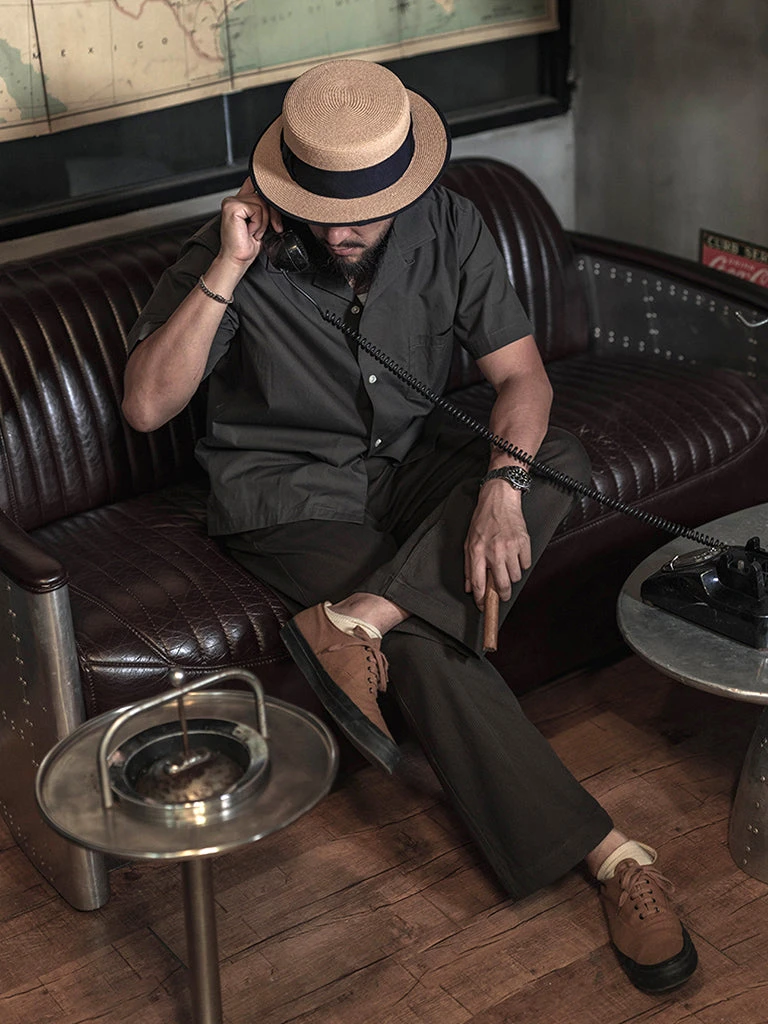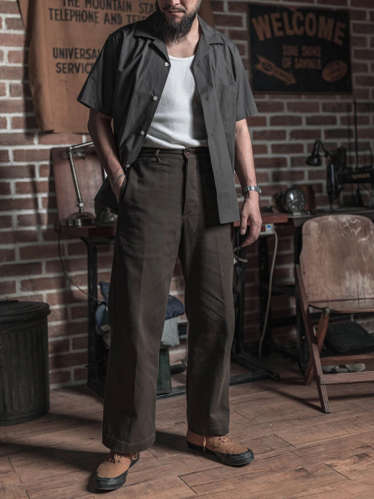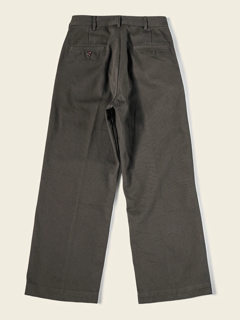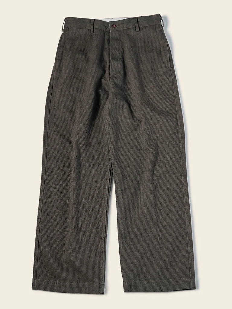 These trousers are not made of corduroy but are made of custom yarn-dyed Bedford cord fabric, with a classic high-waisted look and wider legs, giving a strong sense of retro.