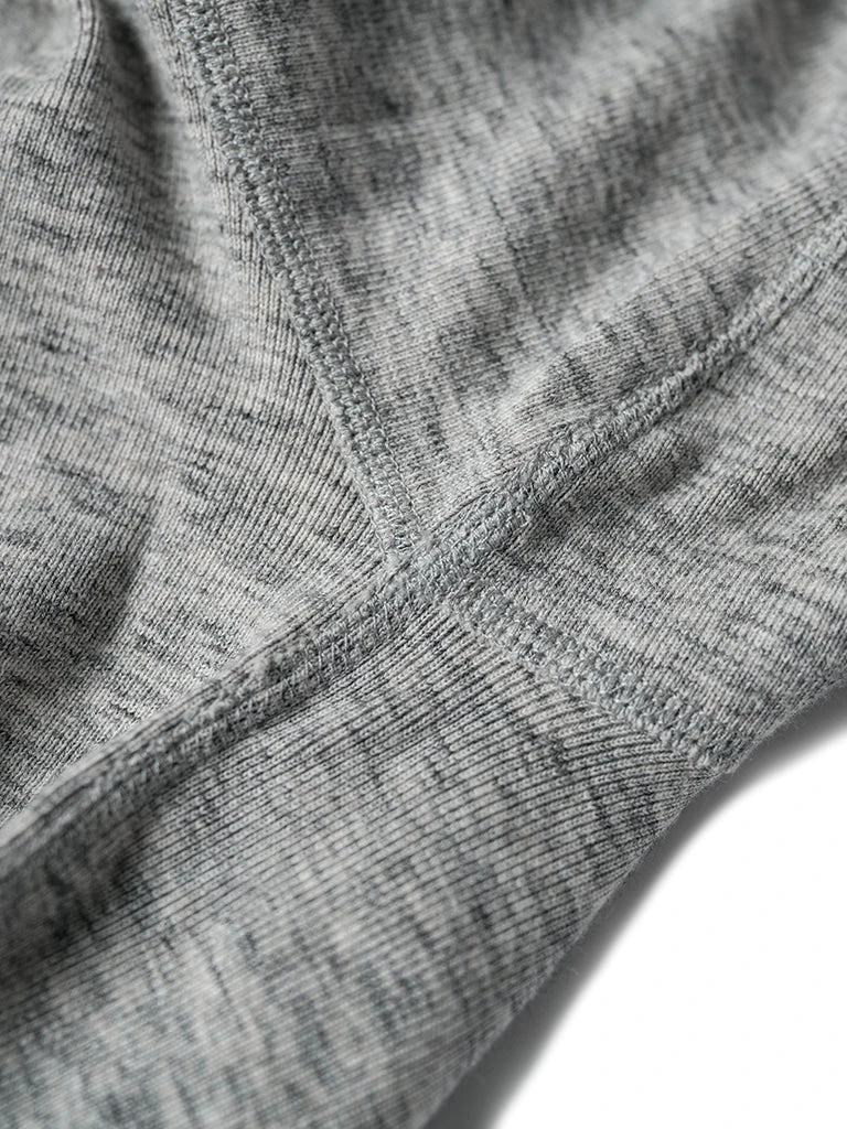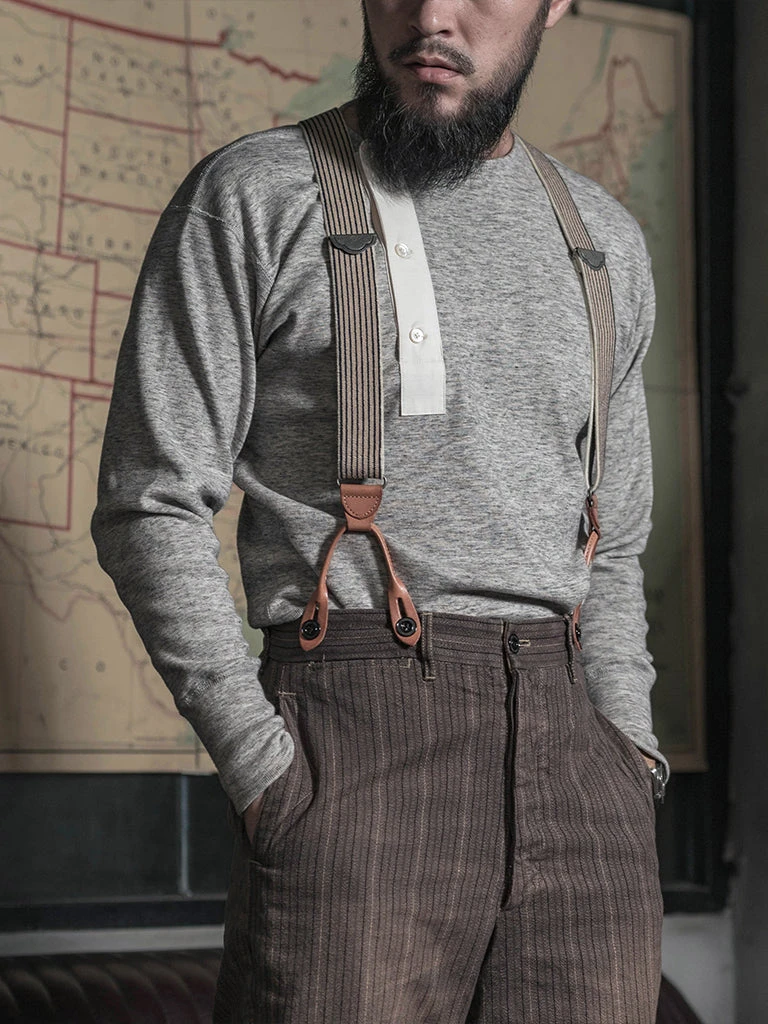 This Henry t-shirt is made of heavyweight cotton thread fabric. According to old-time underwear standards, with four-needle six lines sewing, it’s very comfortable to wear. It’s a broad shoulder cut and a threaded hem, appears in an inverted triangle, flatter the figure even more. It works well with old-style suspenders, denim overalls, military pants, and various overalls and military coats.