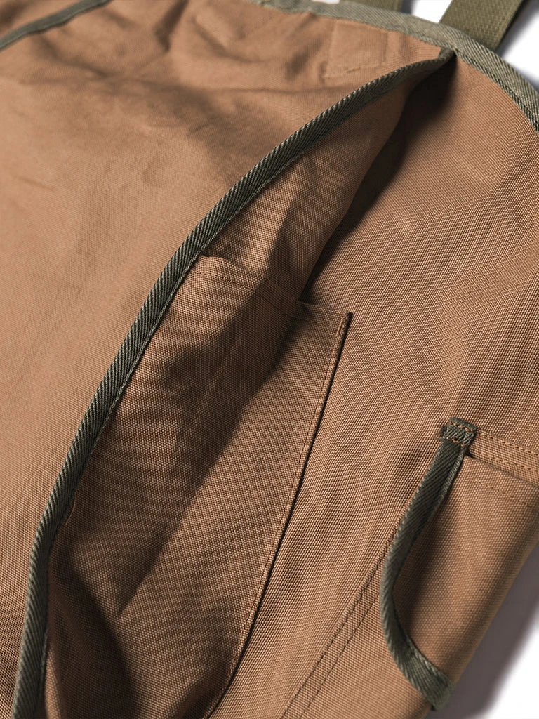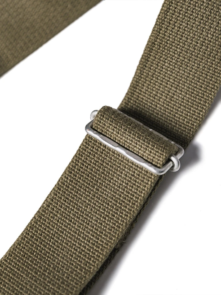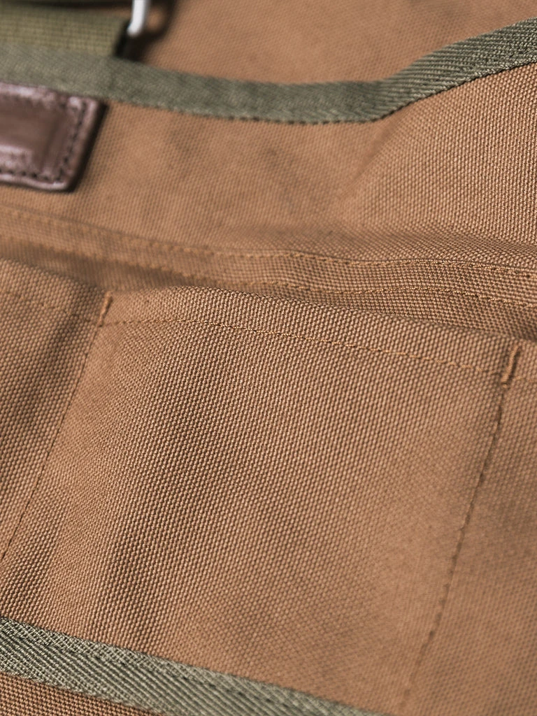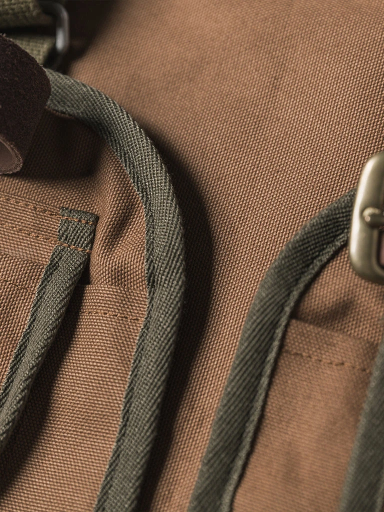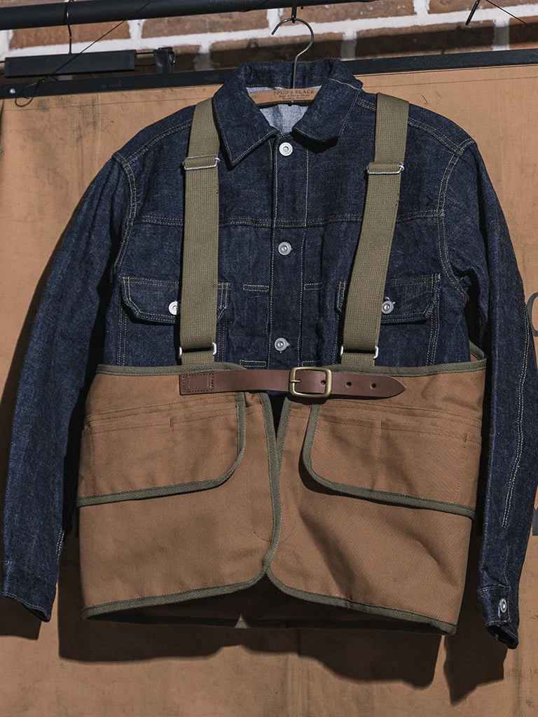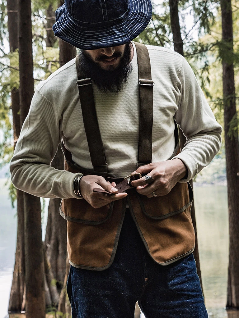 Our canvas hunting vest is also based on products in this period. The main part is made of yellow heavyweight canvas. The edges are covered with military green knitted fabric, matching the shoulder straps that can be adjusted in length to meet different outdoor needs.