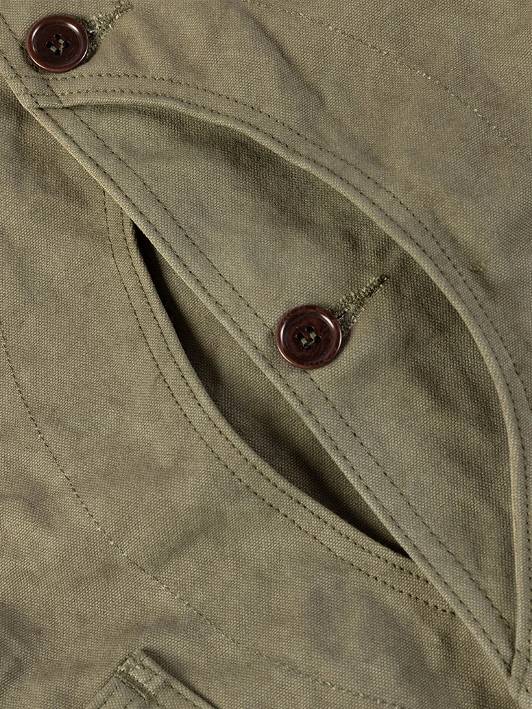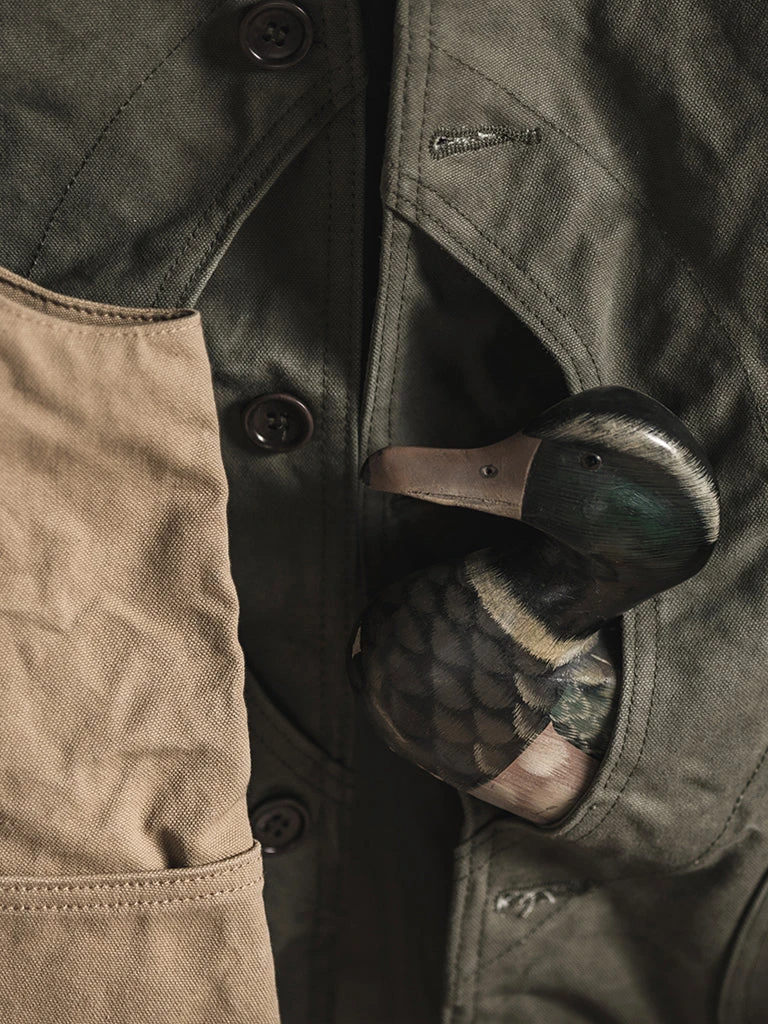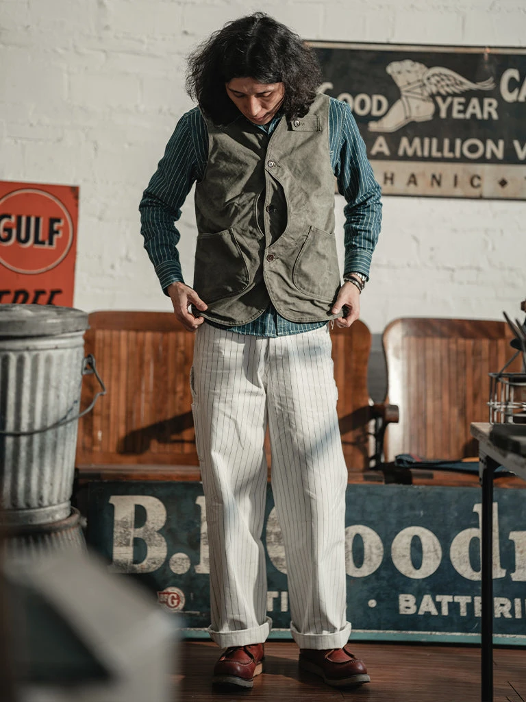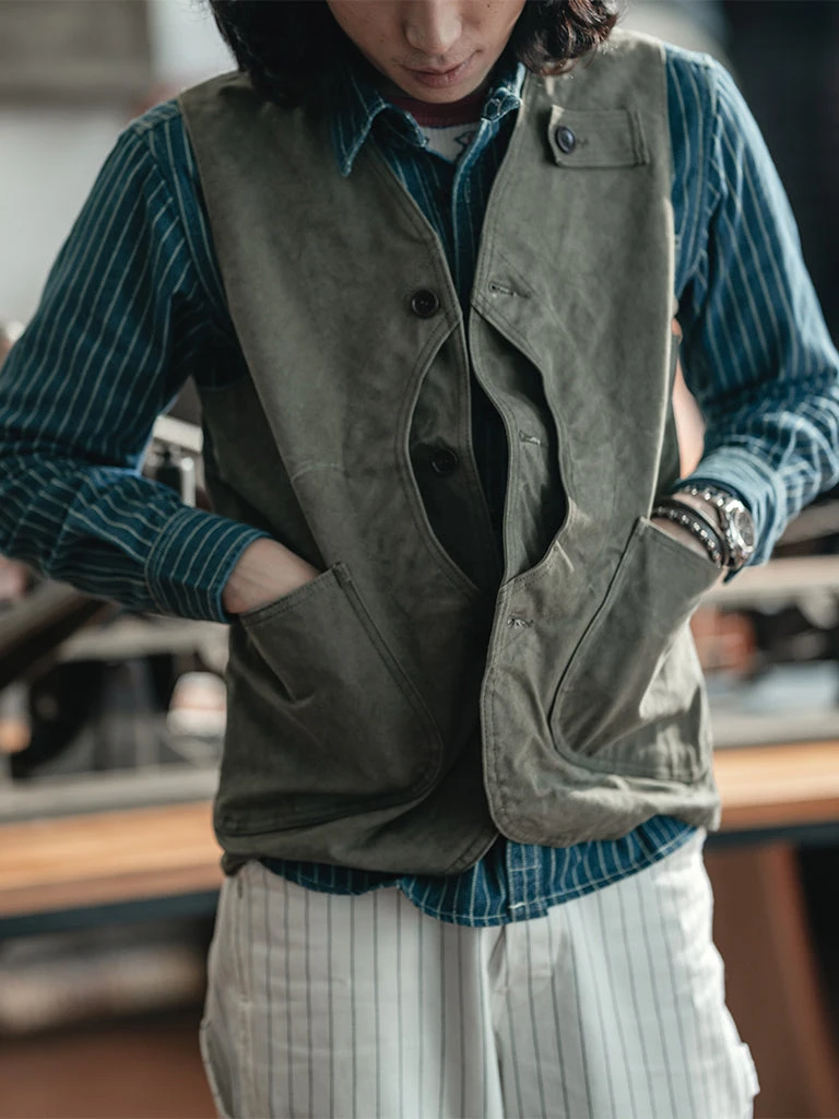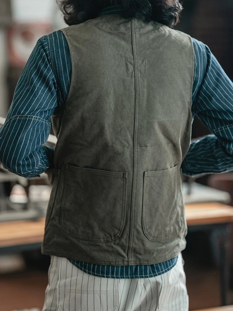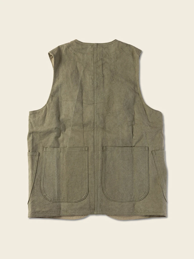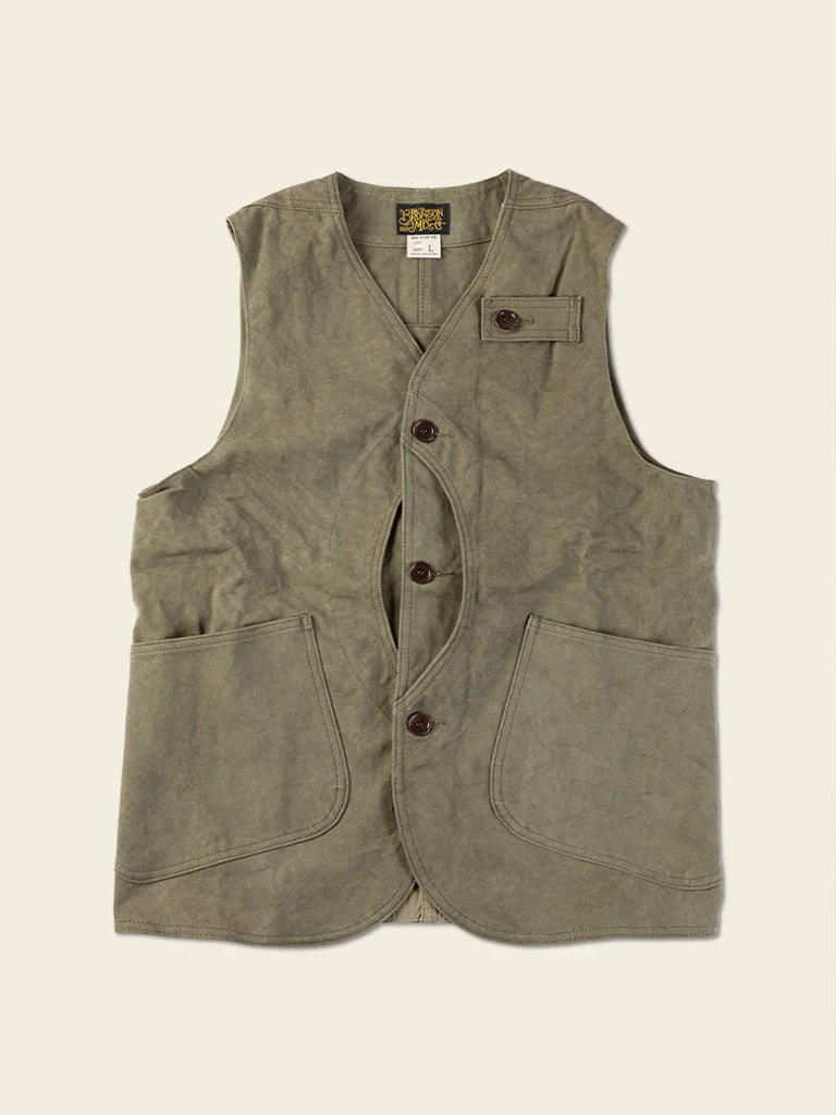 The prototype of this vest is taken from the 1930’s Hunting Vest. This vest is made of heavyweight 16.5 oz canvas. It has a half-curved pocket called “Game Pocket”. It is a hidden mezzanine, which can be used as a storage bag for daily use and is readily available, not easy to lose things. There are two pockets on the back for easy access to items. A horizontal strap is installed above the chest to fix the fishing rod and hook. In addition to being used by hunters and fishers, it was once a classic middle-class outdoor costume.