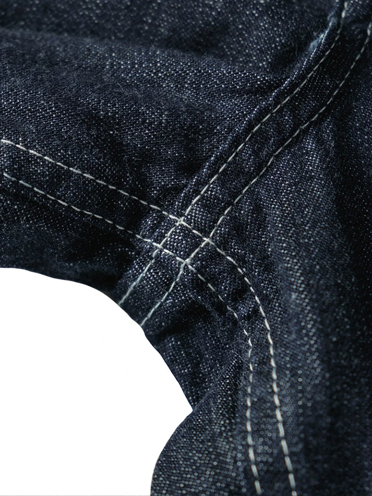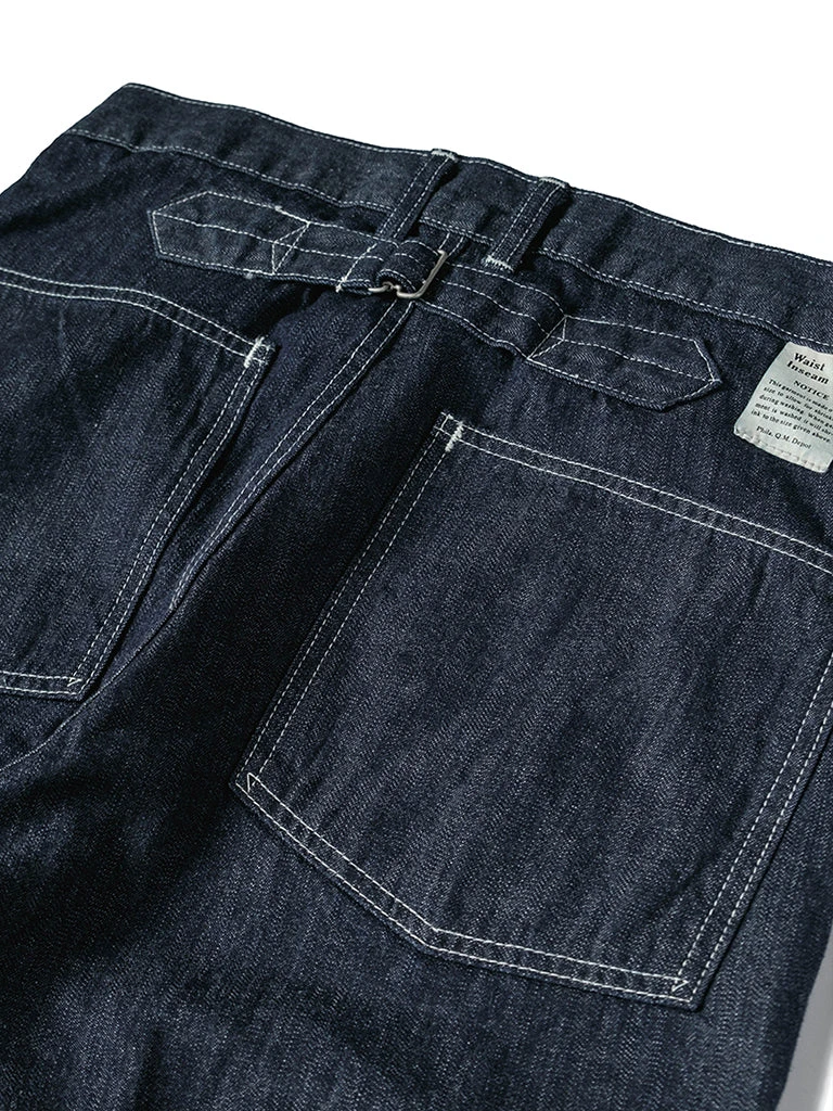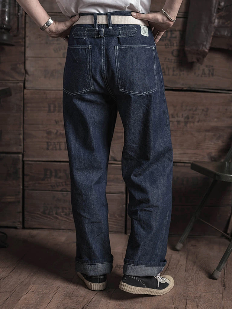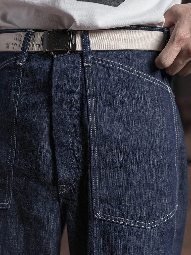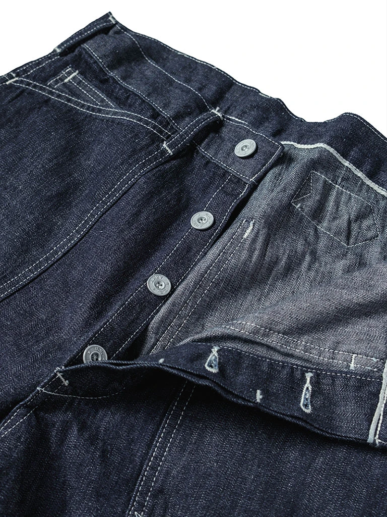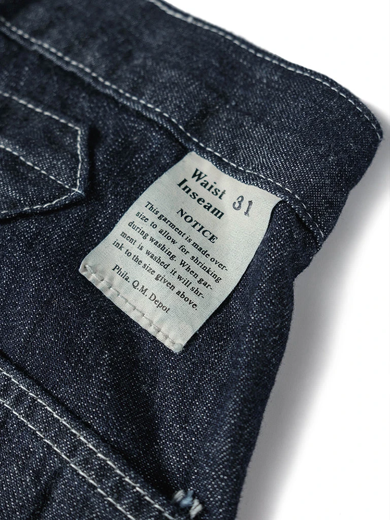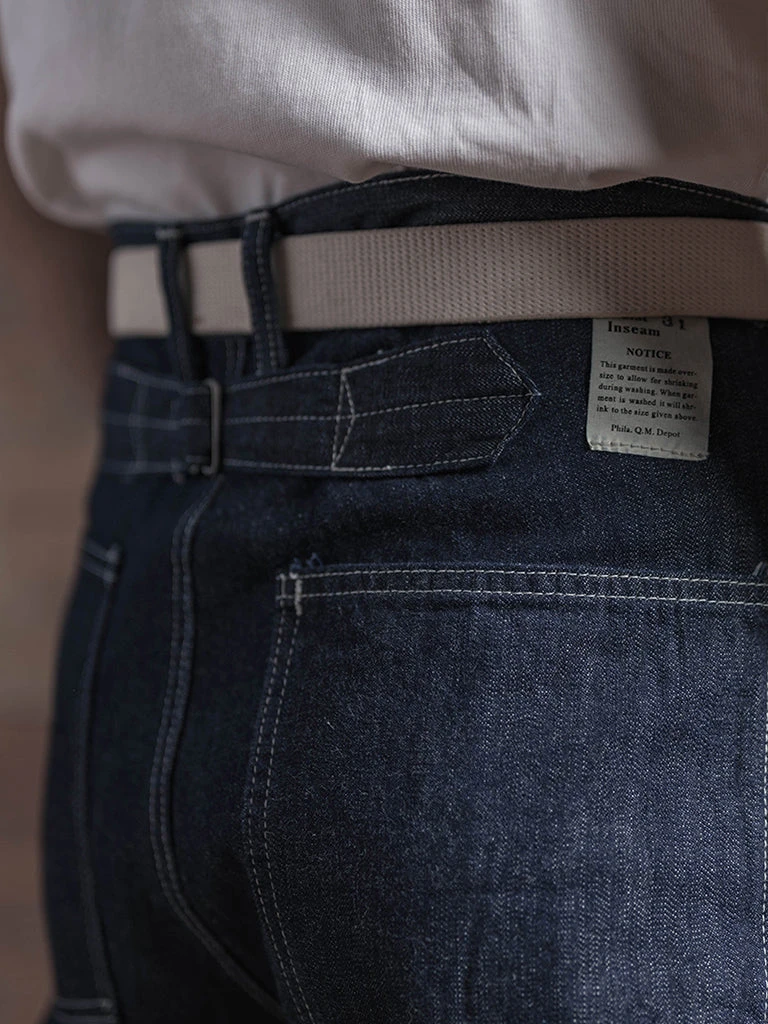 These jeans are part of the CCC fatigue uniform (an earlier version was a brownness twill fabric version issued by the US Army in 1919.). These jeans are combined with a fatigue jumper and a round brim hat(Daisy Mae Hat) to make up a set of fatigue uniforms. By 1942, with World War II raging and the draft in effect, the need for work relief declined, and Congress voted to close the program. The denim overalls were no longer used, they were gradually replaced by herringbone fabric overalls.