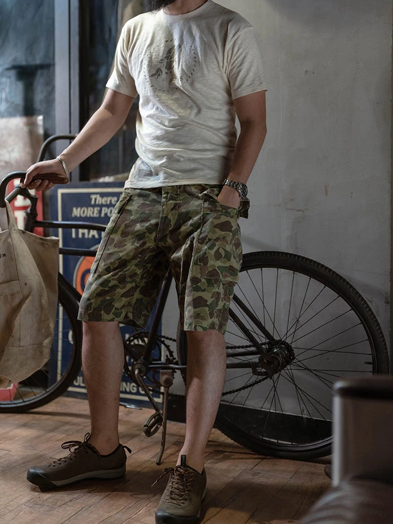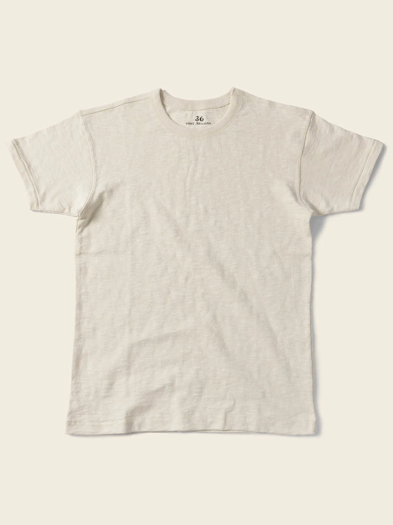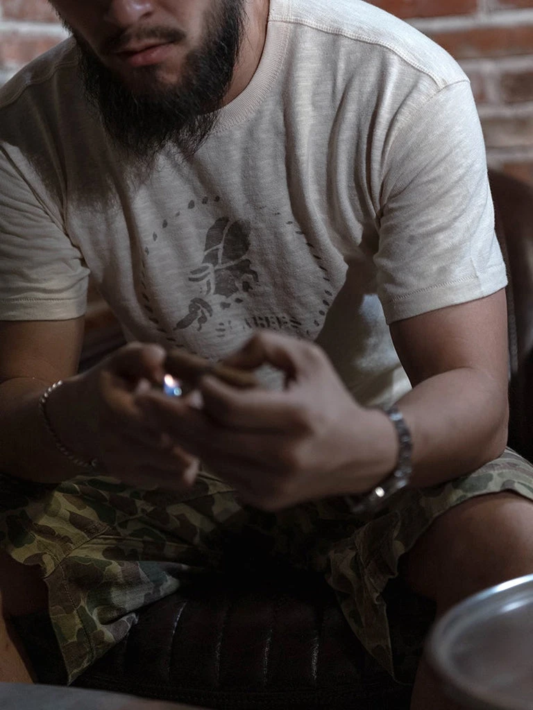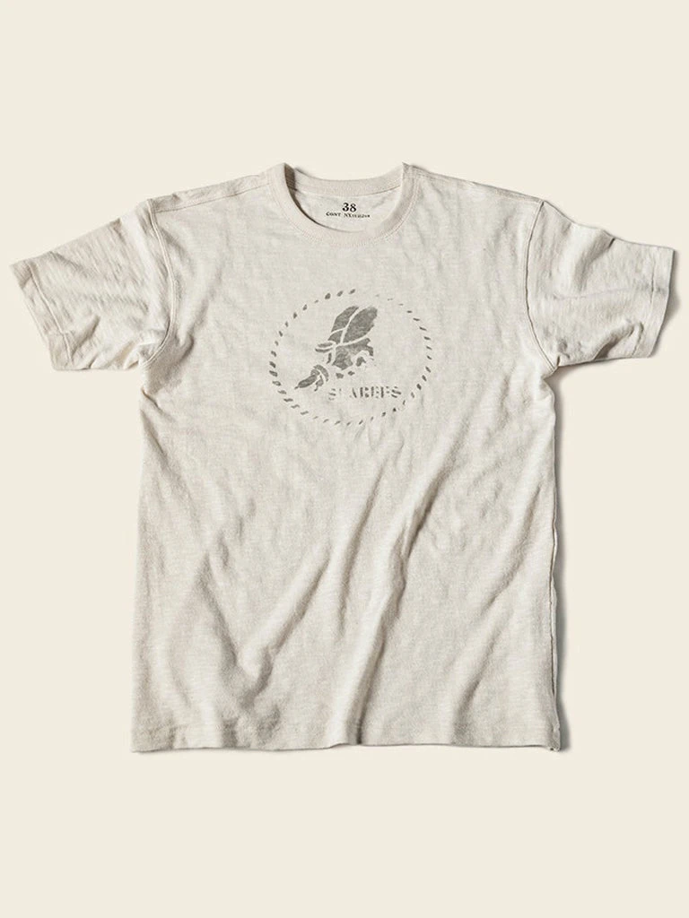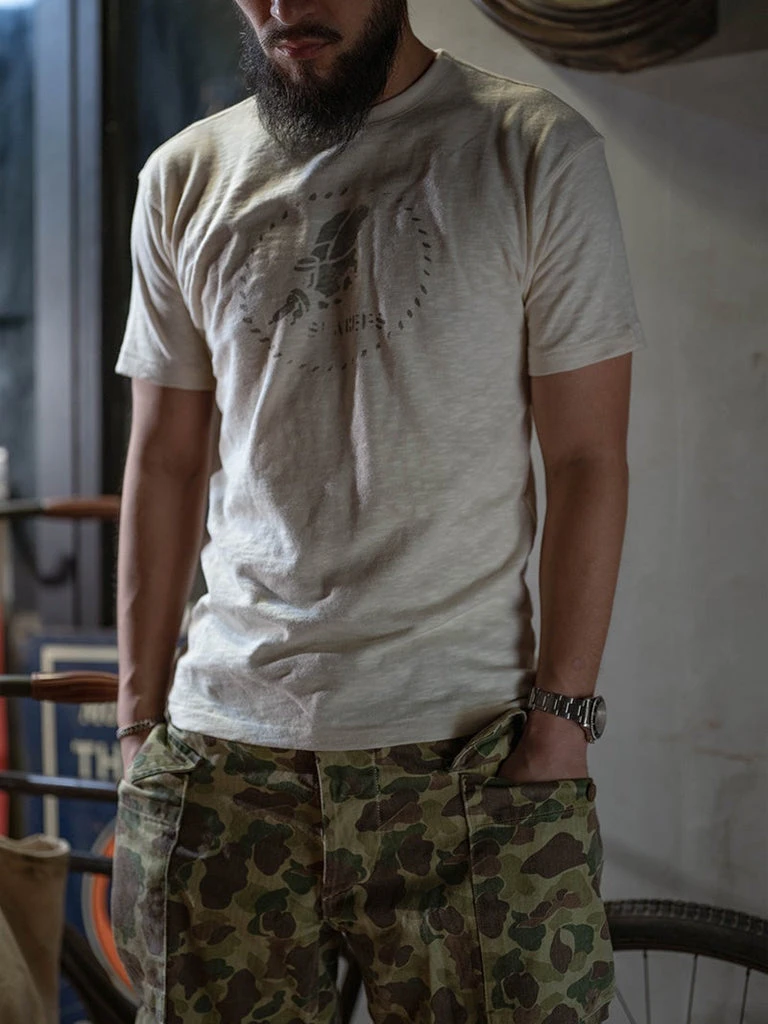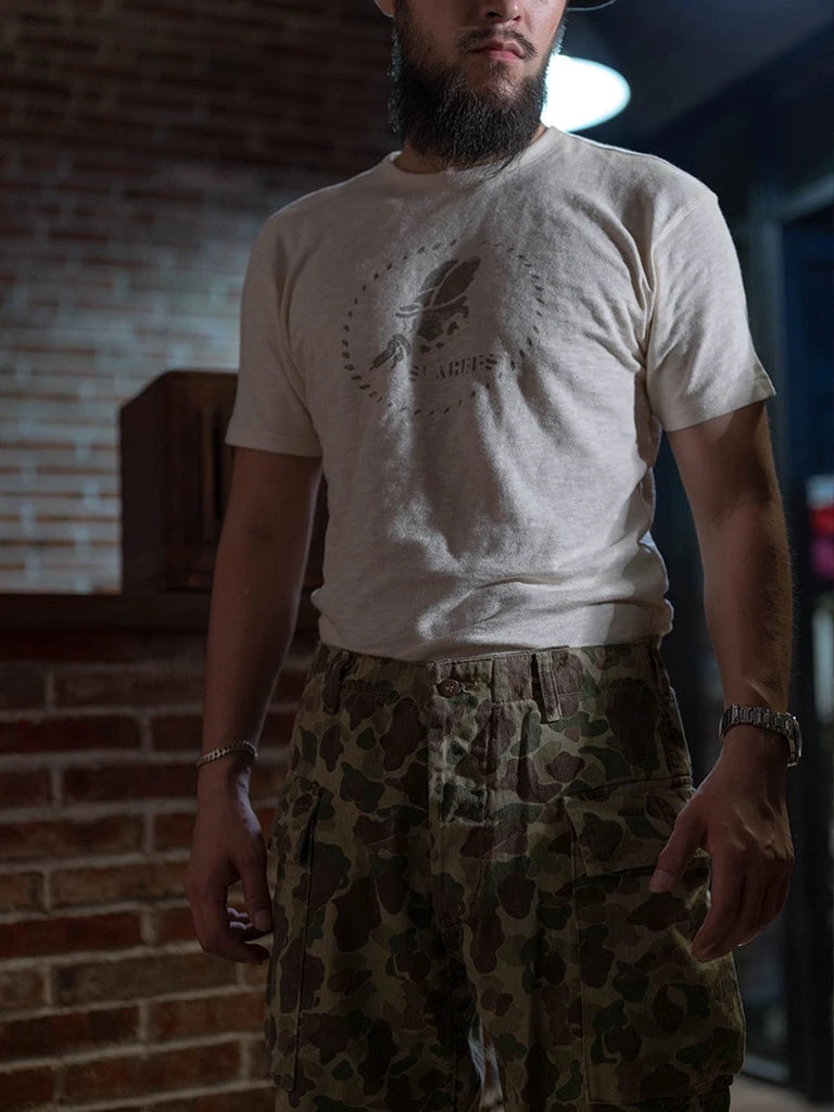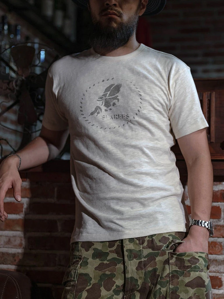 The T-shirt is based on the USN training undershirt from the 1940s and has been optimized for the shape. It is made of custom 8 oz. cotton bamboo slub fabric, which has a strong texture and works well in moisture absorption and sweat. It is available in “Seabees” print and basic versions.This T-shirt is a “Seabees” print version.