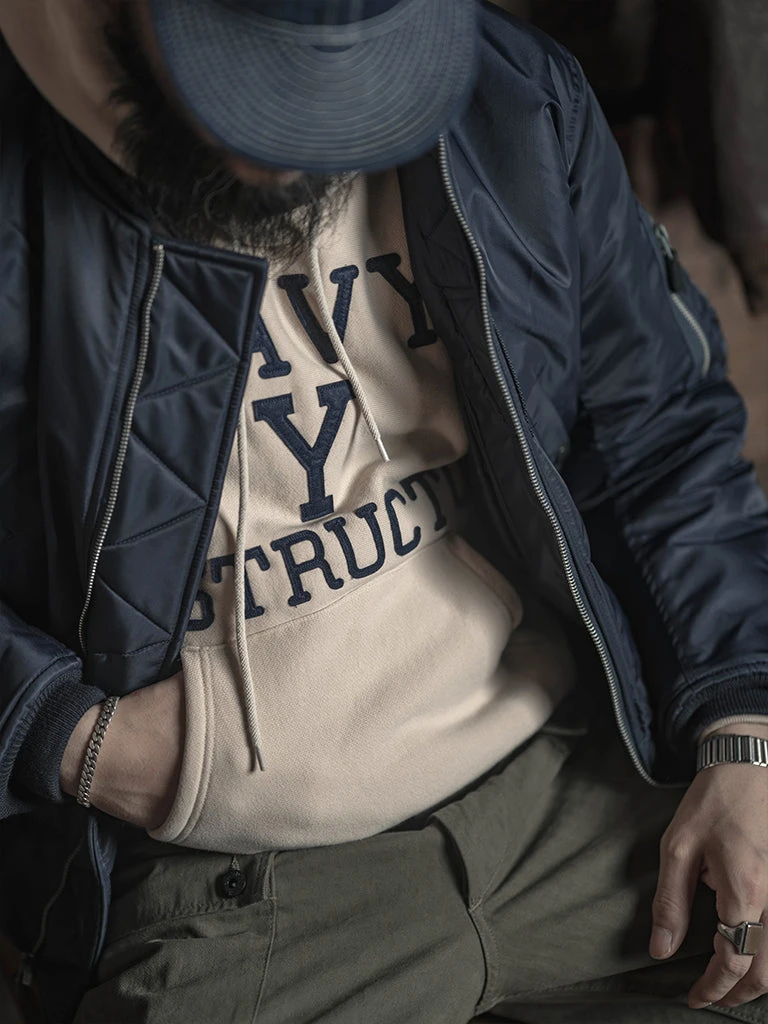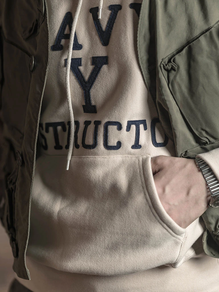 Based on the Navy Yard Training Hoodie, the felt letter “NAVY Y” on the chest stands for Navy Yard. Boxing instructors usually wore these hoodies in shipyards.