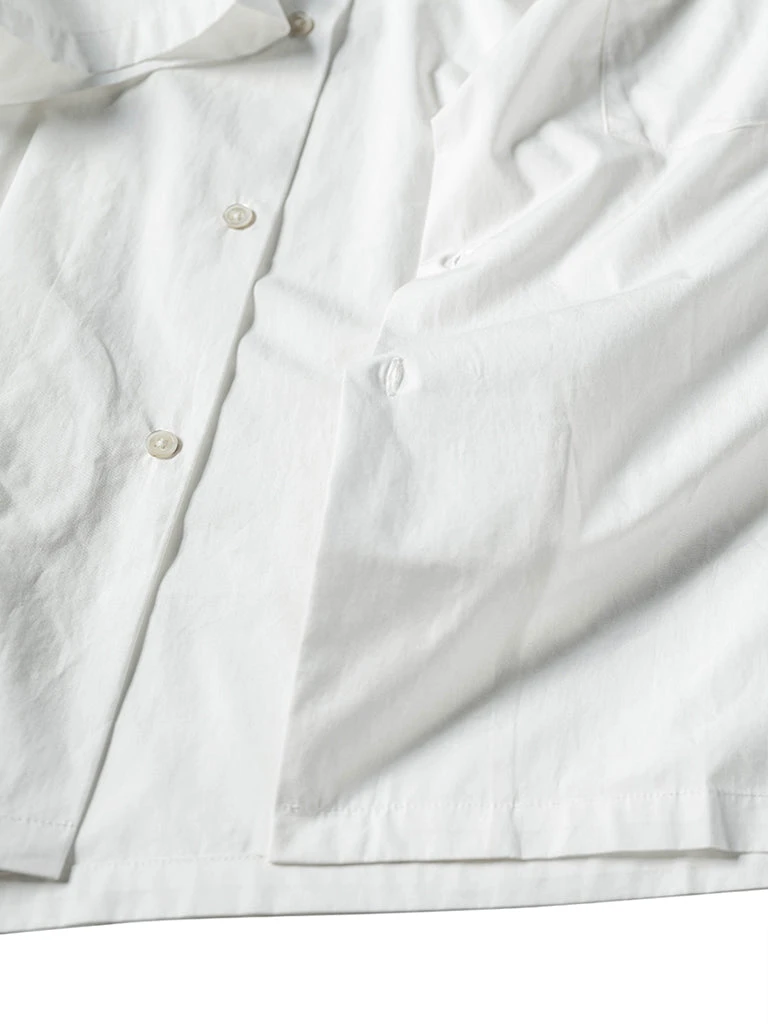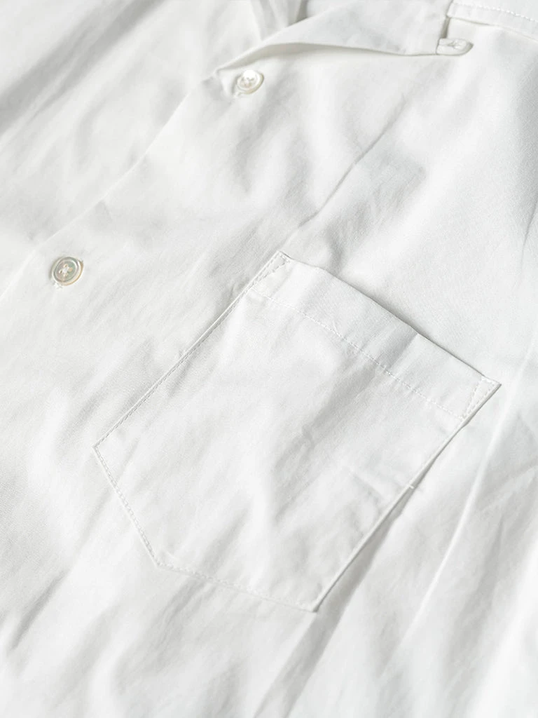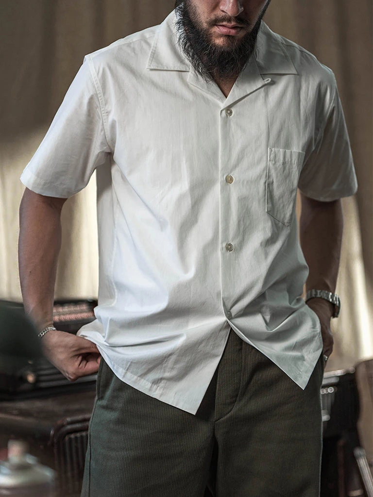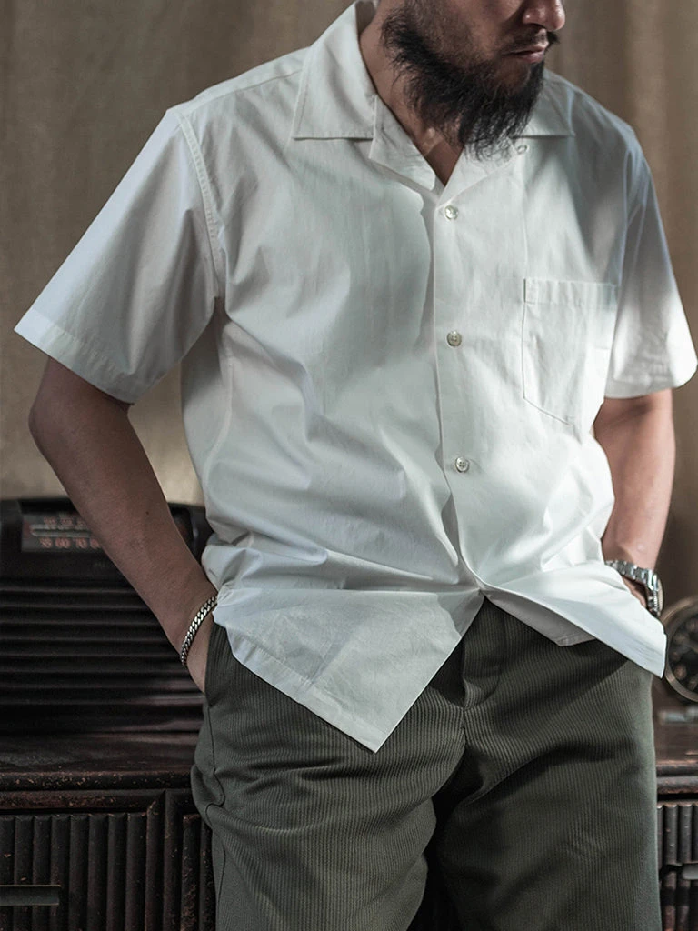 This classic Panama open collar shirt is made of cotton poplin fabric with natural shell buttons, has ivory white & dark gray two colors.
