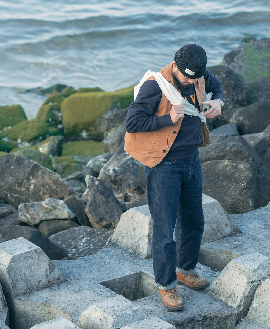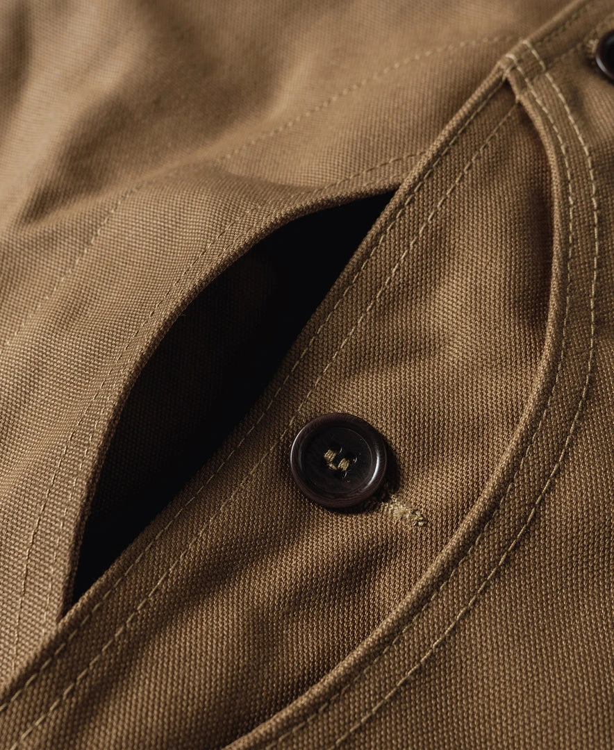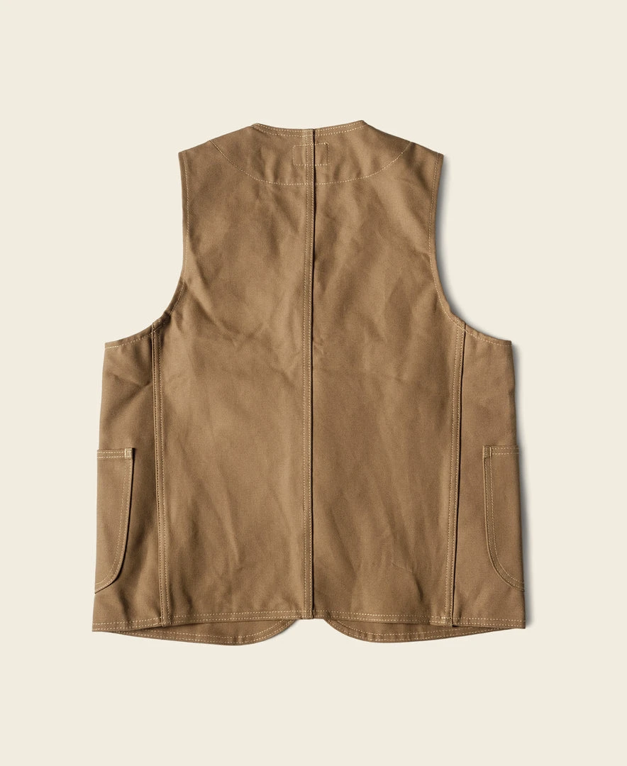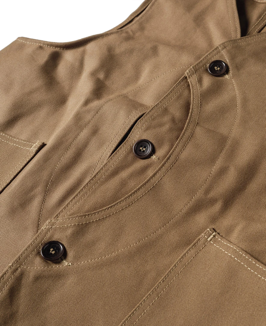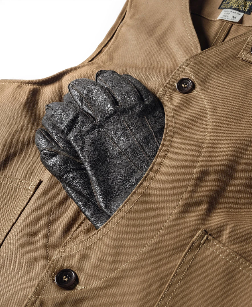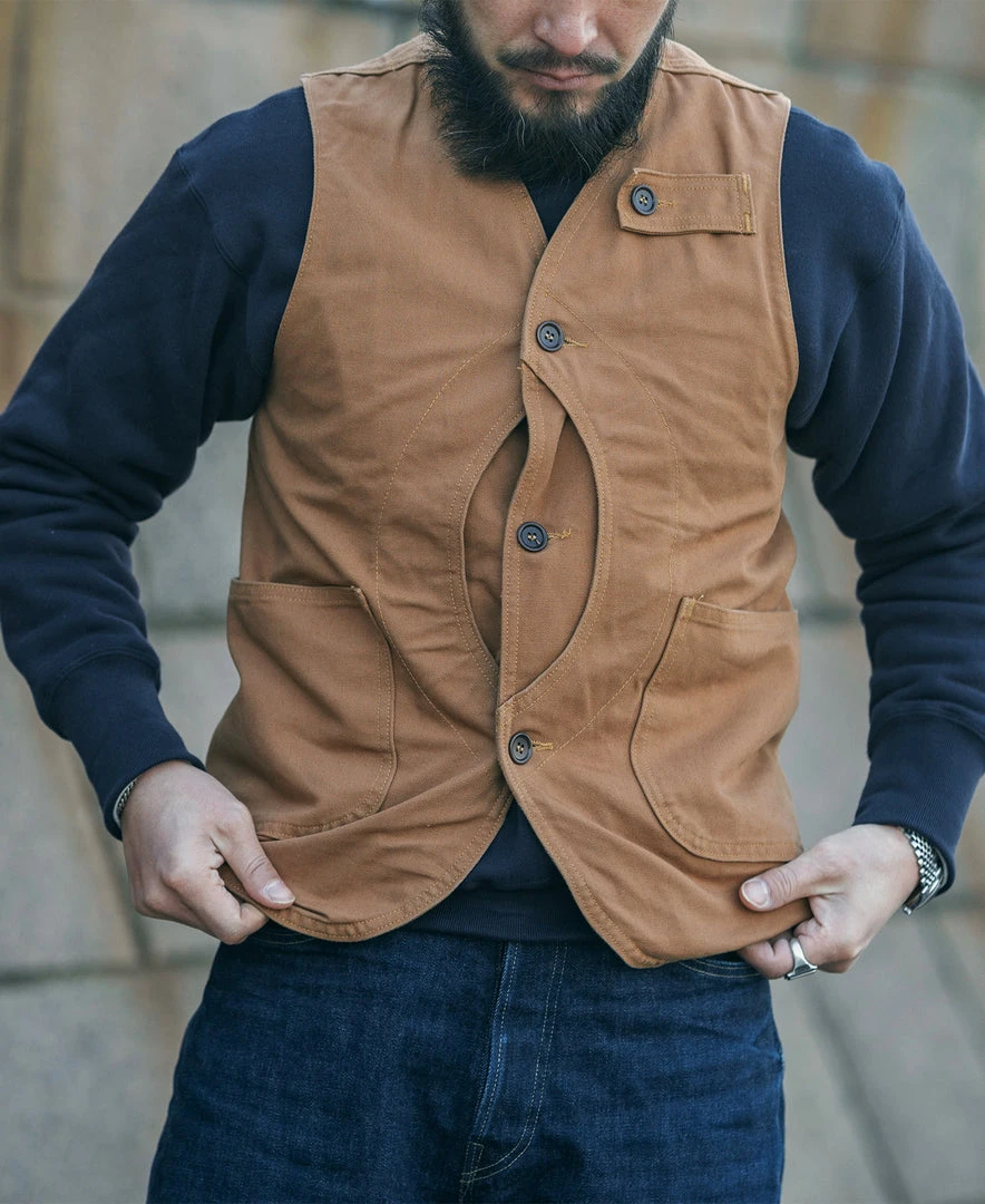 The prototype of this vest is taken from the 1930’s Hunting Vest. This vest is made of heavyweight 16.5 oz. canvas. It has a half-curved pocket called “Game Pocket”. It is a hidden mezzanine, which can be used as a storage bag for daily use and is readily available, not easy to lose things. There are two pockets on the back for easy access to items. A horizontal strap is installed above the chest to fix the fishing rod and hook. In addition to being used by hunters and fishers, it was once a classic middle-class outdoor costume.