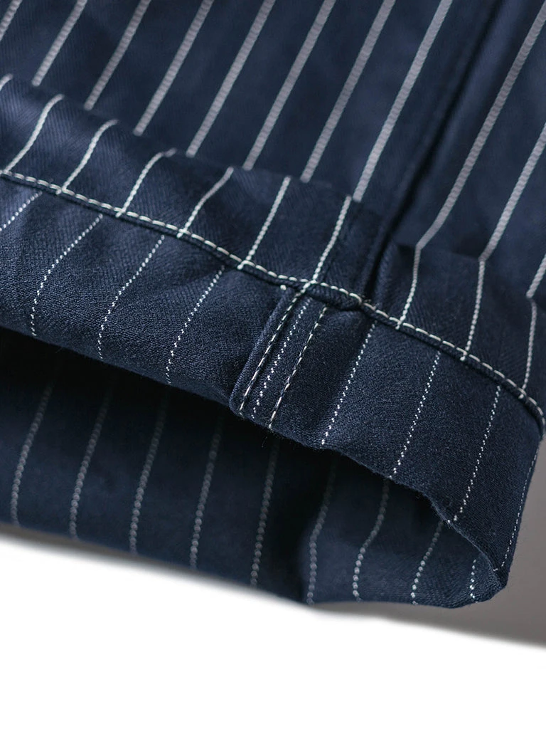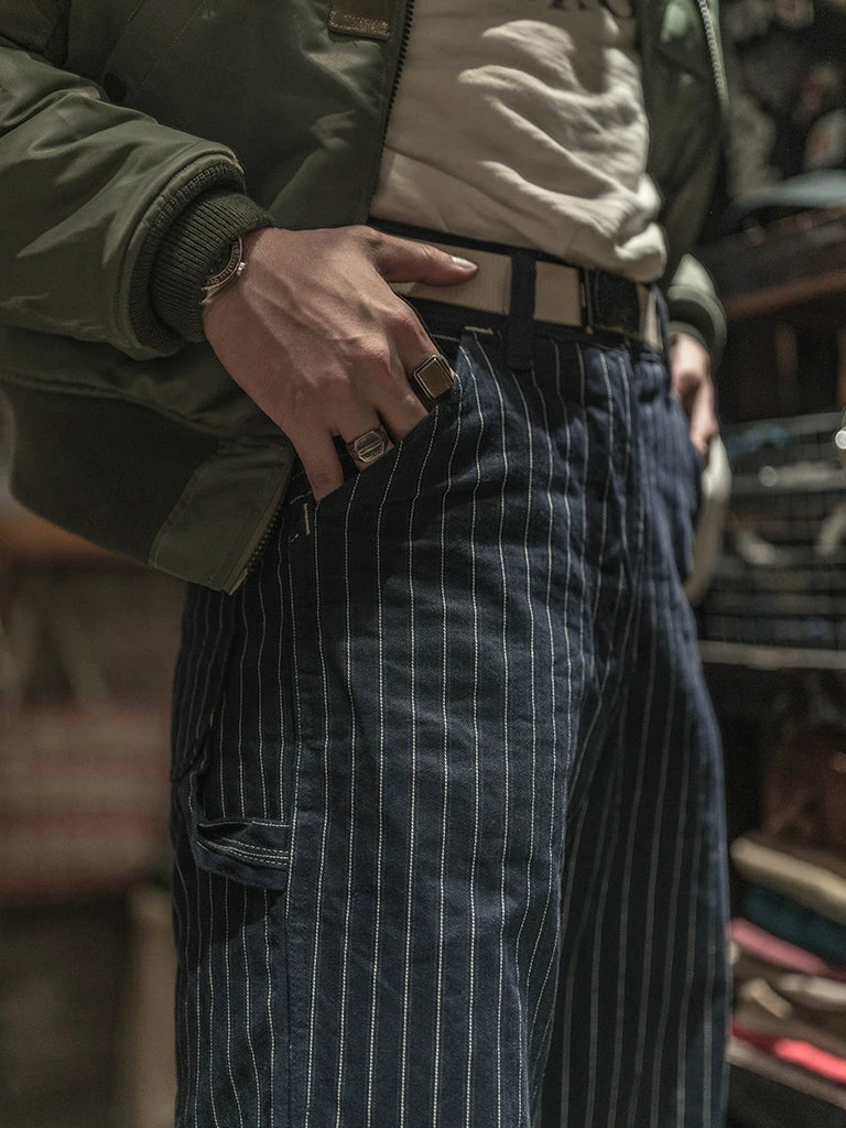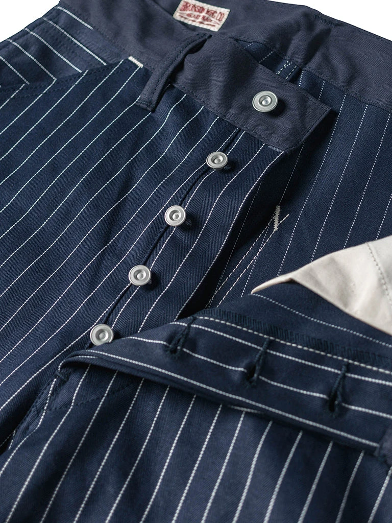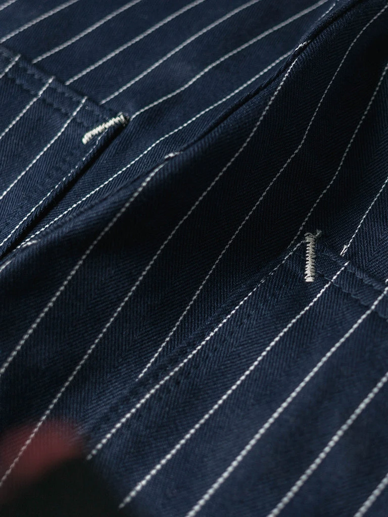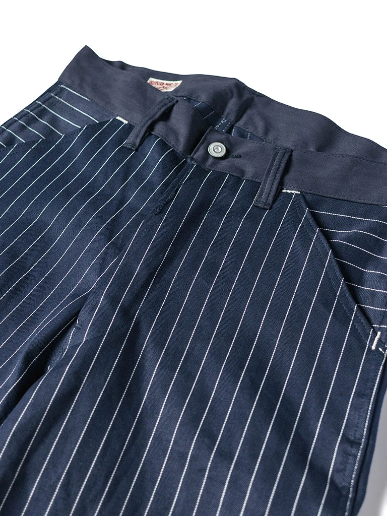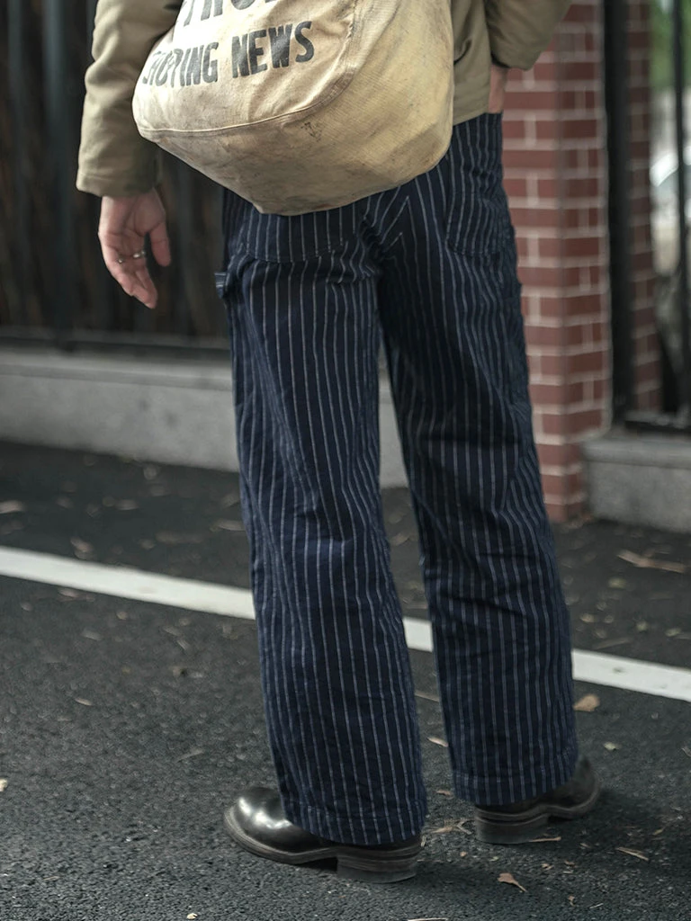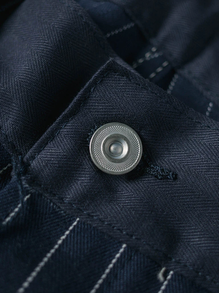 Based on 1950s split work pants, they are widely used by carpenters, railroad workers, and other types of mechanical maintenance workers. The pants are custom-made in 10.5 oz yarn-dyed herringbone twill (HBT) fabric, restoring the texture of the original.