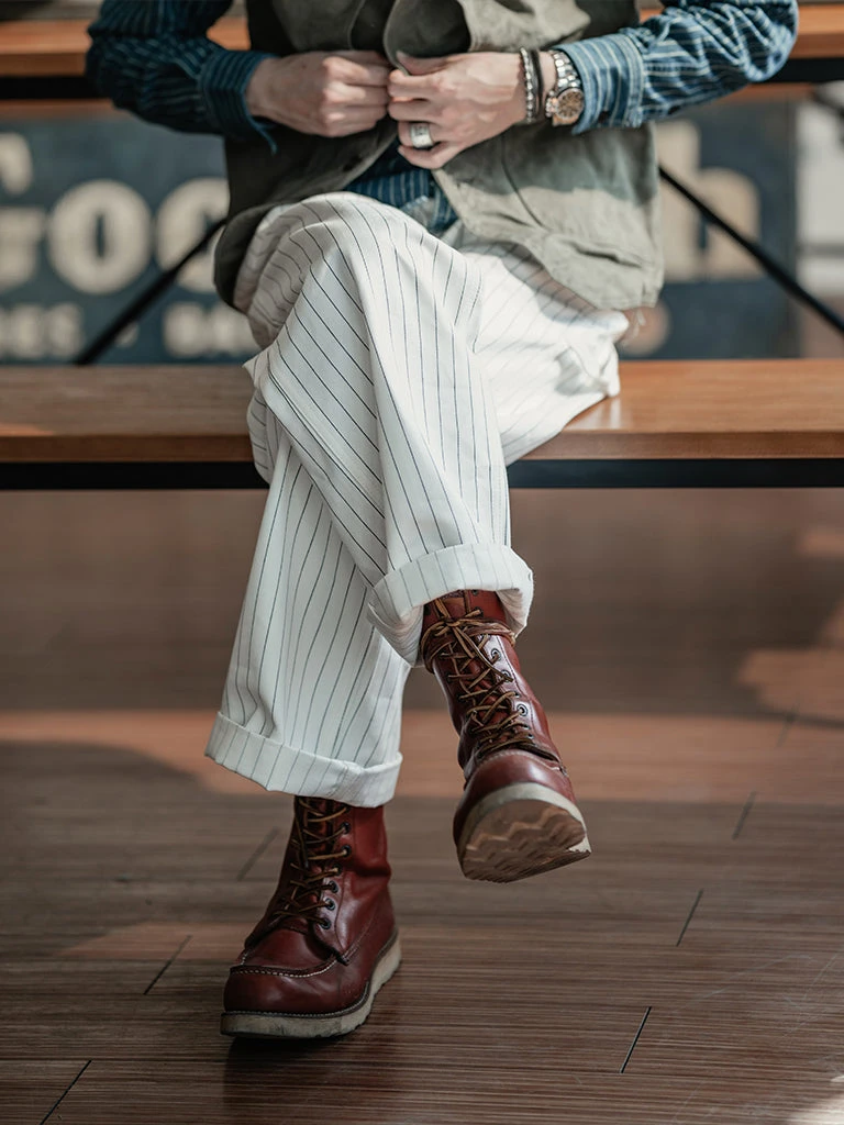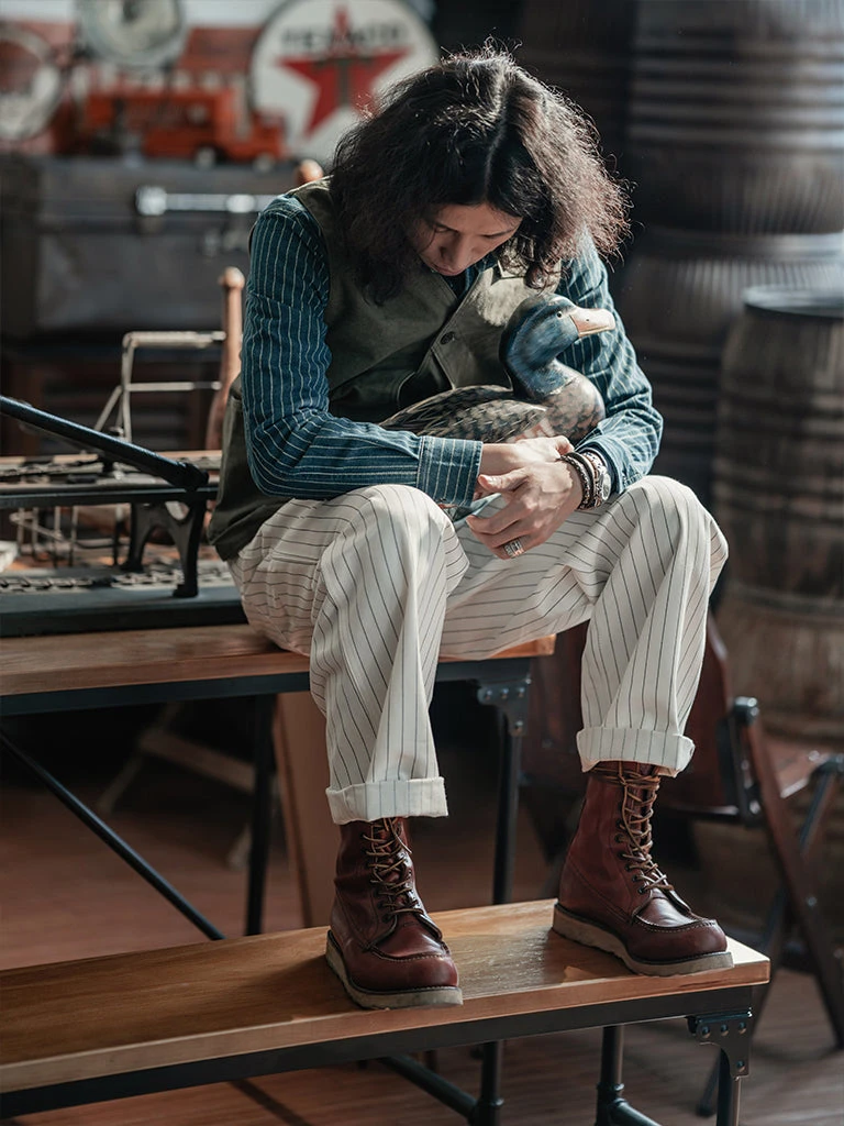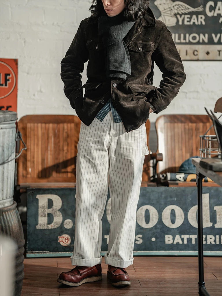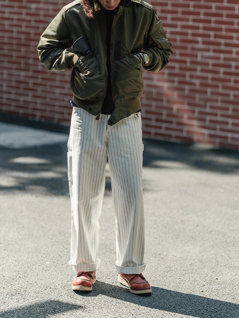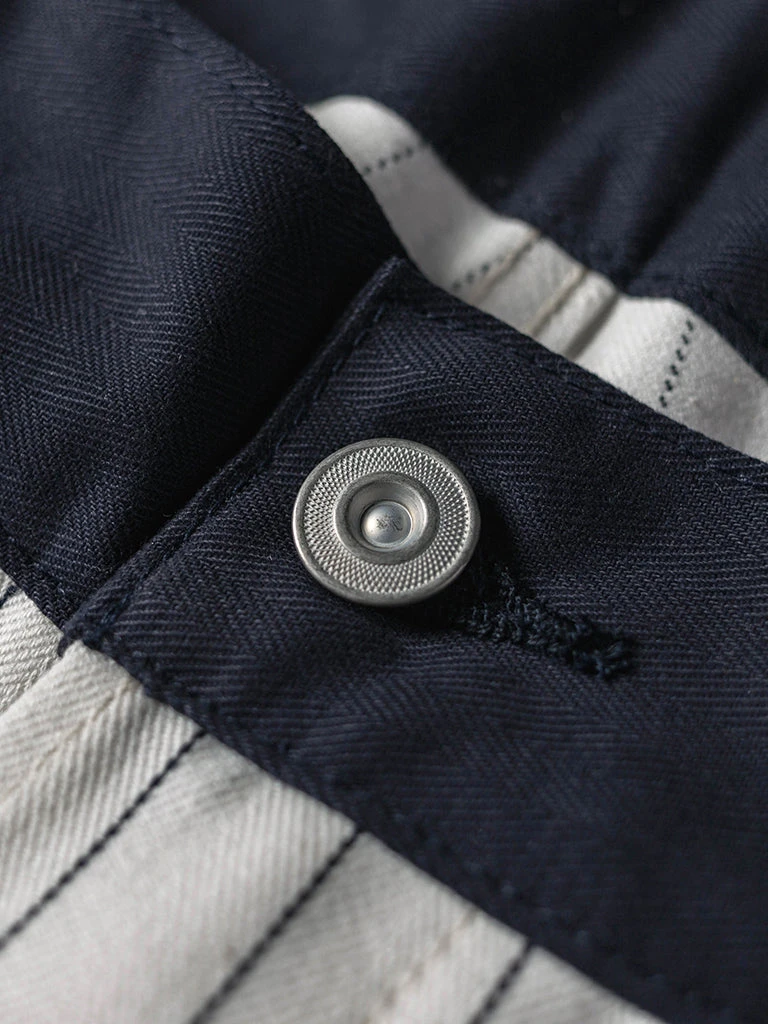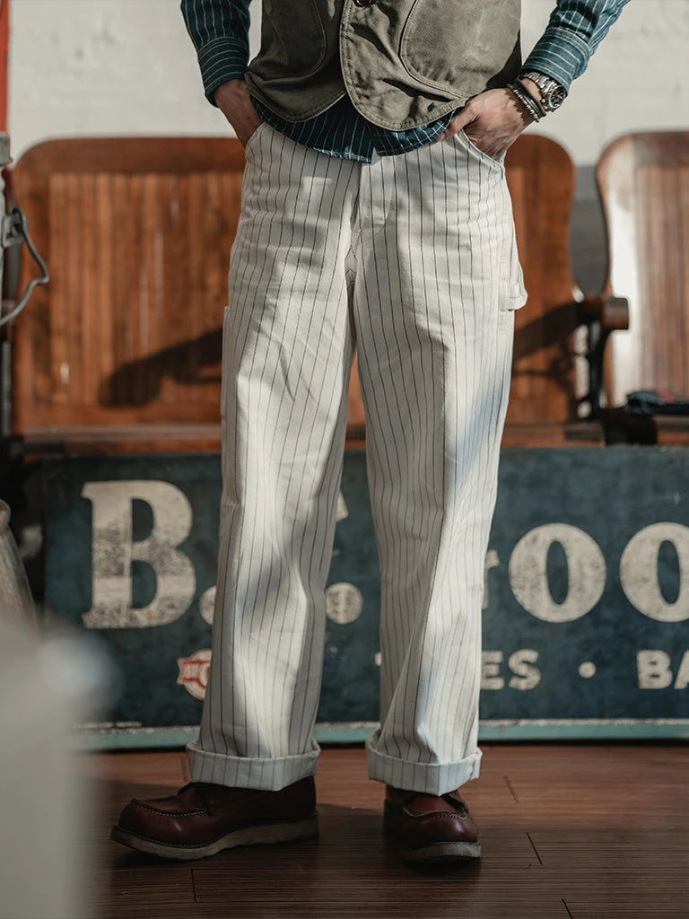 Based on 1950s split work pants, they are widely used by carpenters, railroad workers, and other types of mechanical maintenance workers. The pants are custom-made in 10.5 oz yarn-dyed herringbone twill (HBT) fabric, restoring the texture of the original.