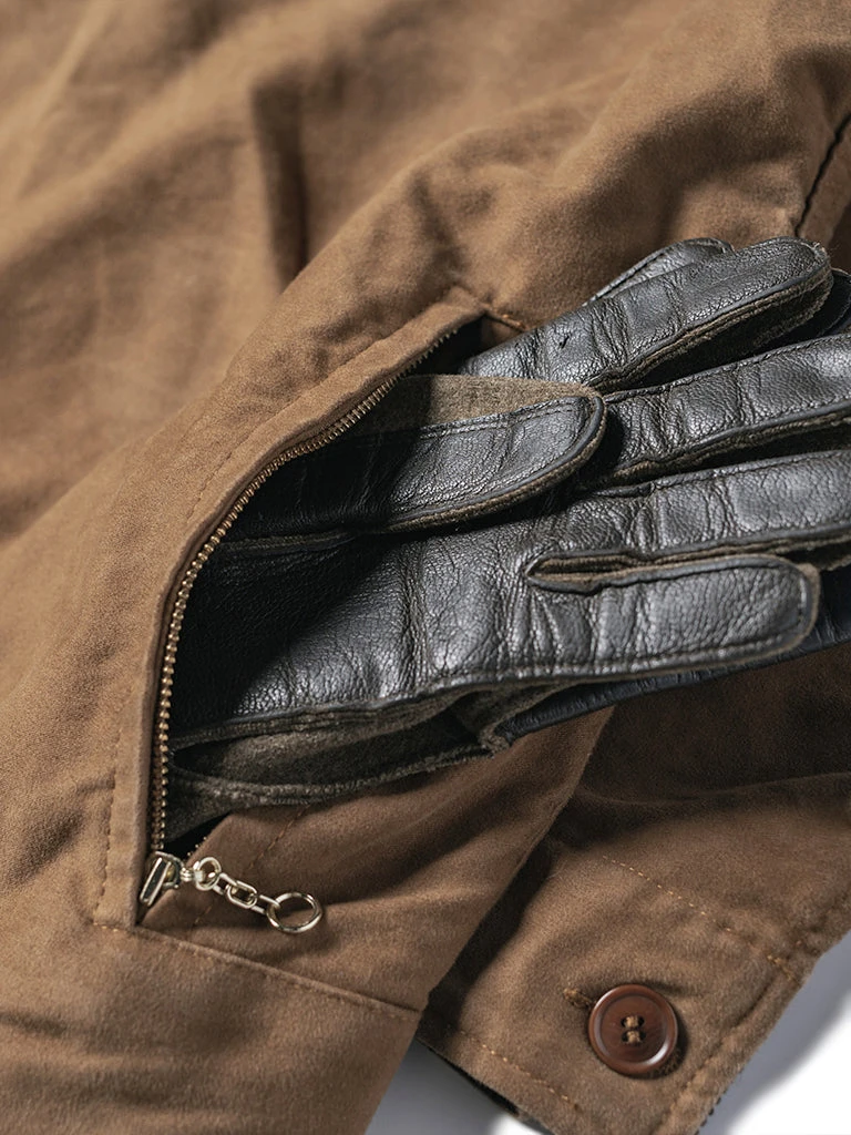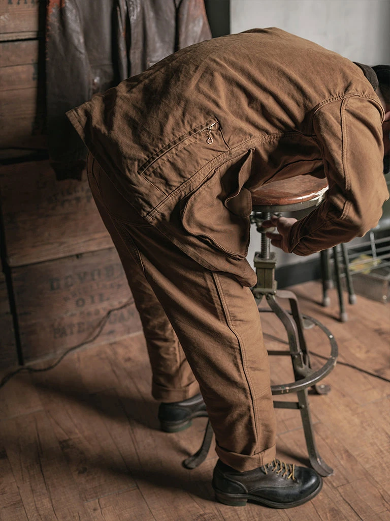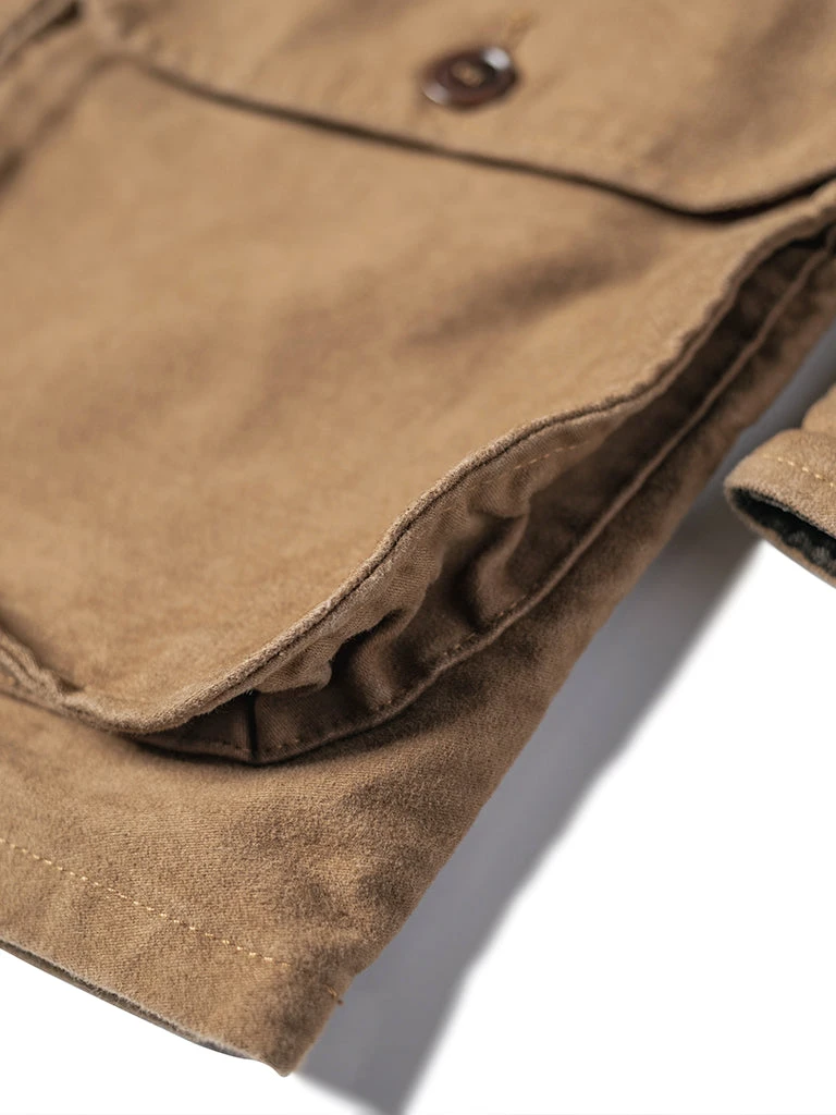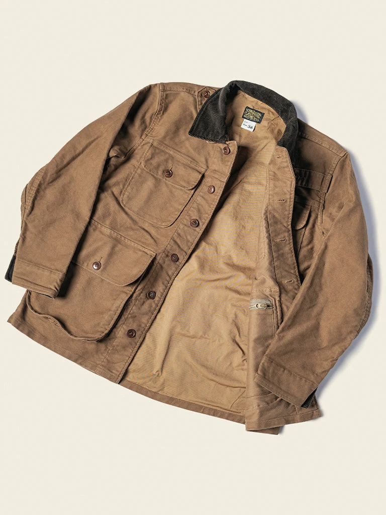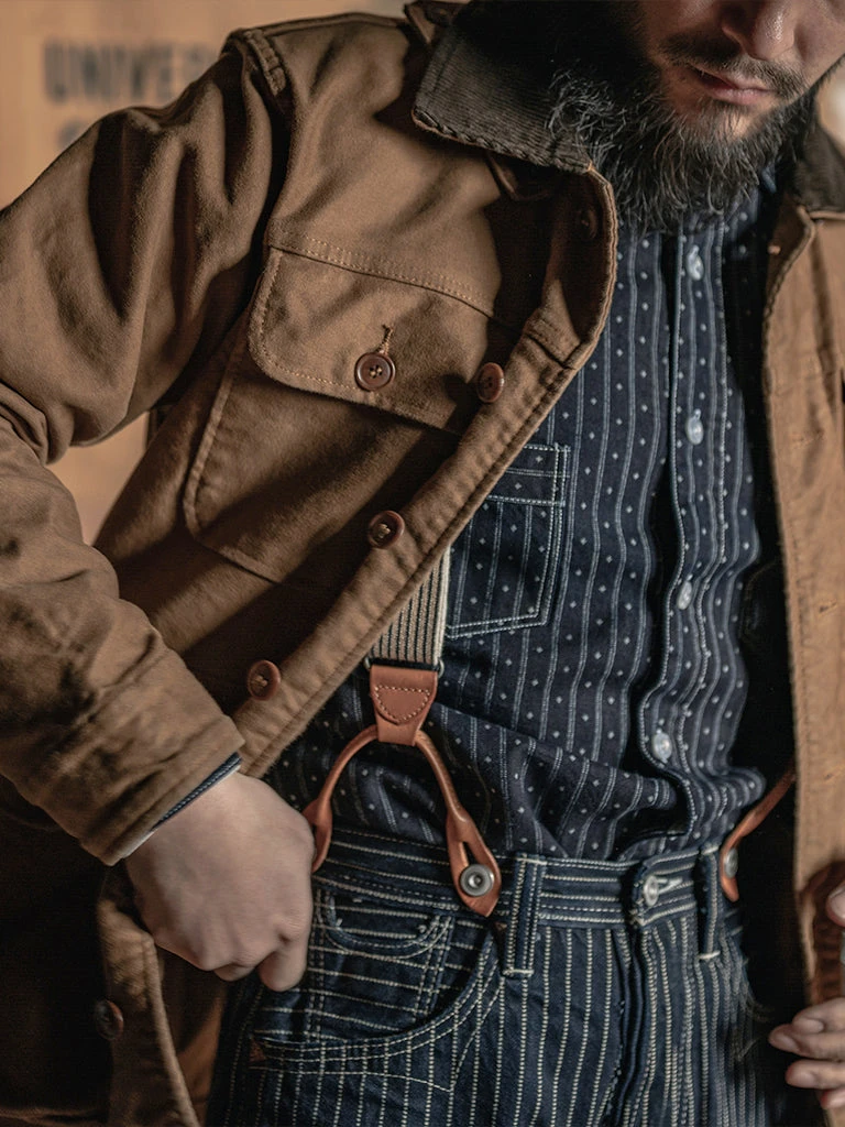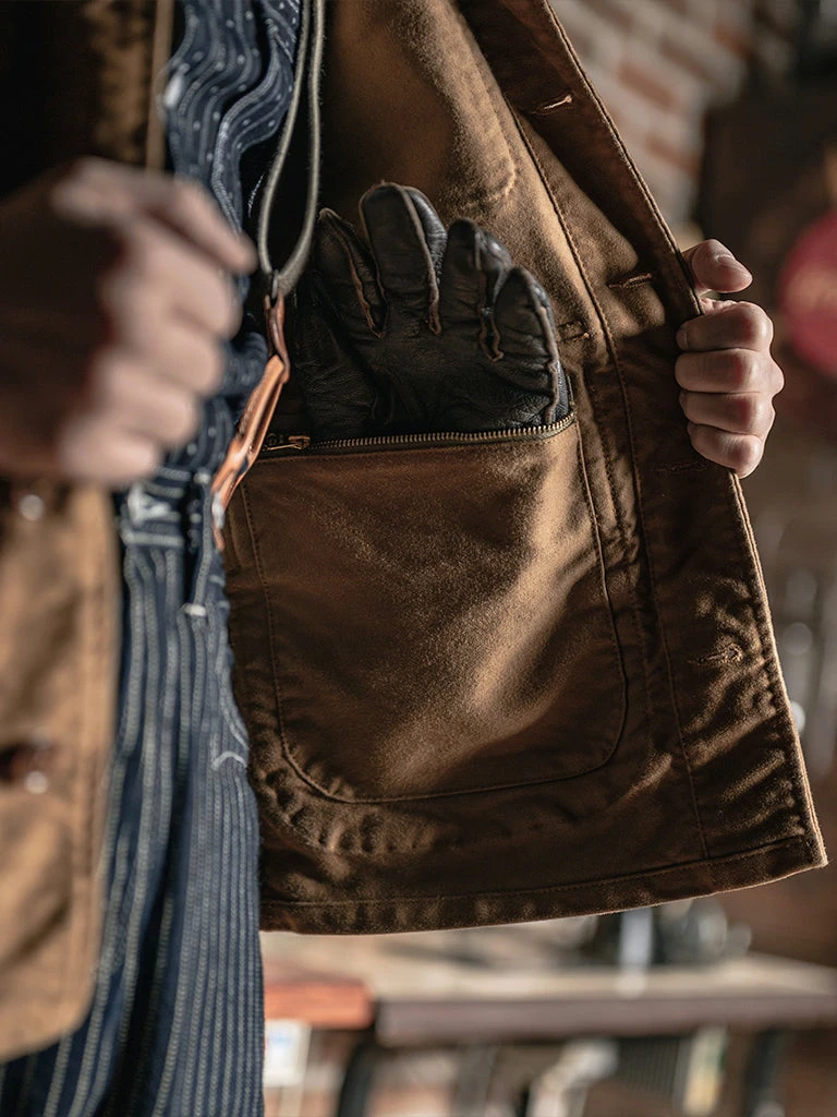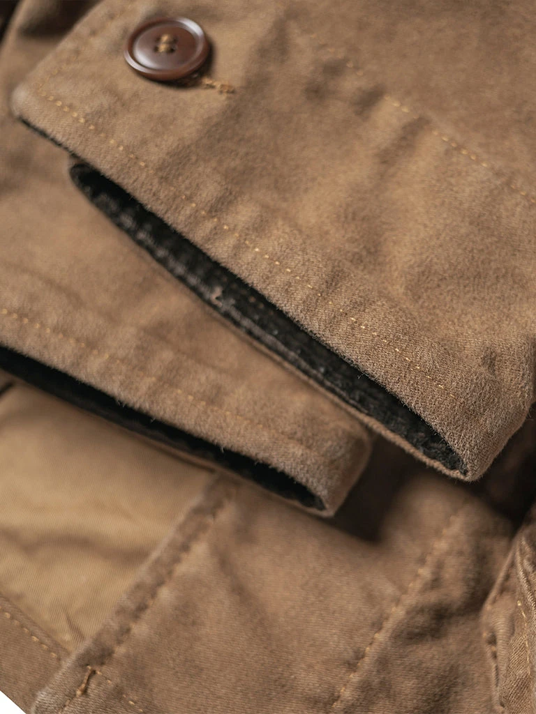 The prototype of this jacket is the Warden Jacket. It is made of heavyweight moleskin, this fabric began in the 1930 ‘s Europe, see more in French workwear, this is a special kind of satin fabric, after grinding hair treatment, the surface will appear similar to the fur of delicate texture, therefore, commonly known as “moleskin”, we customized this fabric, hope to you feel its difference.