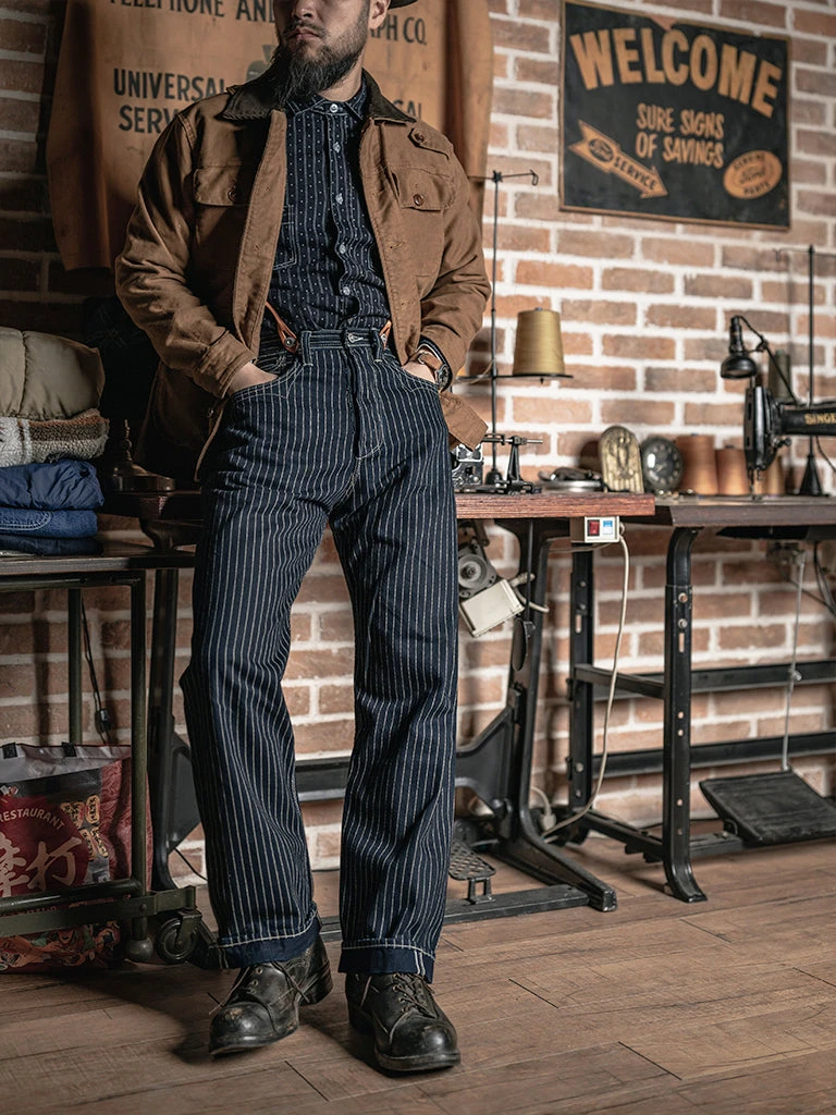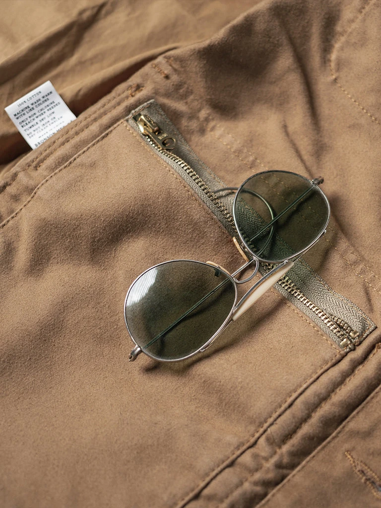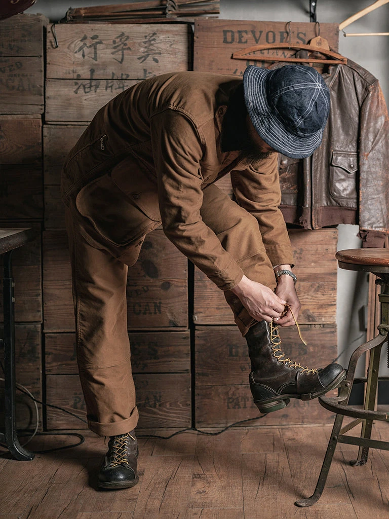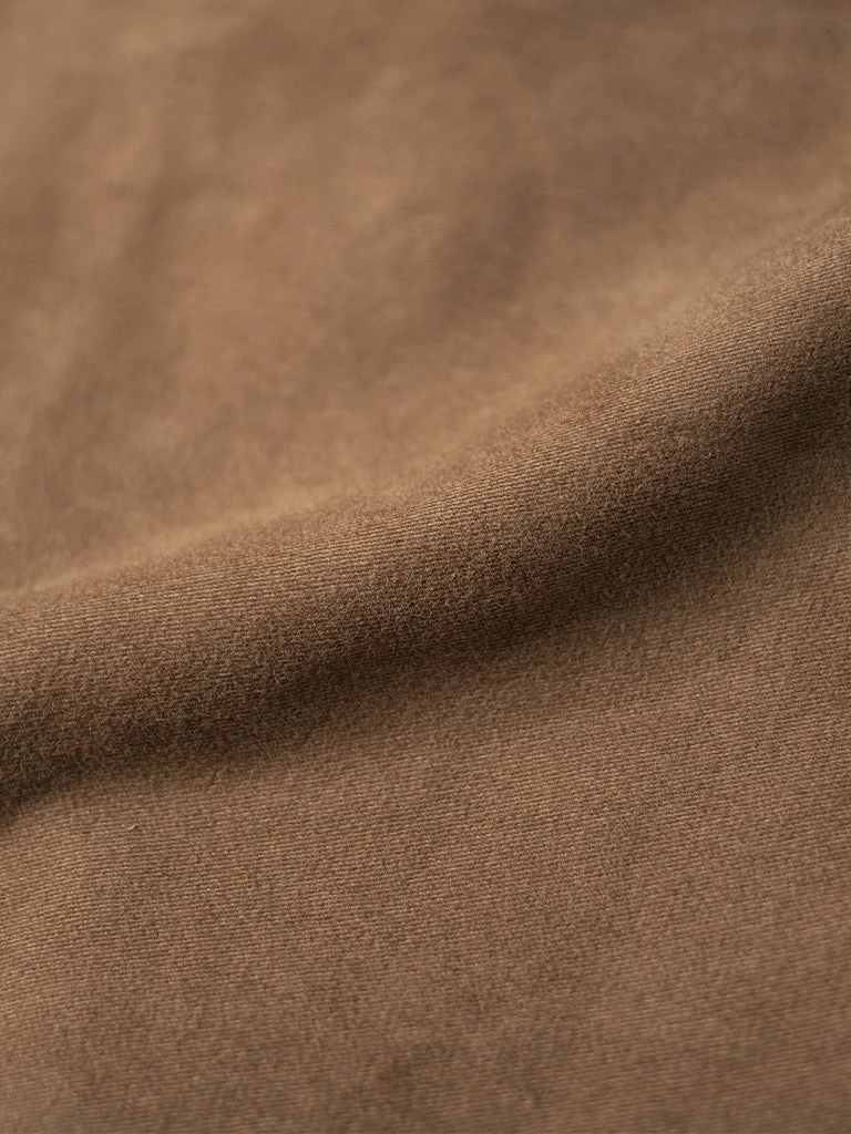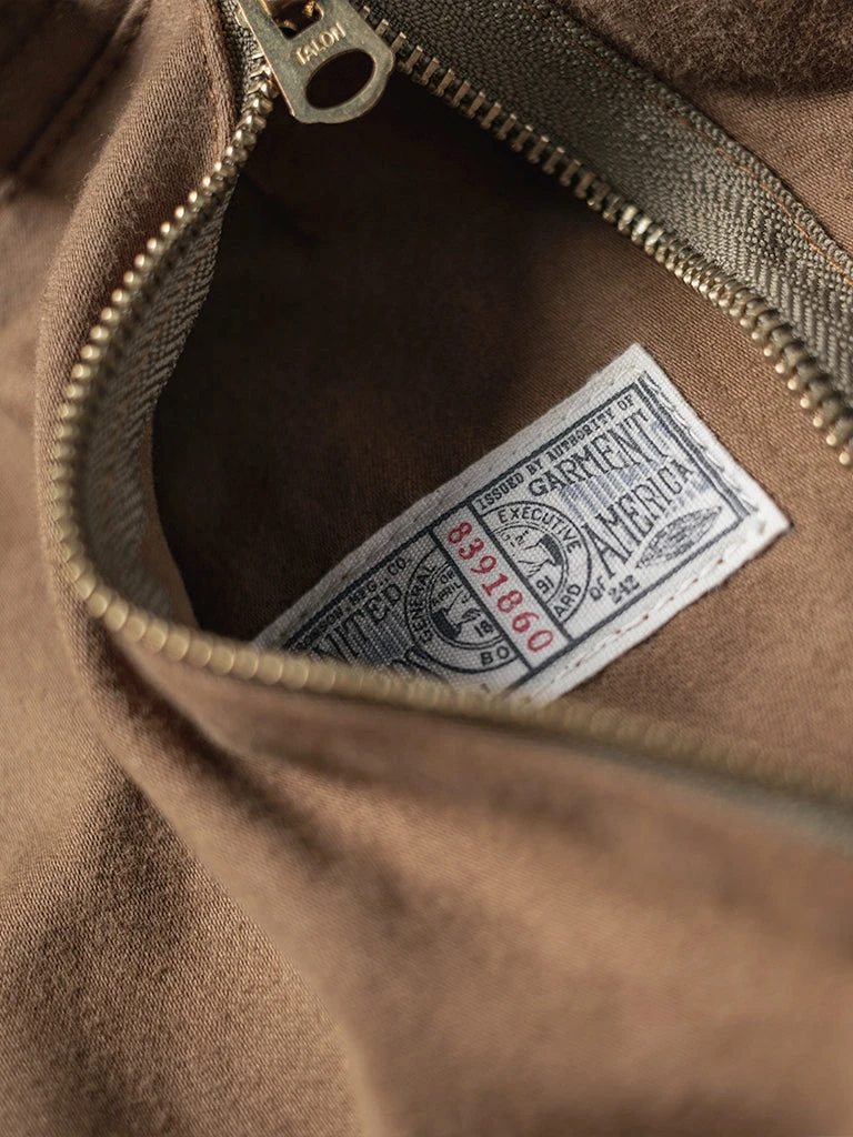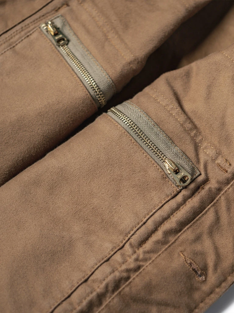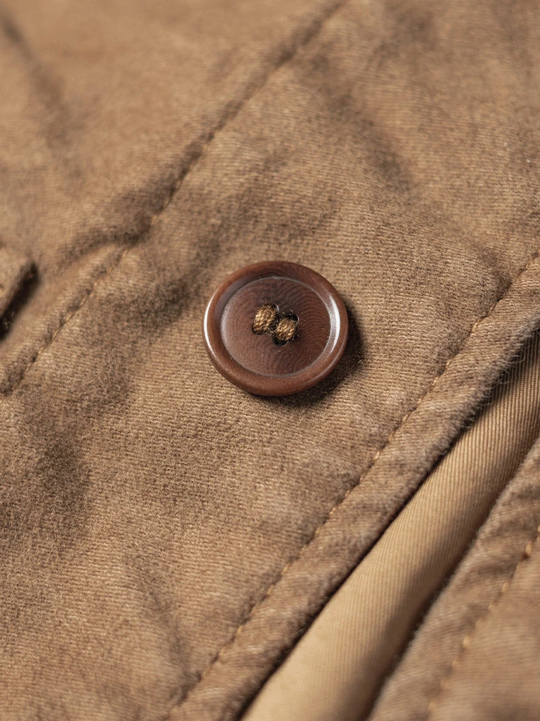 The prototype of this jacket is the Warden Jacket. It is made of heavyweight moleskin, this fabric began in the 1930 ‘s Europe, see more in French workwear, this is a special kind of satin fabric, after grinding hair treatment, the surface will appear similar to the fur of delicate texture, therefore, commonly known as “moleskin”, we customized this fabric, hope to you feel its difference.