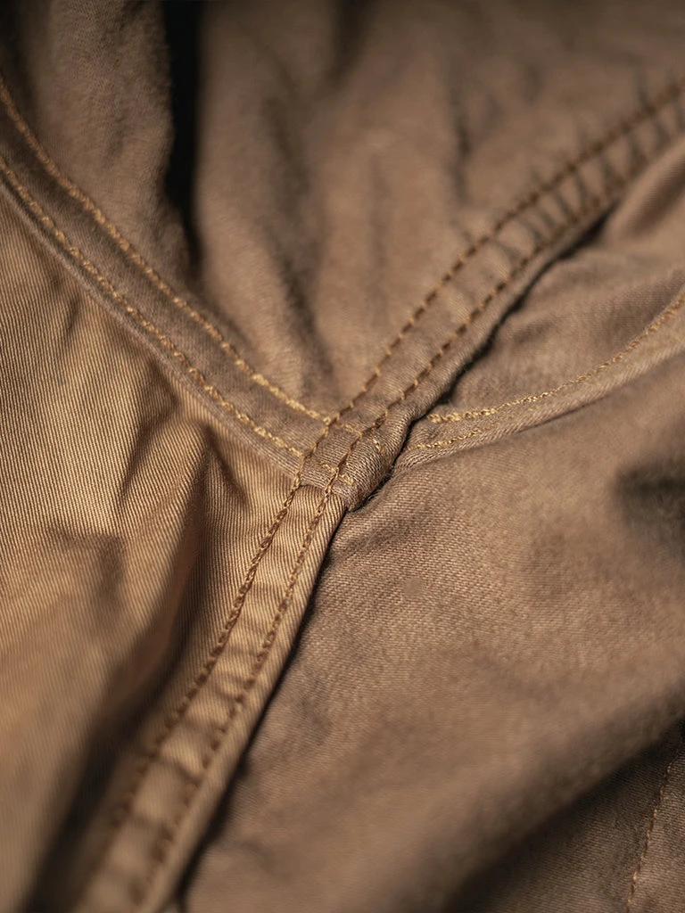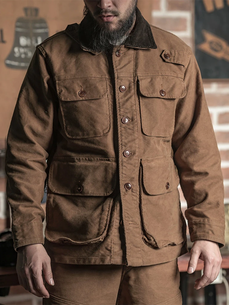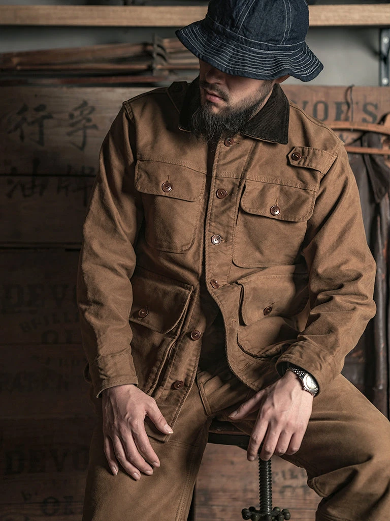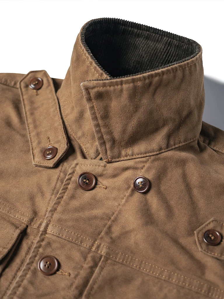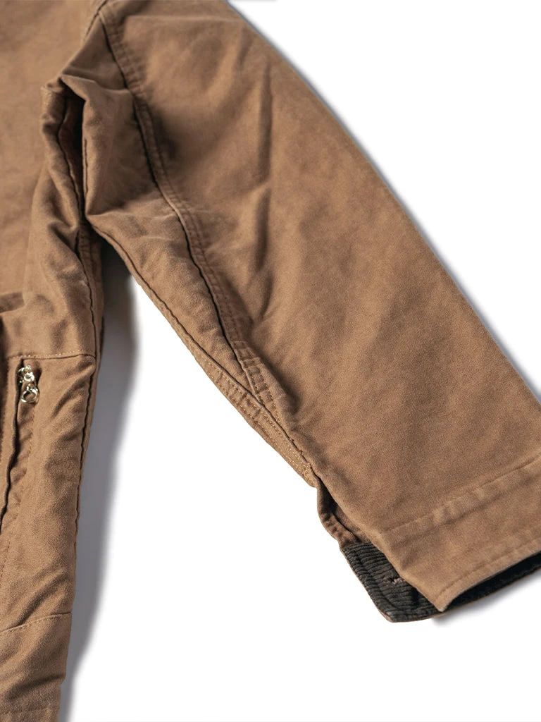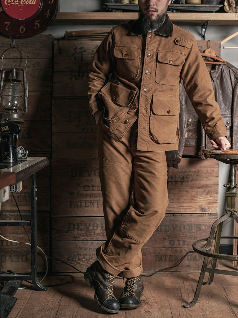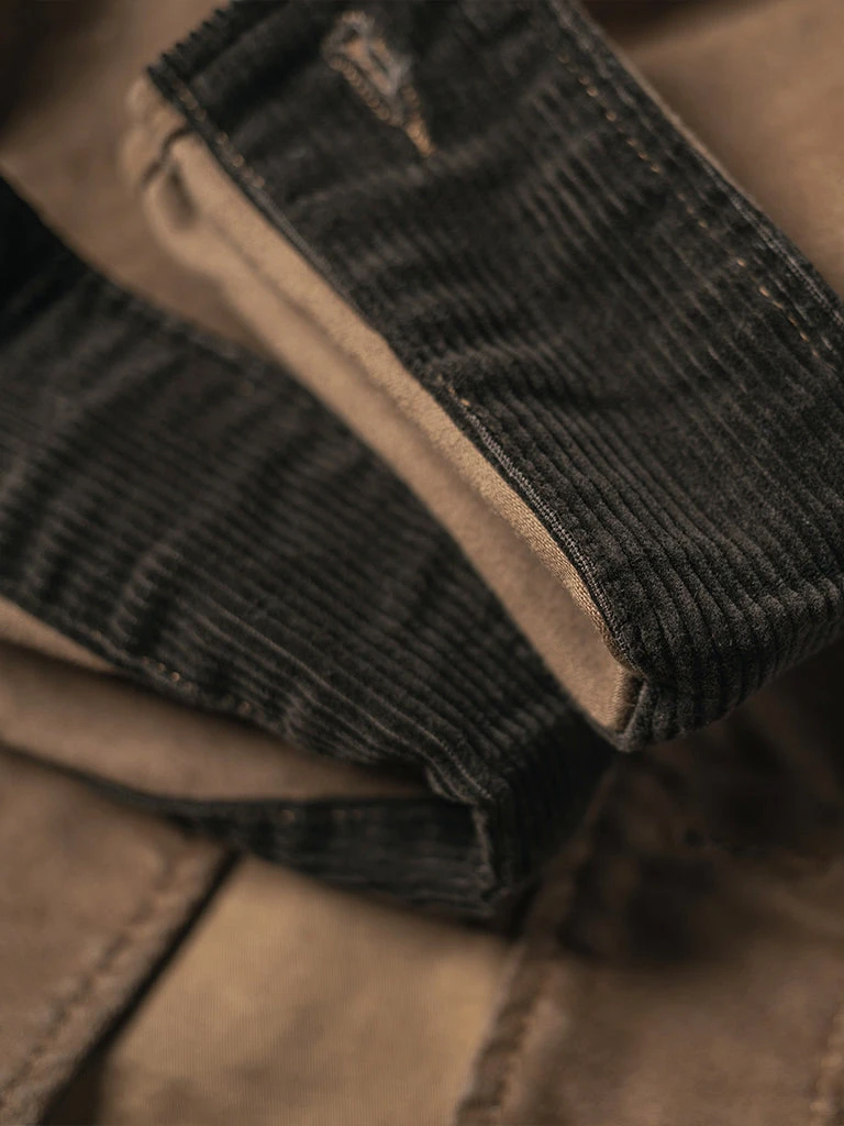 The jacket collar and cuffs are 17.6 oz heavyweight corduroy, to strengthen the visual effects, warmth retention properties are promoted. The chest has two patch pockets, below has two stereo pockets, capacity is big enough, inside also has two zippered pockets. There is a hidden pocket on the back, that can hold a map or light tools, and is closed by a zipper. In addition, the front part has a cloth piece that can close the neck and is usually placed on the neck side. Classic work jacket cut, simple appearance, and practical Settings show the simplicity and wisdom of retro workwear.