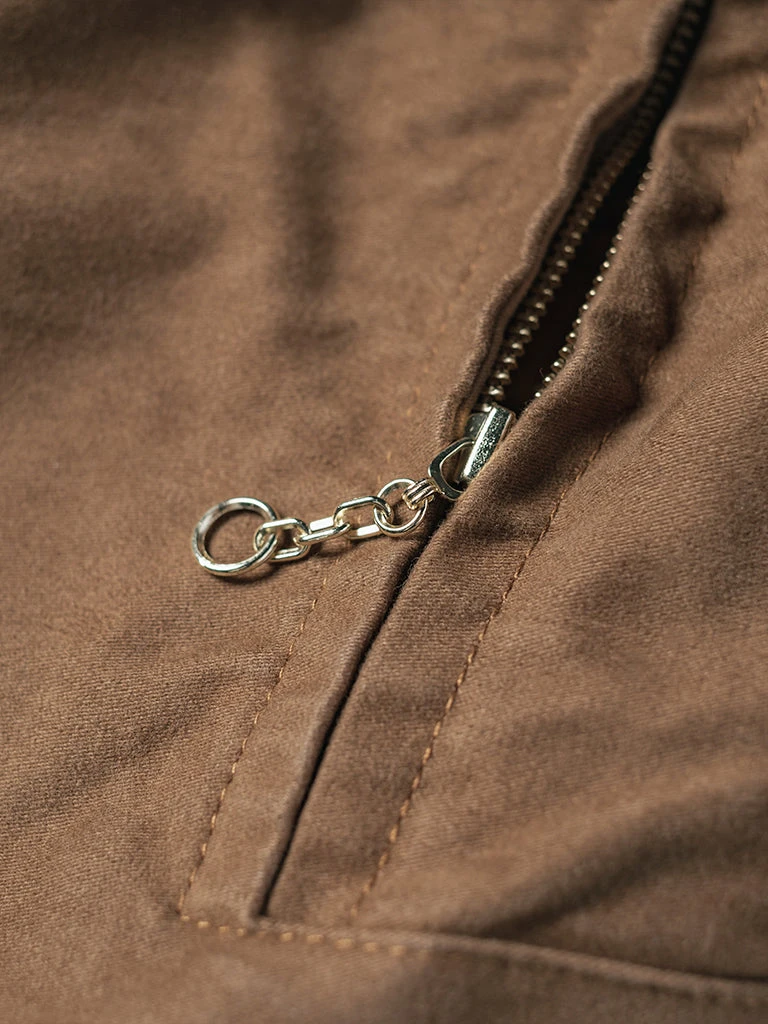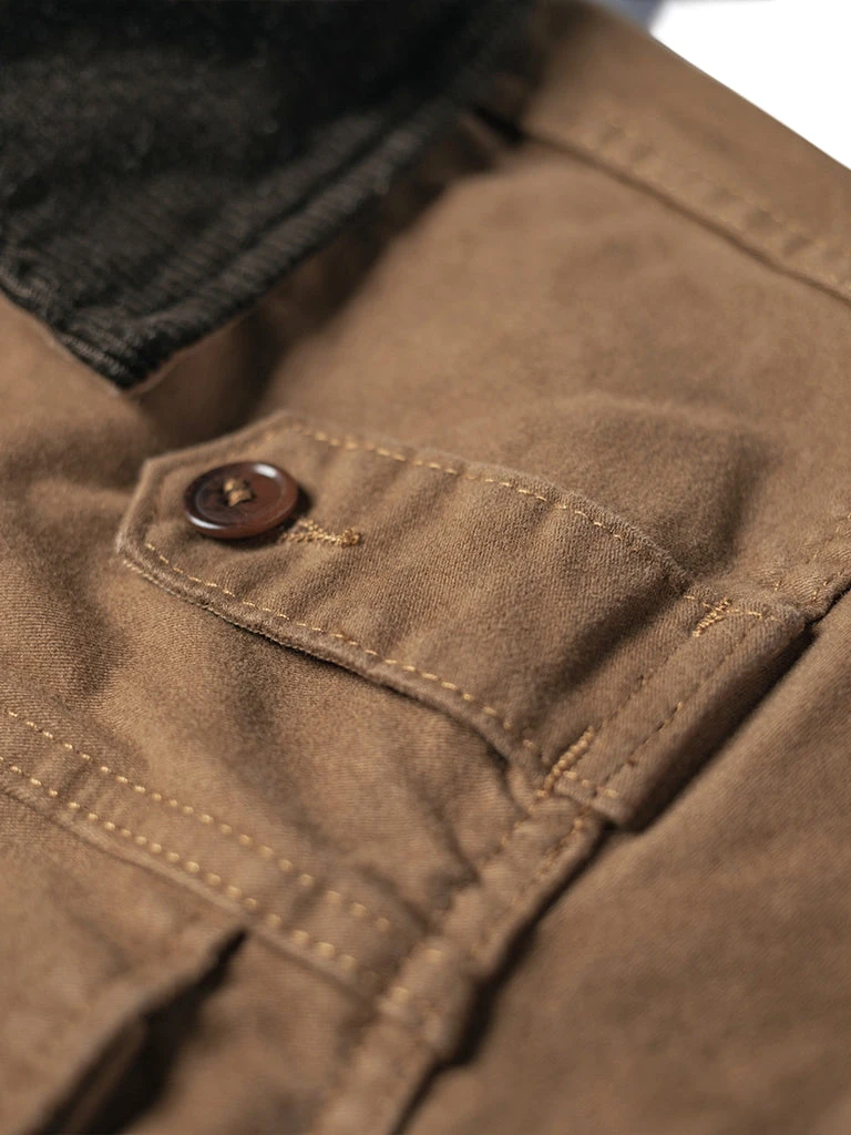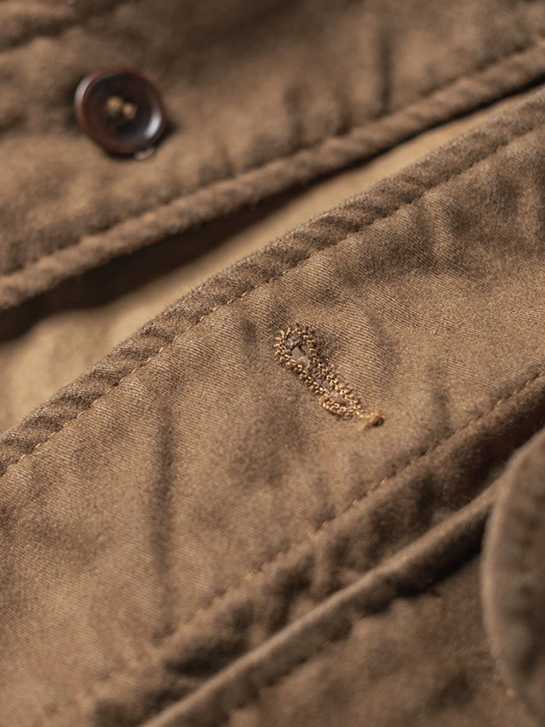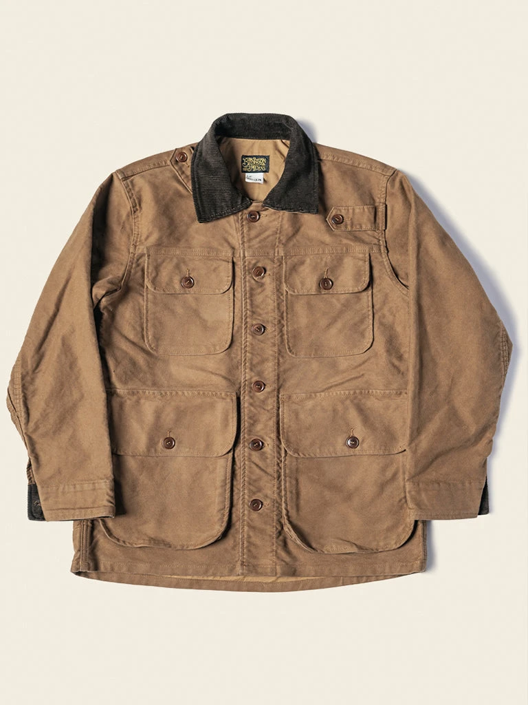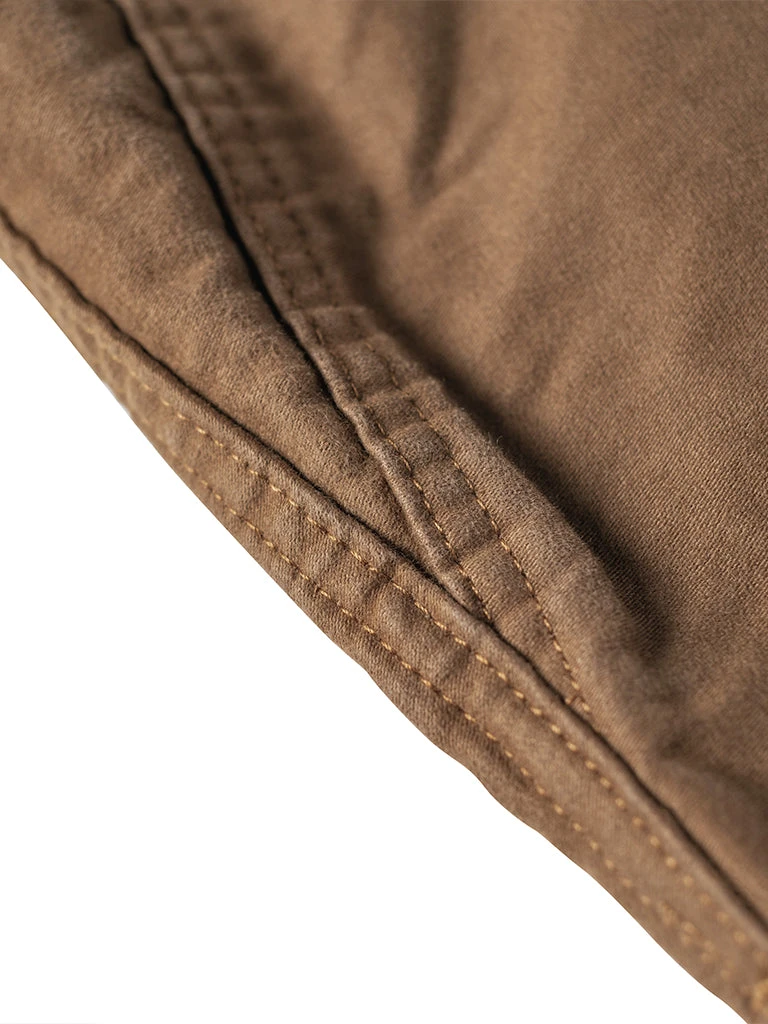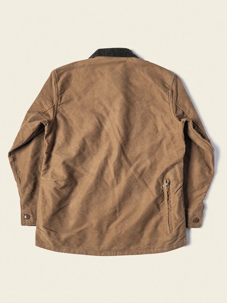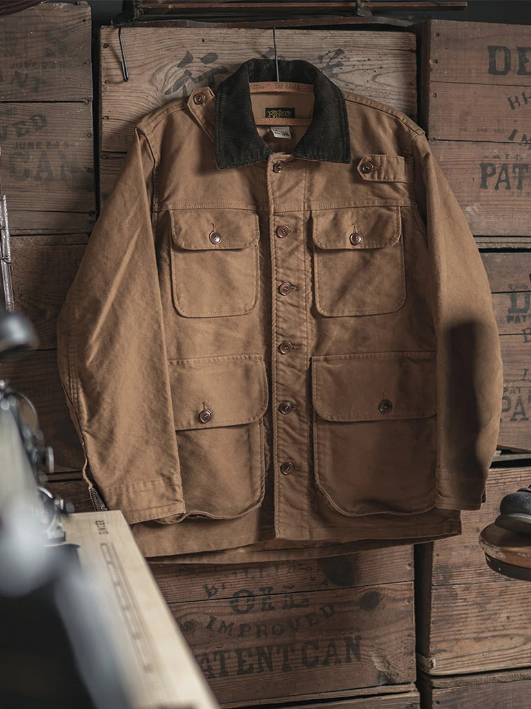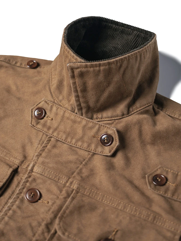 The jacket collar and cuffs are 17.6 oz heavyweight corduroy, to strengthen the visual effects, warmth retention properties are promoted. The chest has two patch pockets, below has two stereo pockets, capacity is big enough, inside also has two zippered pockets. There is a hidden pocket on the back, that can hold a map or light tools, and is closed by a zipper. In addition, the front part has a cloth piece that can close the neck and is usually placed on the neck side. Classic work jacket cut, simple appearance, and practical Settings show the simplicity and wisdom of retro workwear.