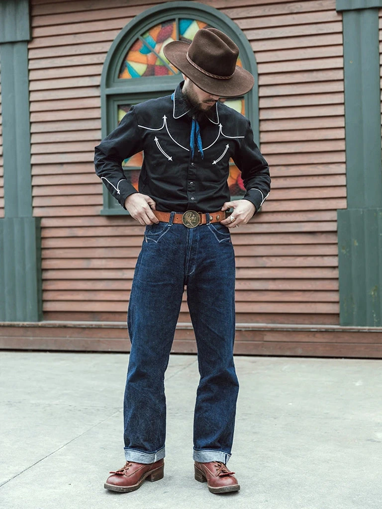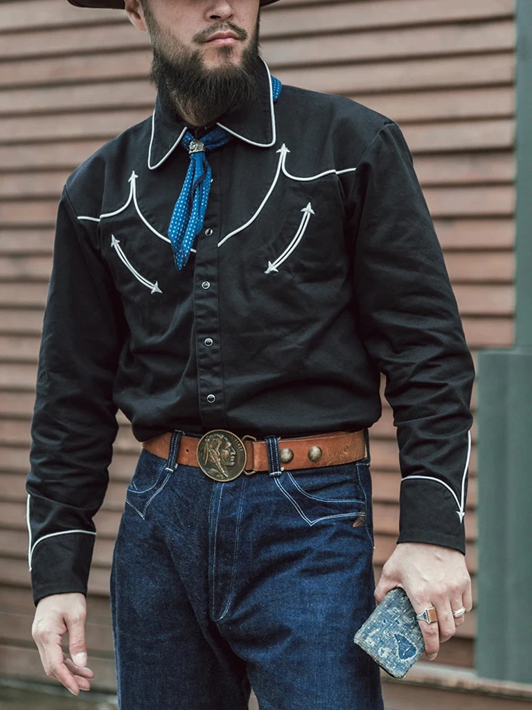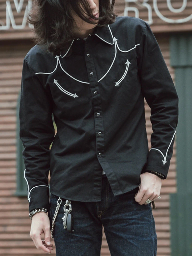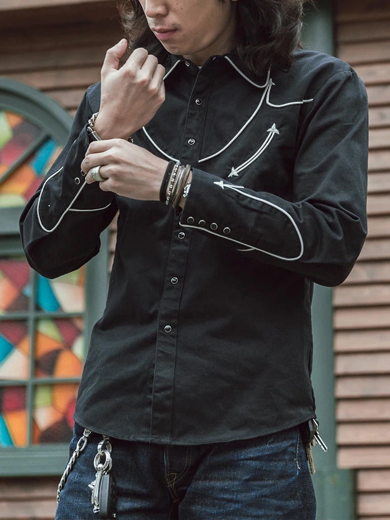 This is an American western-style shirt, showing a strong western romantic style. It is made of a 10.5 oz heavyweight cotton satin drill and retro bound seam craft.