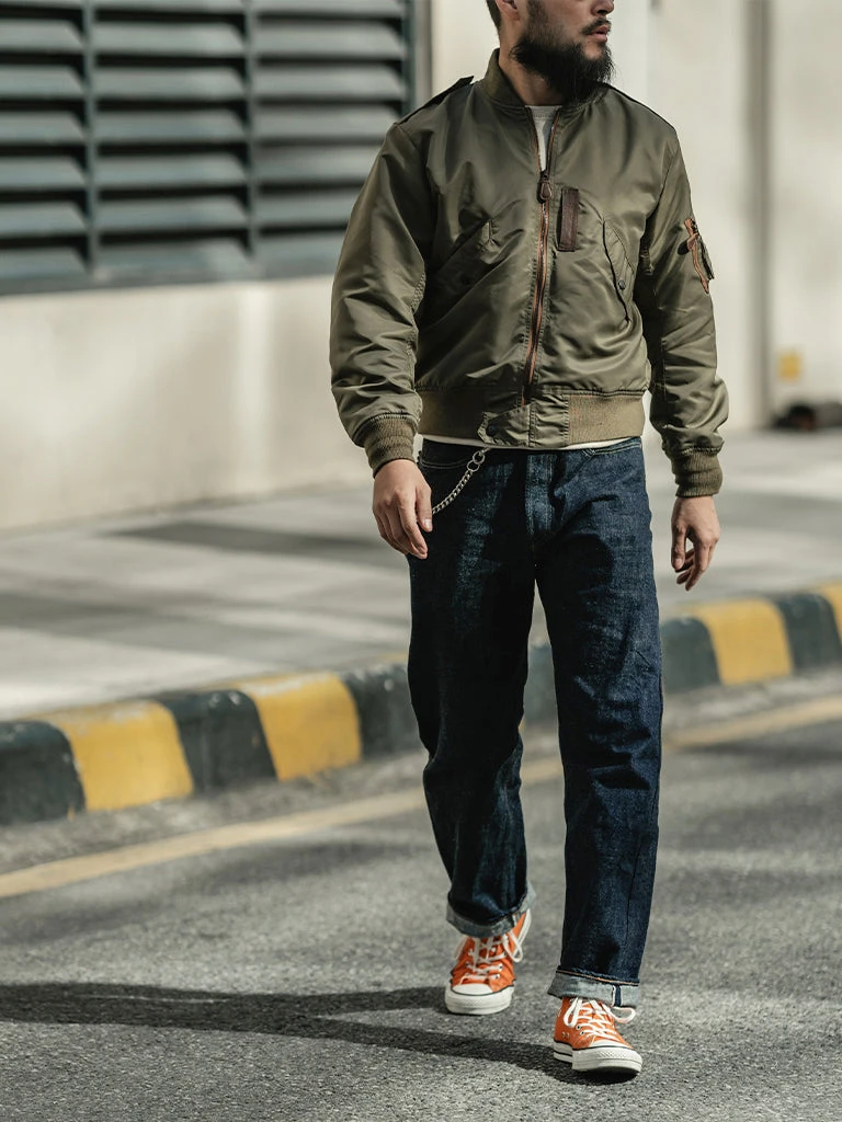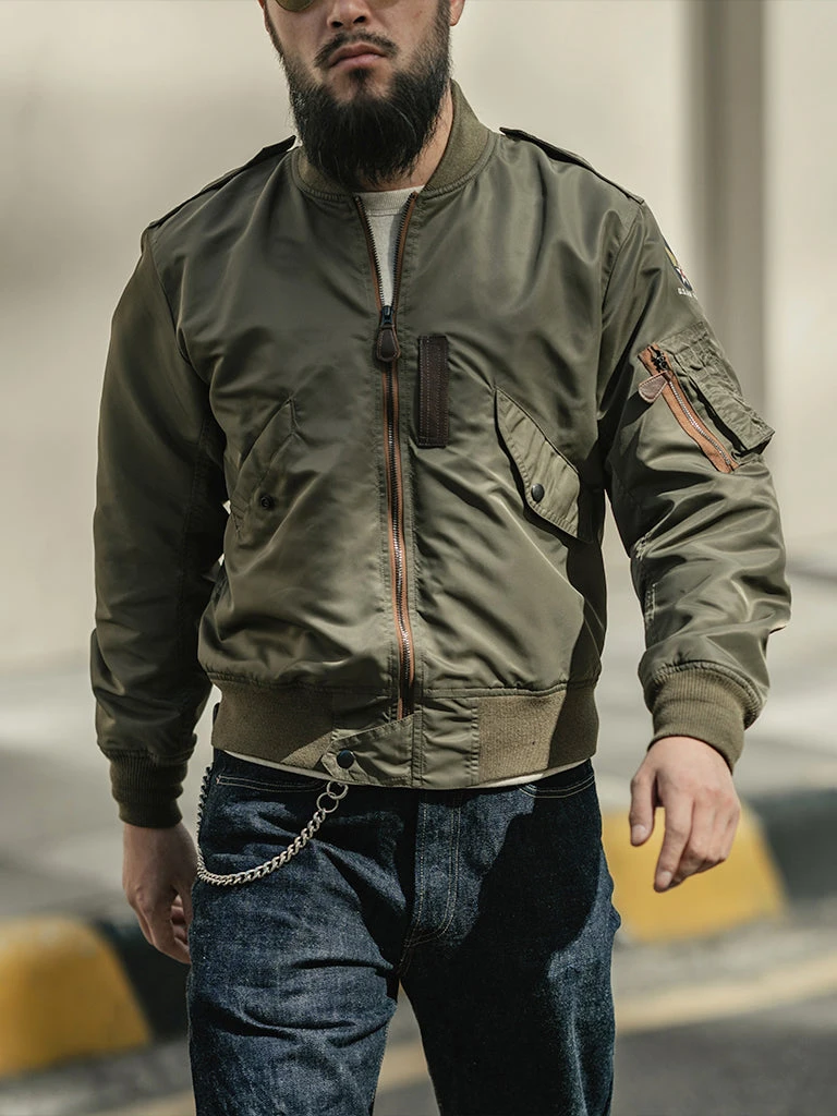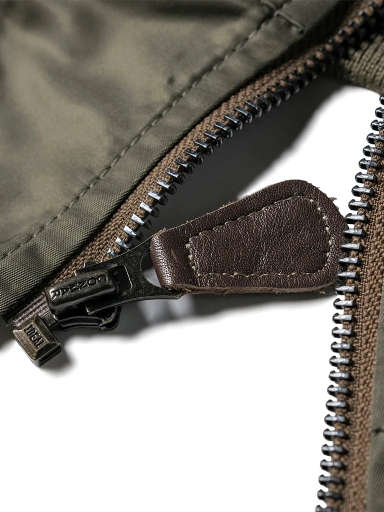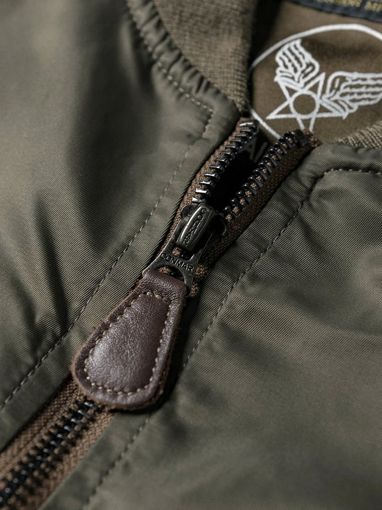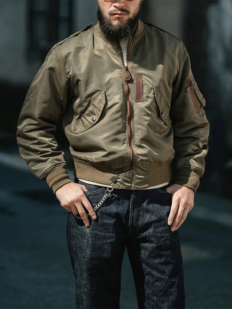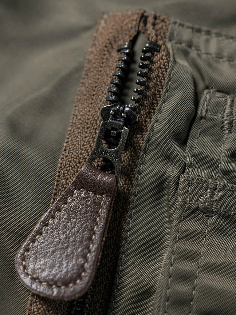Bronson L-2 Flight Jacket outer is made of double-yarn nylon with a water-repellent coating. The lining is a unique rayon/cotton blend fabric for a thick, silky feel and some warmth, similar to the original. The zippers are vintage CONMAR zippers from IDEAL. The main zipper and the sleeve zipper are copper oxide. The collar and cuff are from a wool blend(70% wool/ 30% acrylic), the cuffs are tubular and have are no-seam rib-knit cuff.