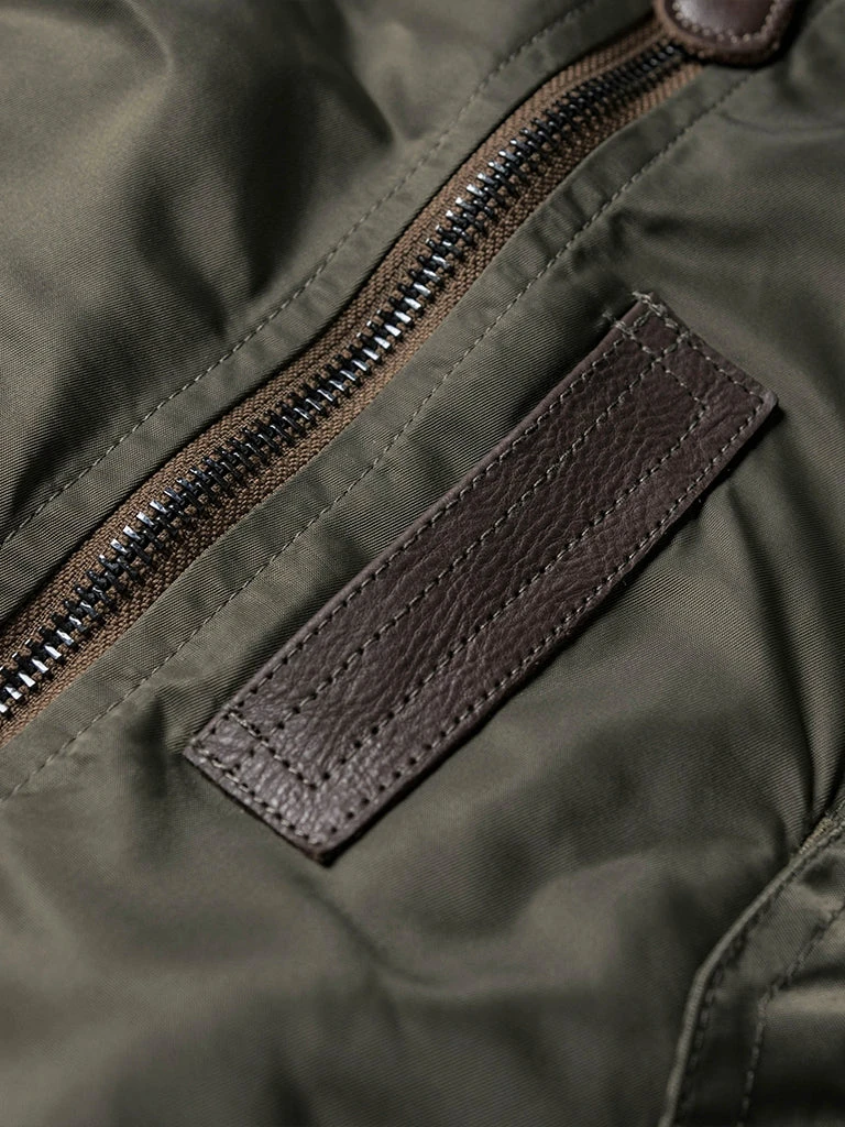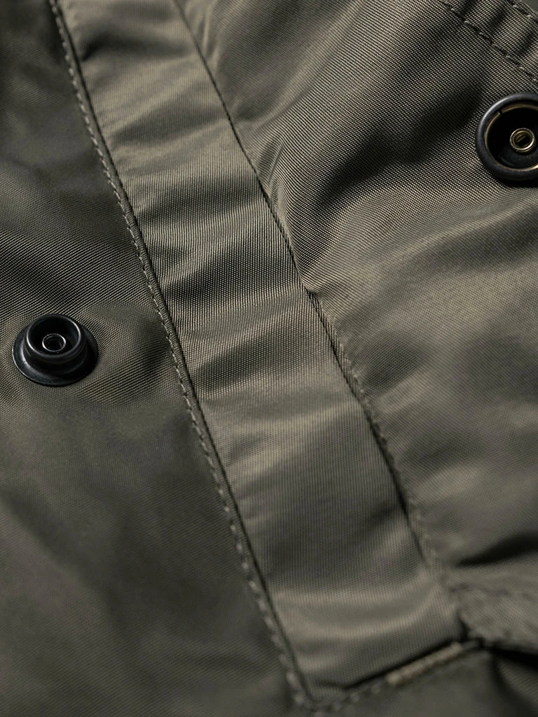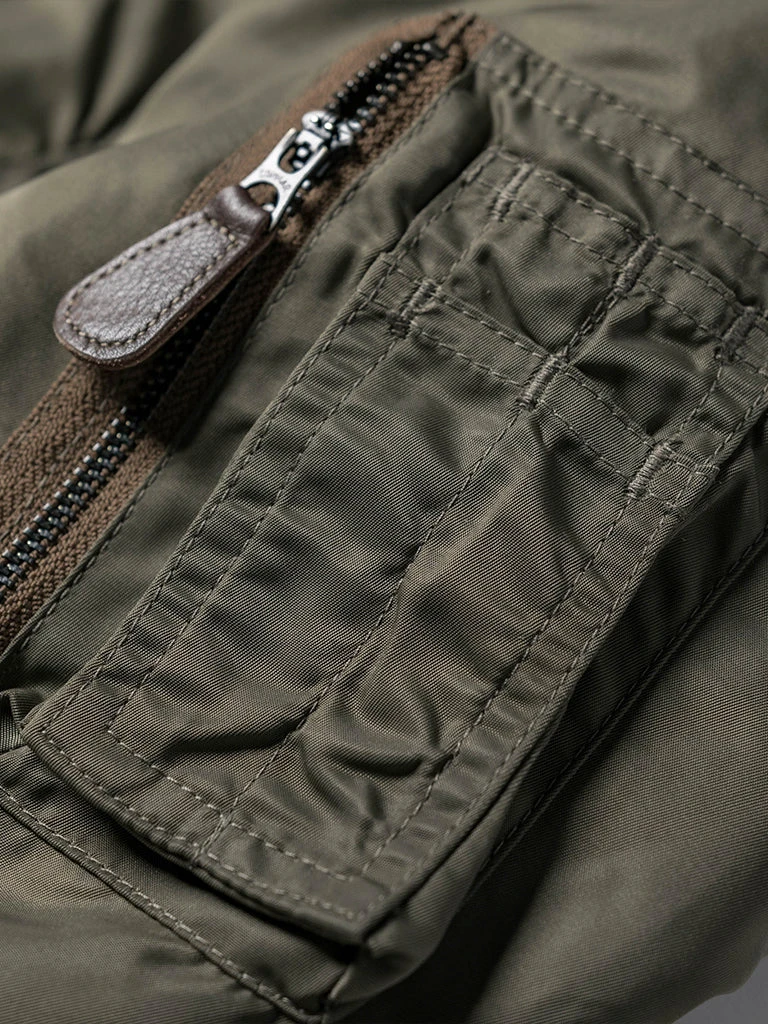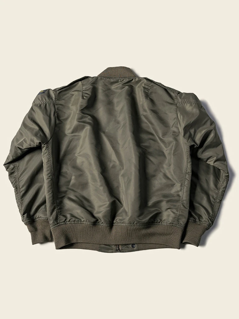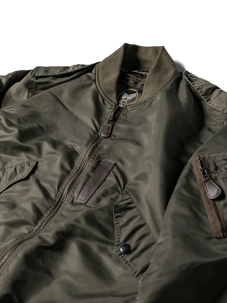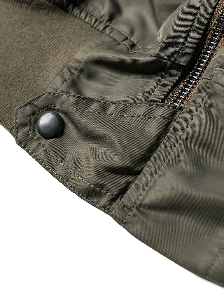 Bronson L-2 Flight Jacket outer is made of double-yarn nylon with a water-repellent coating. The lining is a unique rayon/cotton blend fabric for a thick, silky feel and some warmth, similar to the original. The zippers are vintage CONMAR zippers from IDEAL. The main zipper and the sleeve zipper are copper oxide. The collar and cuff are from a wool blend(70% wool/ 30% acrylic), the cuffs are tubular and have are no-seam rib-knit cuff.
