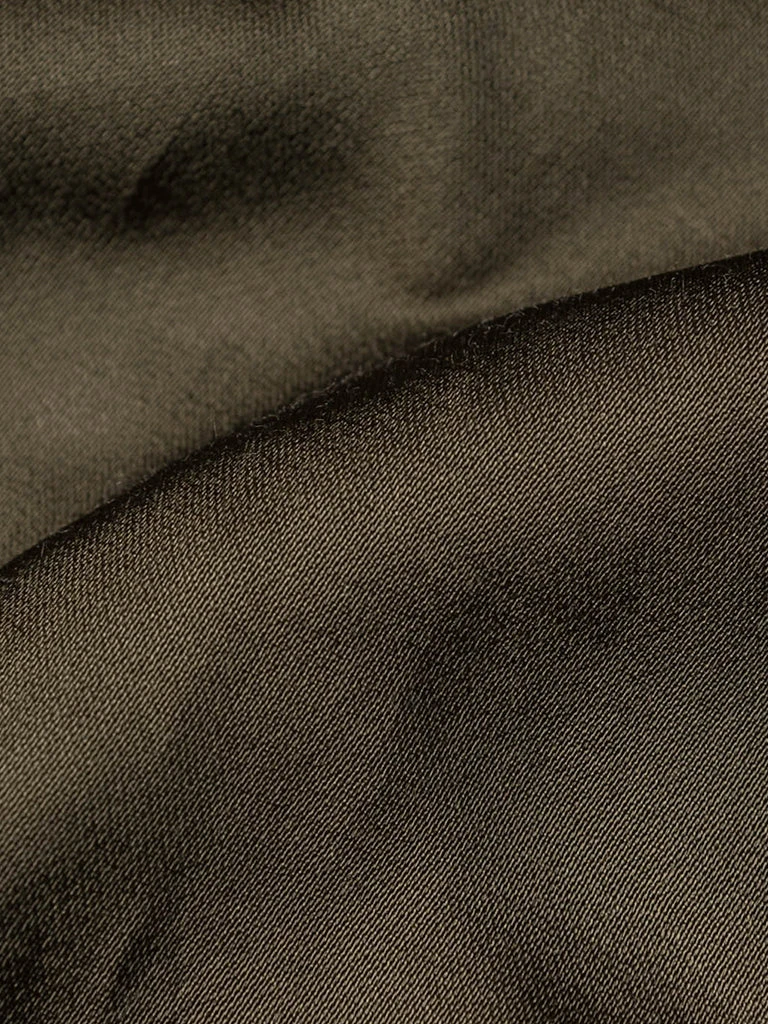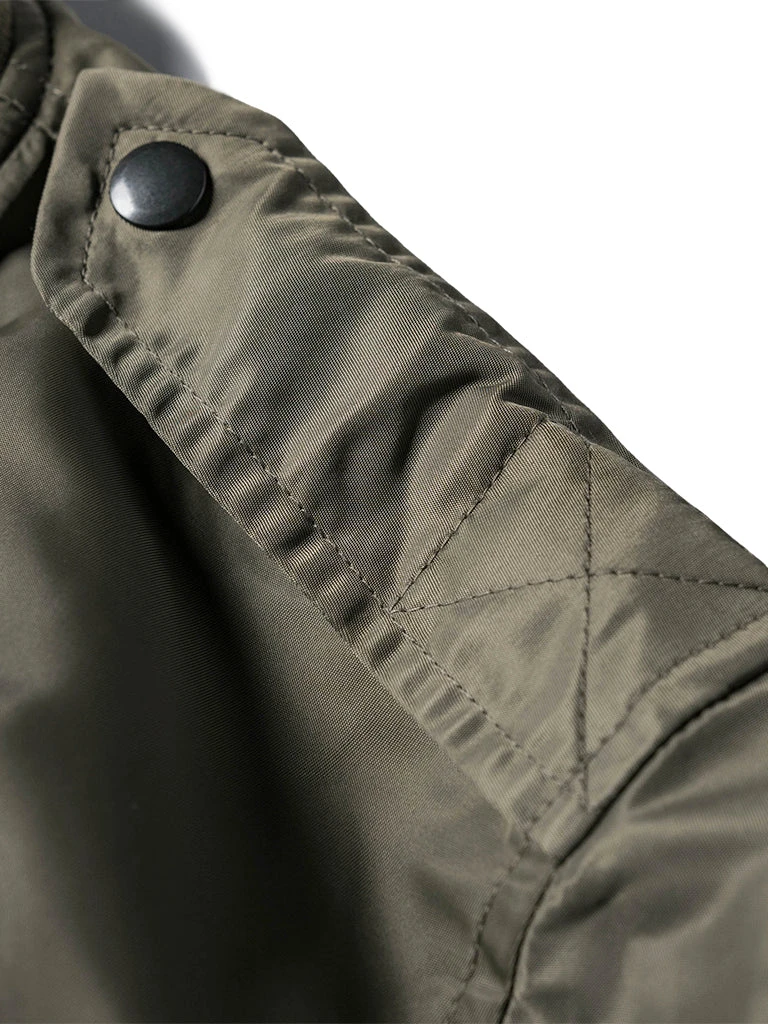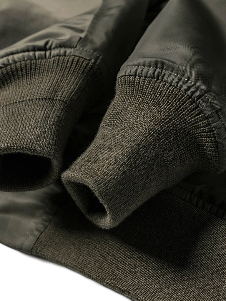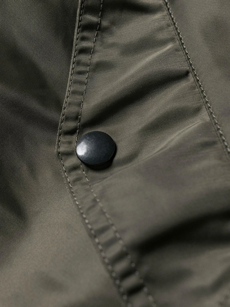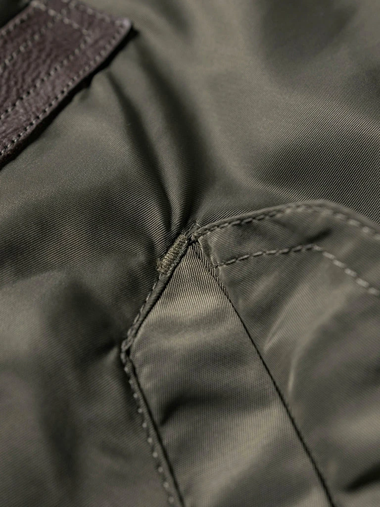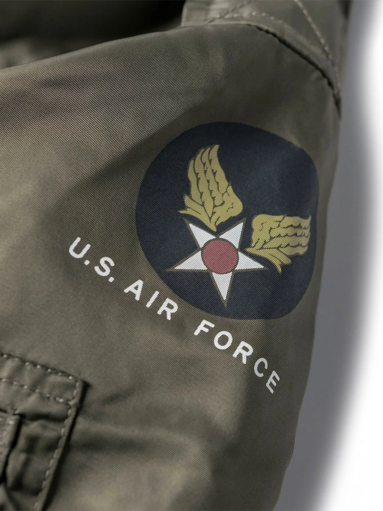 Bronson L-2 Flight Jacket outer is made of double-yarn nylon with a water-repellent coating. The lining is a unique rayon/cotton blend fabric for a thick, silky feel and some warmth, similar to the original. The zippers are vintage CONMAR zippers from IDEAL. The main zipper and the sleeve zipper are copper oxide. The collar and cuff are from a wool blend(70% wool/ 30% acrylic), the cuffs are tubular and have are no-seam rib-knit cuff.