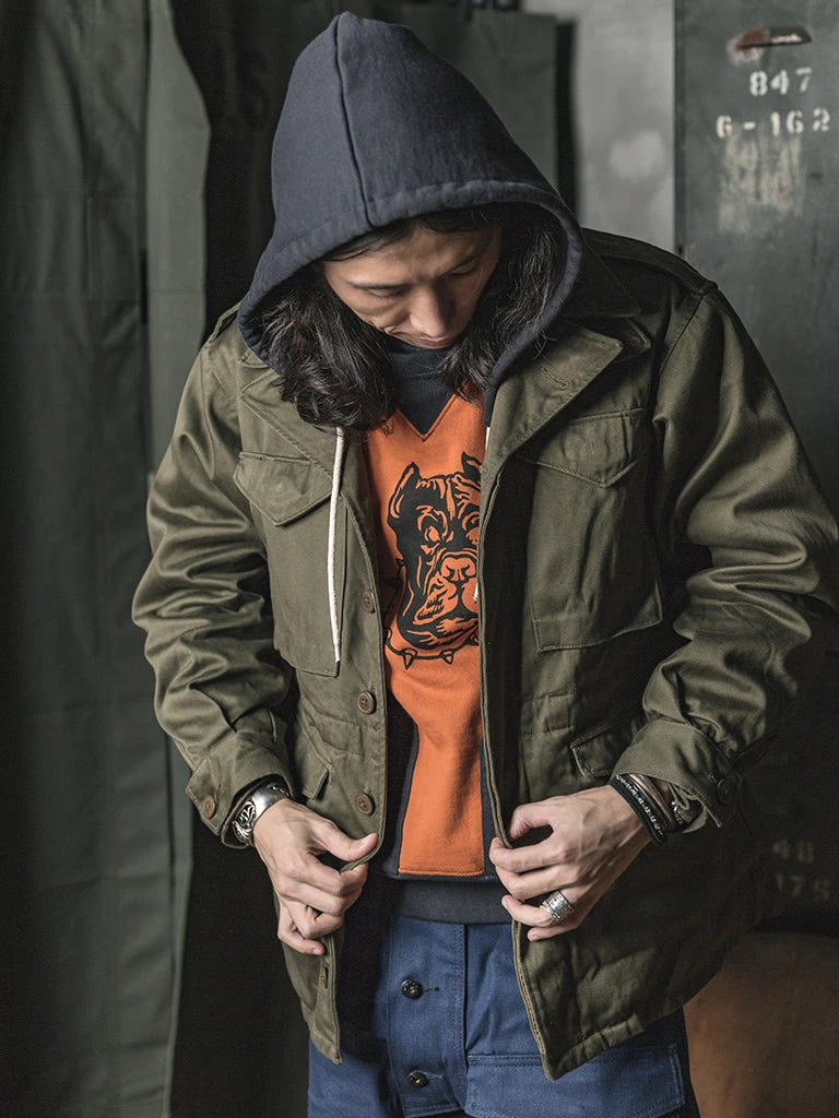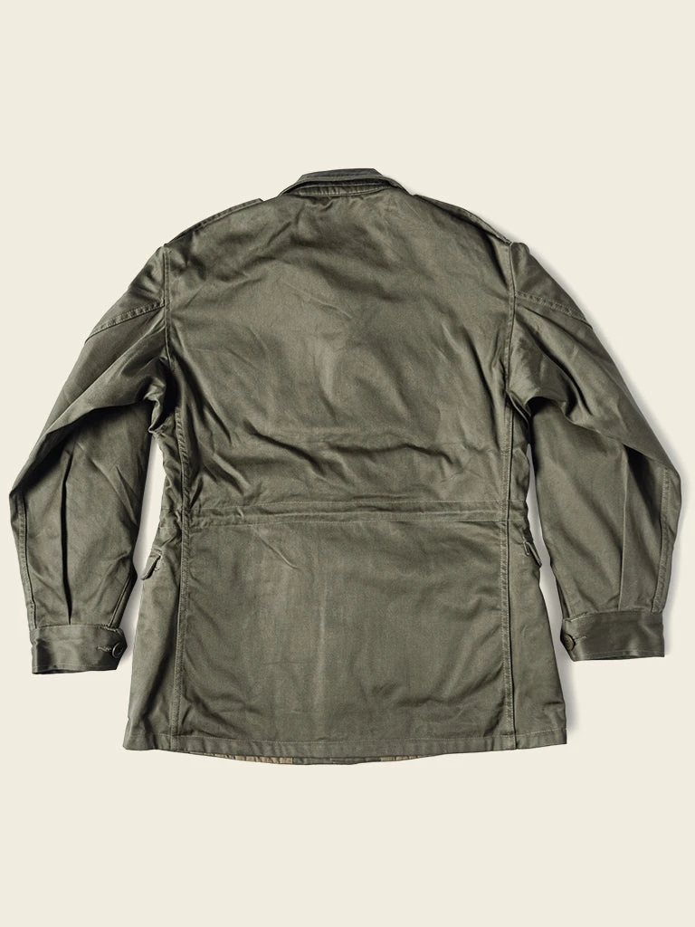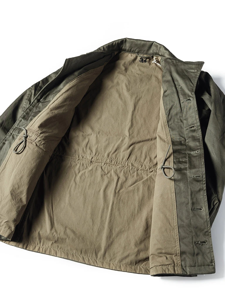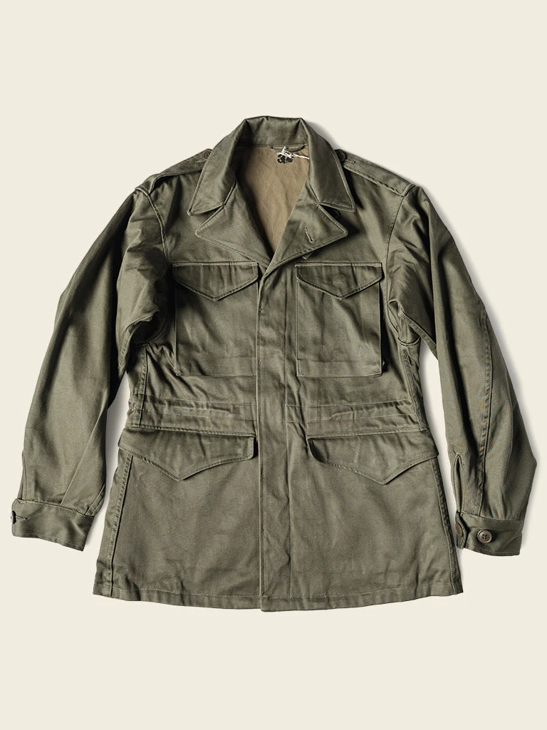 This M-1943 is made of cotton sateen, was originally issued with a removable hood and pile liner, making the field jacket extremely versatile in warm and colder conditions.