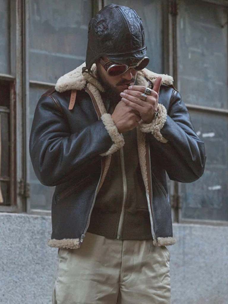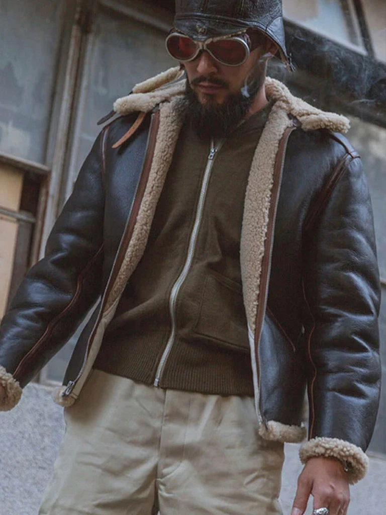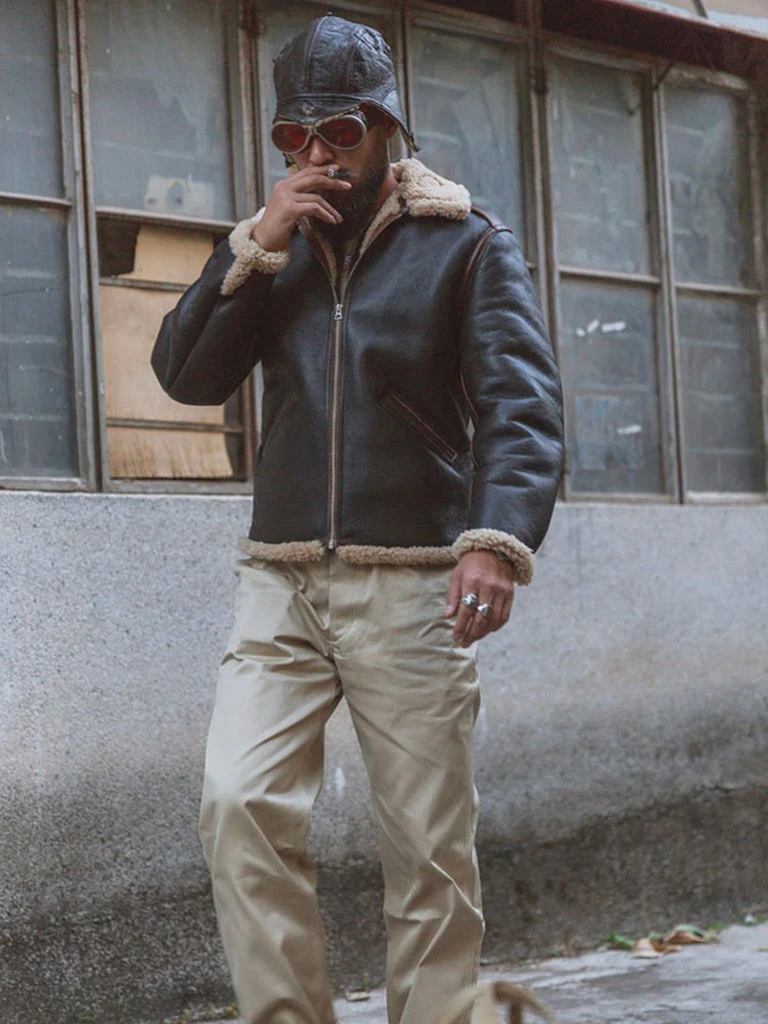 Produced in the 1940s, the Type B-6 was the streamlined variant of the Type B-3. With its single throat latch and slashed front pockets, the Type B-6 jacket is made from 1/4 inch shearling for warmth and mobility, and categorized in the ‘Intermediate Zone’ for flight clothing.