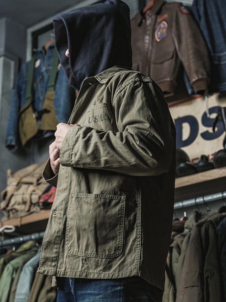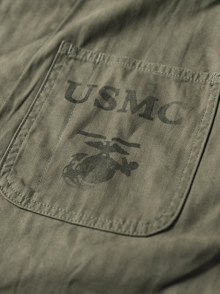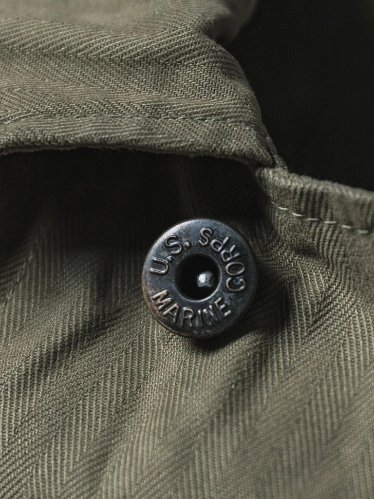 The P-41 uniform consists of one jacket and pants. The P-41 jacket has one pocket on each side of the waist, no pleats on the back, and the Marine Corps badge and the USMC are printed on the jacket’s left breast. It has four copper-plated metal buttons on its front placket that has the initials of the USMC. Its cuff has two metal buttons and a buttonhole that can be used to adjust the size of the cuff. The design is straightforward and bright.