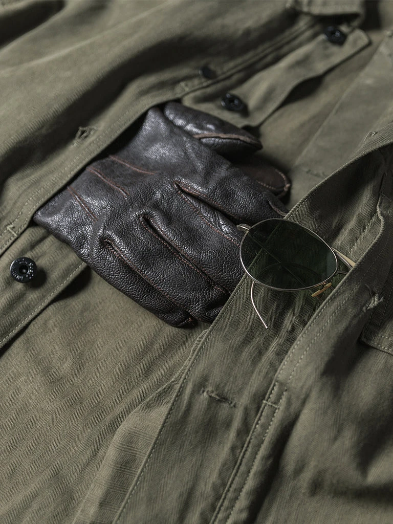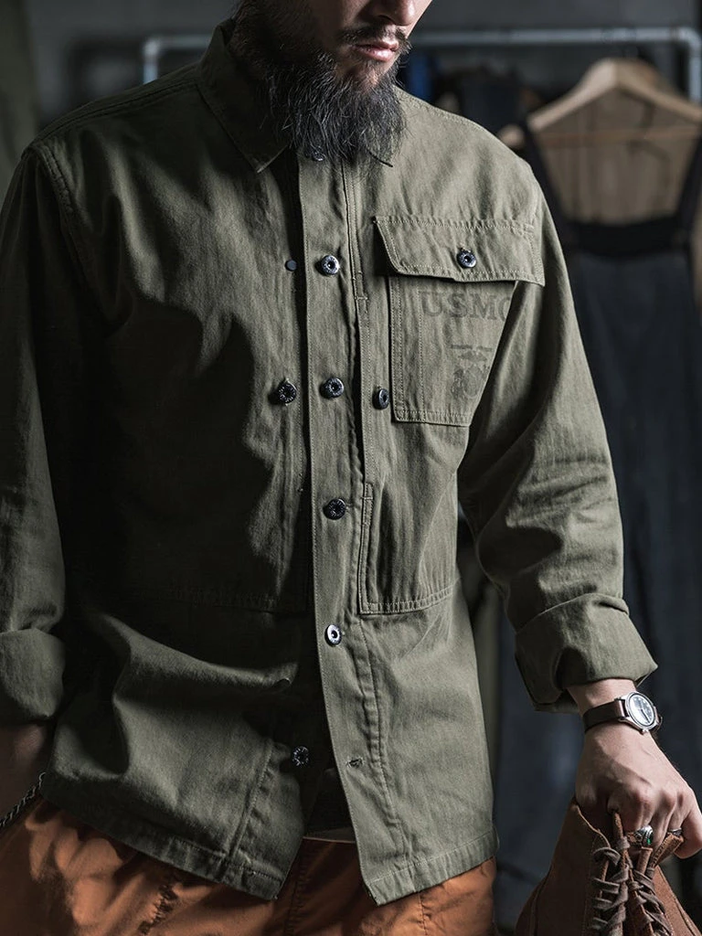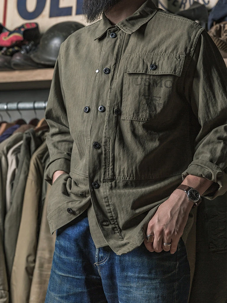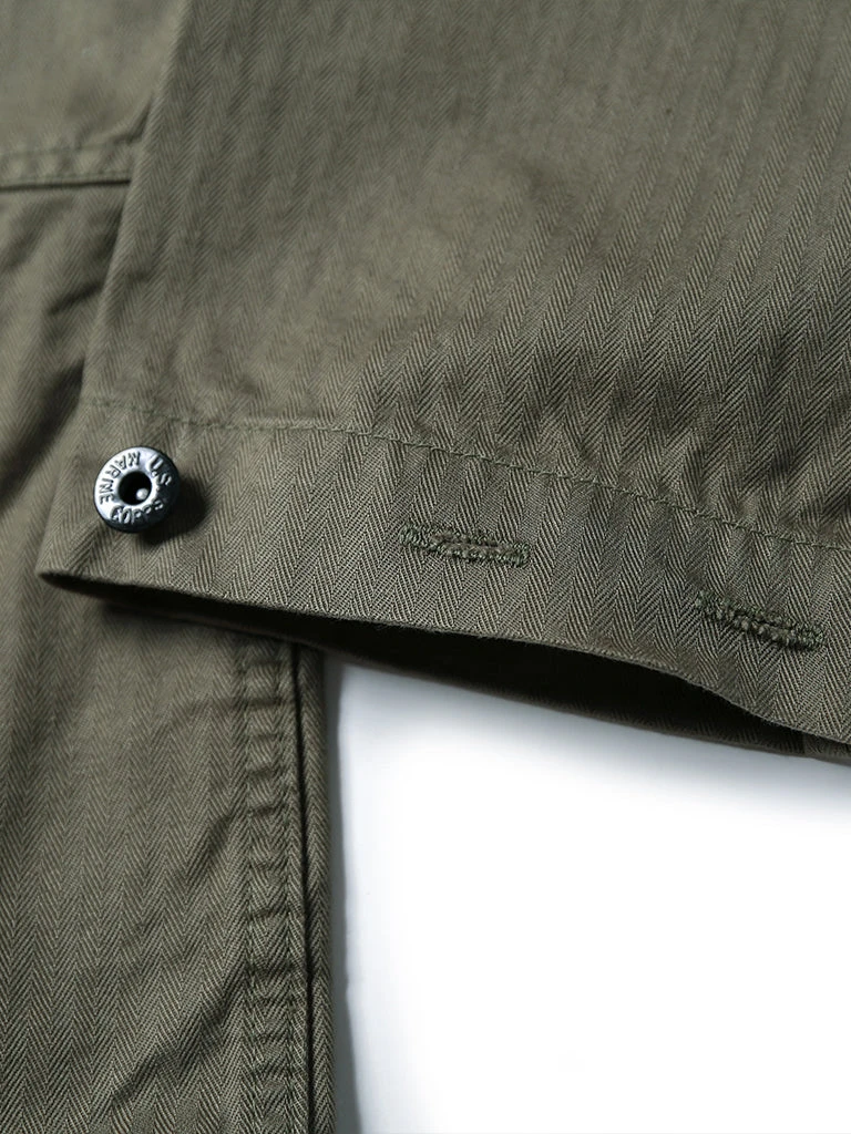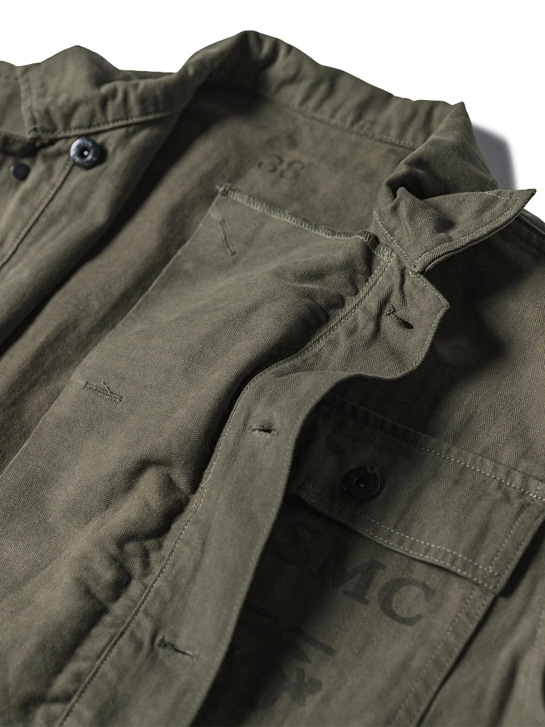 In March 1944, the P-44 set was officially released. The feature of this uniform is to carry the necessary combat equipment as much as possible, so there are more pockets for the P-44, and it also becomes structurally complicated. There were large pockets on each side of the front placket of the jacket, the left breast has a rectangular pocket with a pocket cover, and the words USMC printed on it. There is a button under the collar to facilitate the installation of a gas masks hood if necessary. Its cuff has a metal button and two buttonholes to tighten the cuff. Its color of P-44 is darker and more profound than P41.