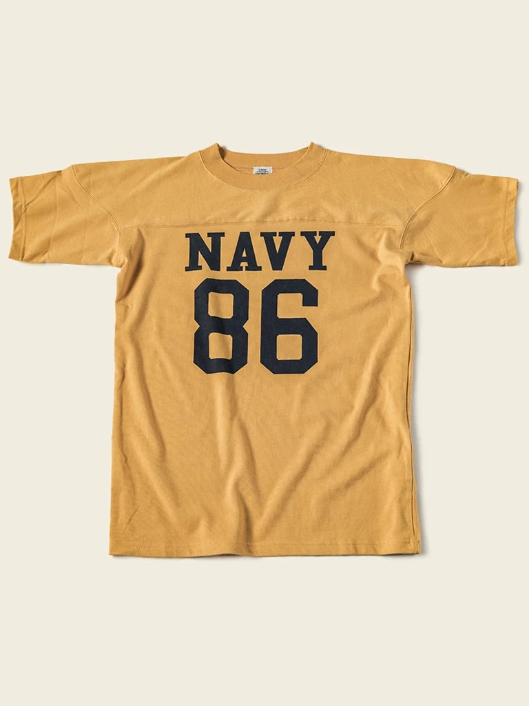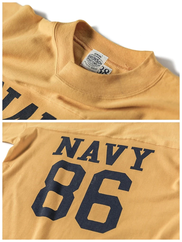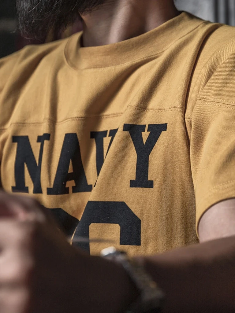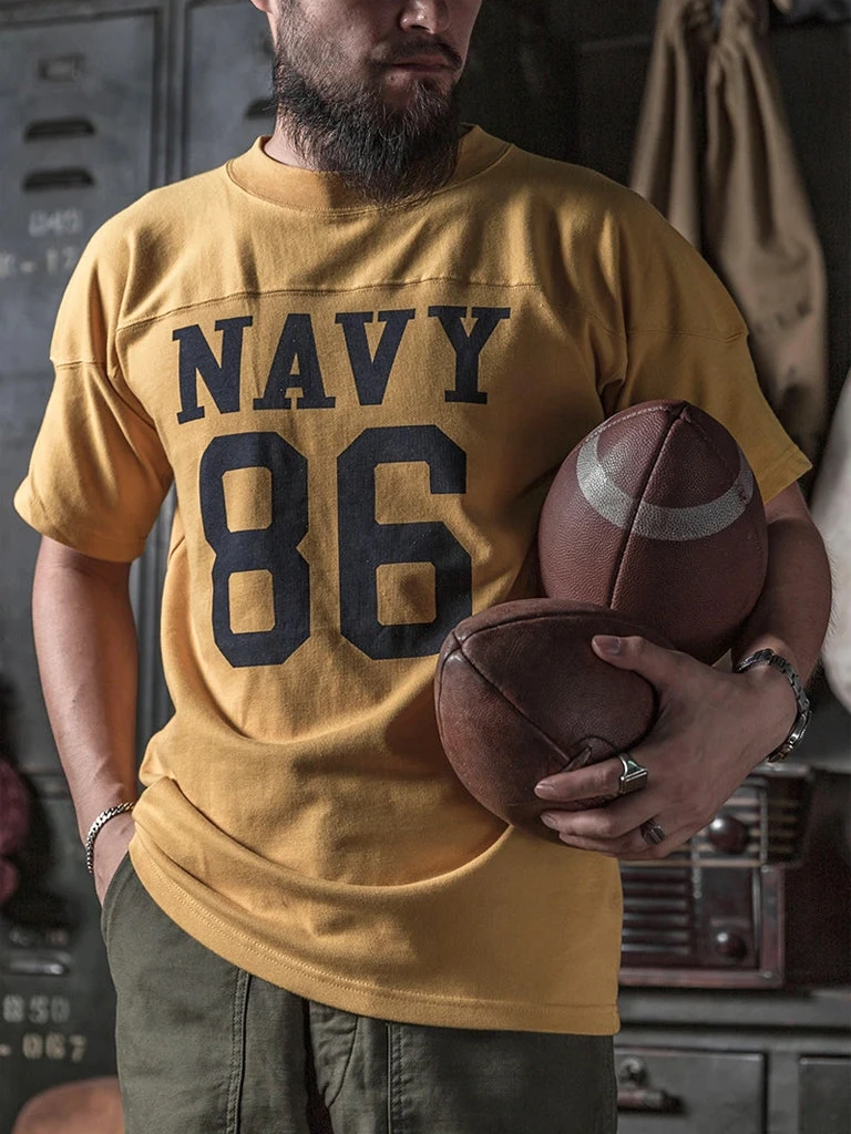 Navy football jerseys have a special patchwork shoulder design. This was designed so that a brace could be added to protect the shoulders, and the word “NAVY” was printed on the chest Numbers (usually represent the year of enlistment or enrollment).