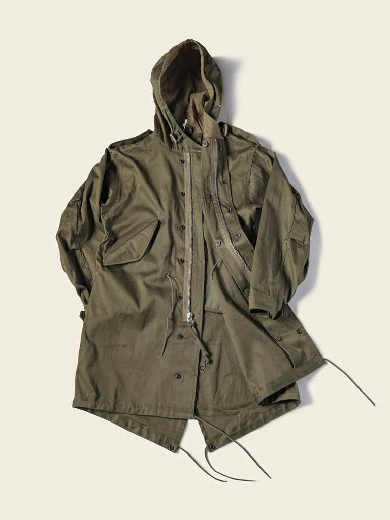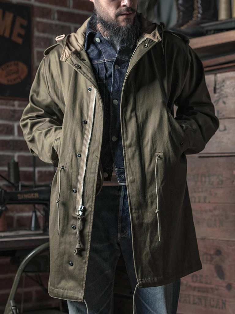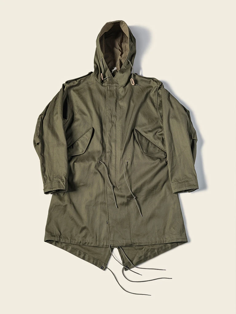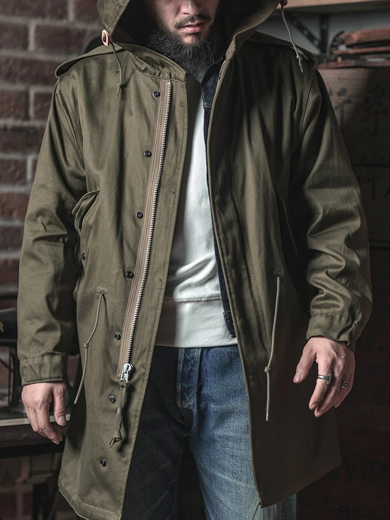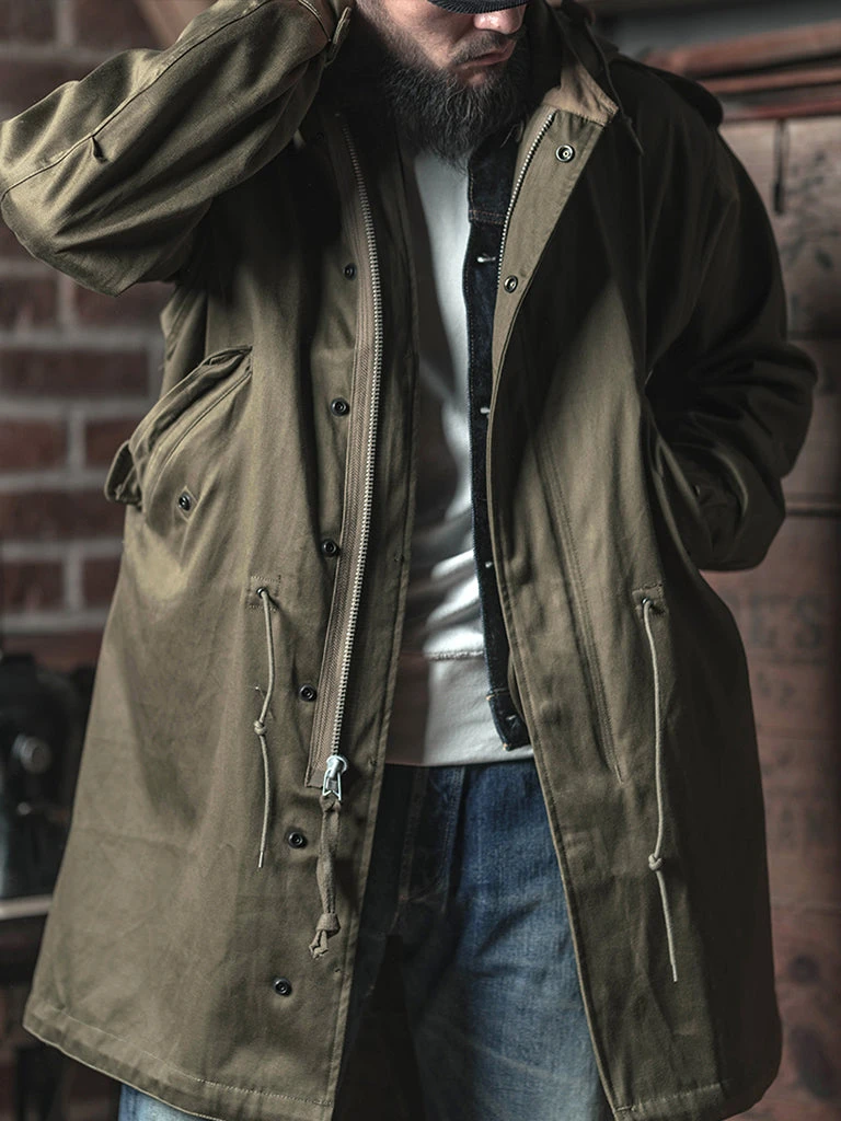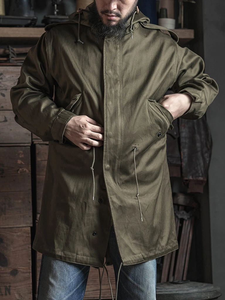 The M-1951(or M51) Parka, commonly known as the fishtail parka. It was designed by the US Army during the Korean War to cope with severe cold weather. It was a replacement for the M-48 Parka. The early M-51 Parka was made of heavy cotton sateen fabric, which was thicker. The fishtail was intended to be tied around soldiers’ legs for additional cold-weather protection. The M-51 parka can add a wool liner to the inside.