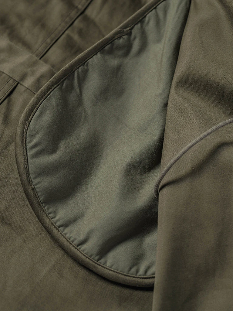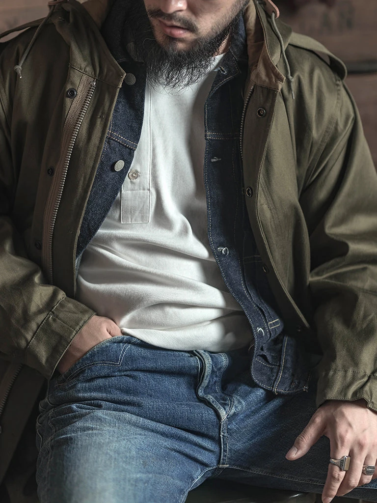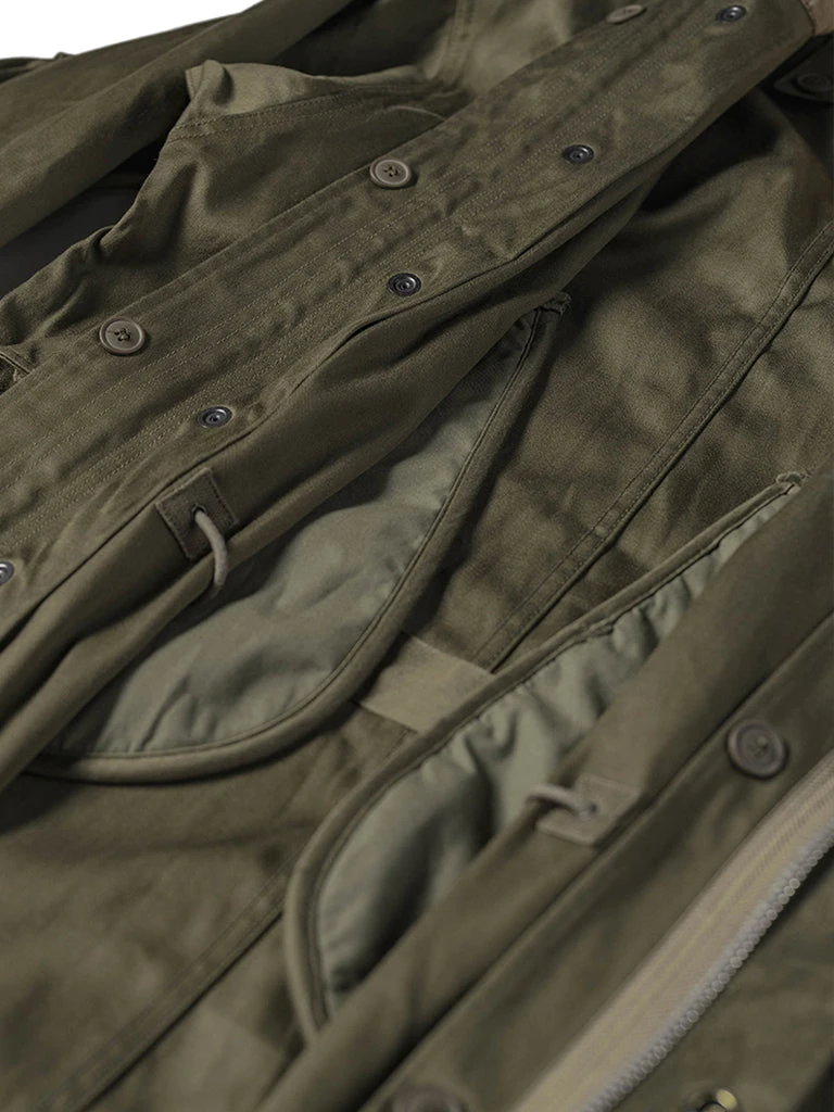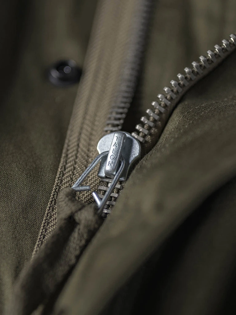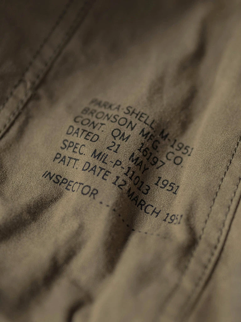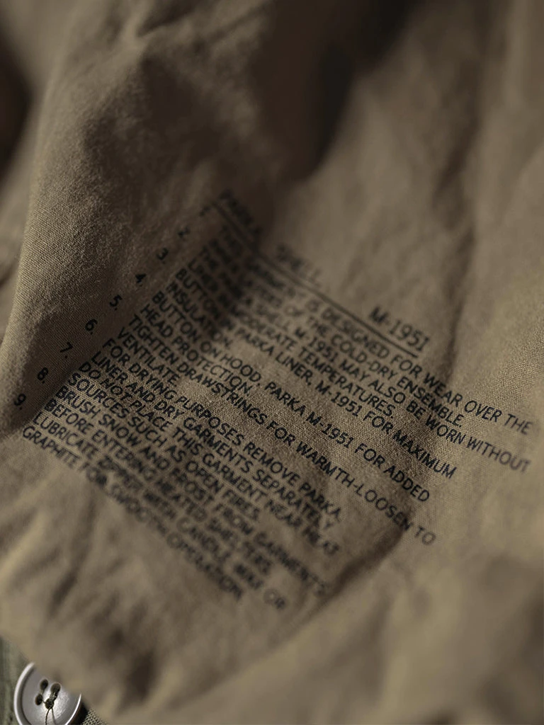 This reproduction of the M-51 parka, which was in production first version during 1951. It’s made of heavyweight 11 oz cotton sateen fabric, using the metal zipper, internal marks for the mimeograph process, reproduced the details of the original version.