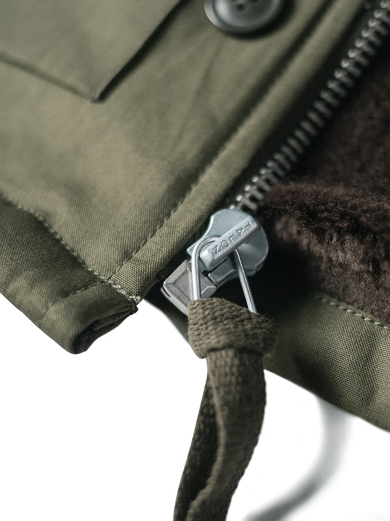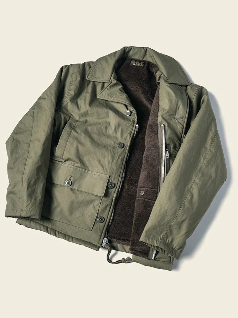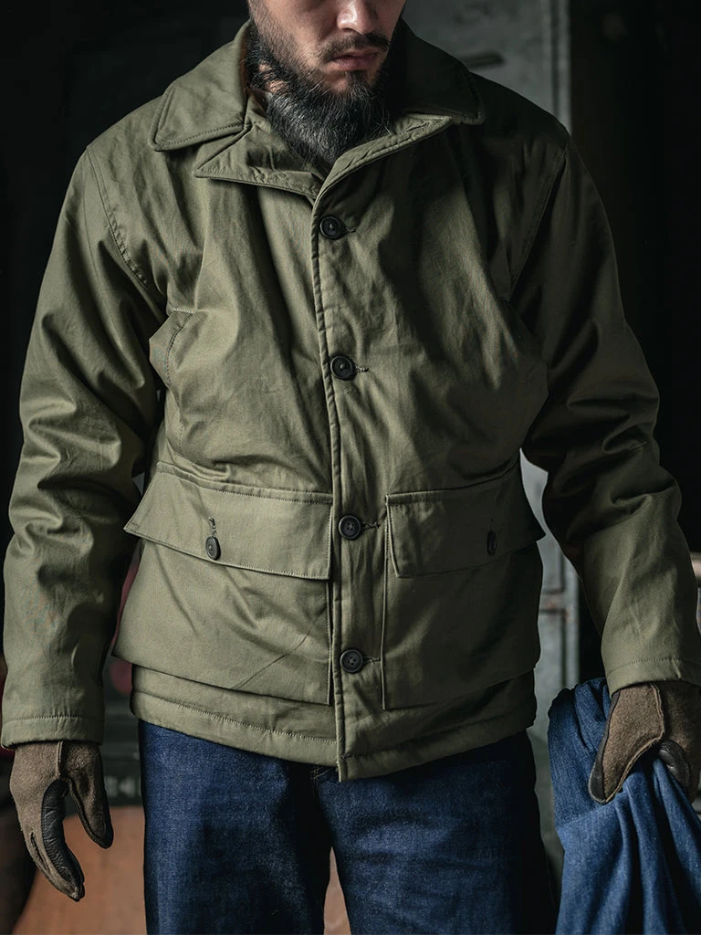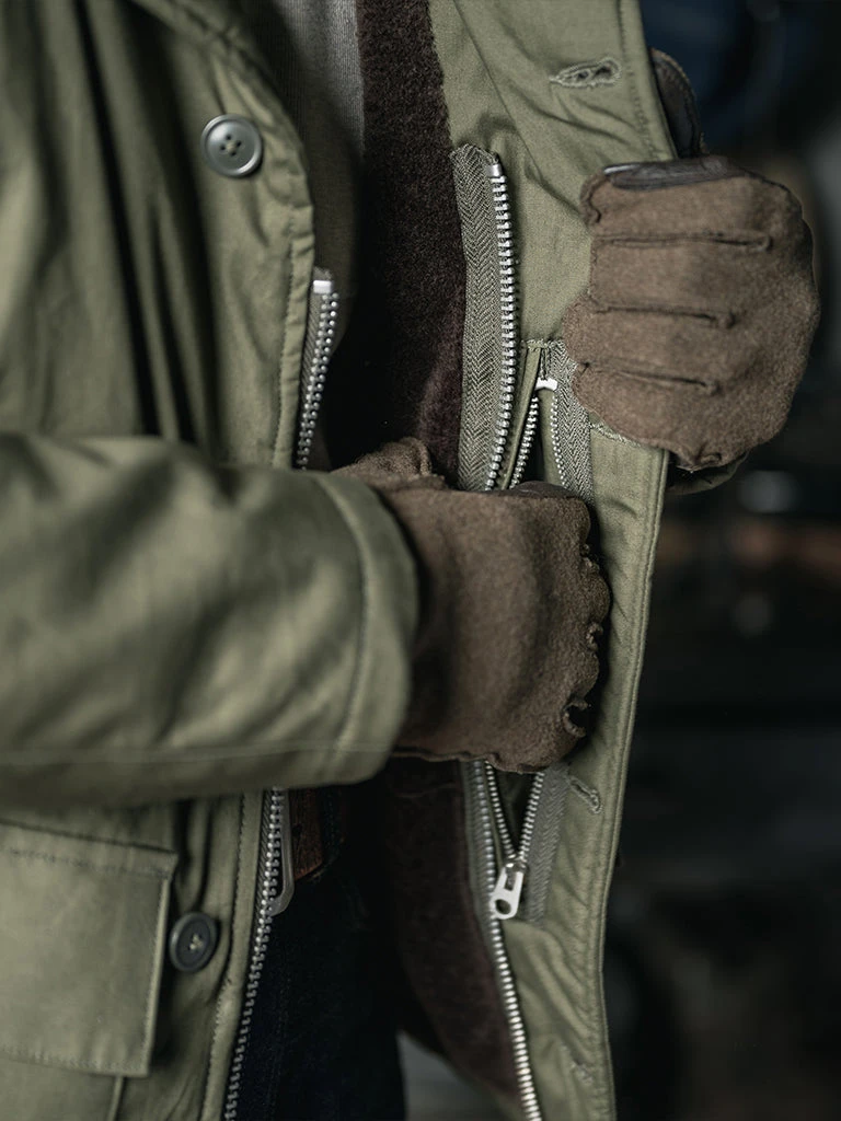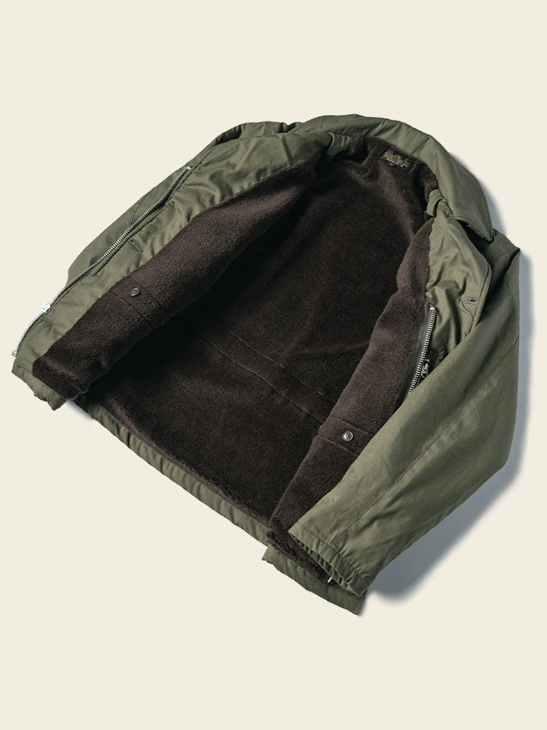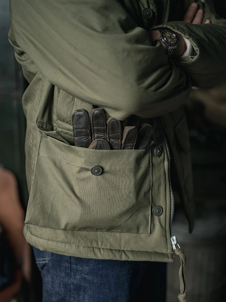 The AL-1 (55J13) is a mid-length jacket with a field jacket-like lapel appearance. The jacket is closed by a zipper and had the button-type front fly provides good warmth. The body is made of flocking wool, the sleeve is made of wool, there are hand pockets on both sides of the chest, and there are wool threaded cuffs to strengthen warmth, there are two large three-dimensional storage bags at the hem. Inside the jacket, there is a pocket on each side, one side is zipped closed, the other side is button closed.