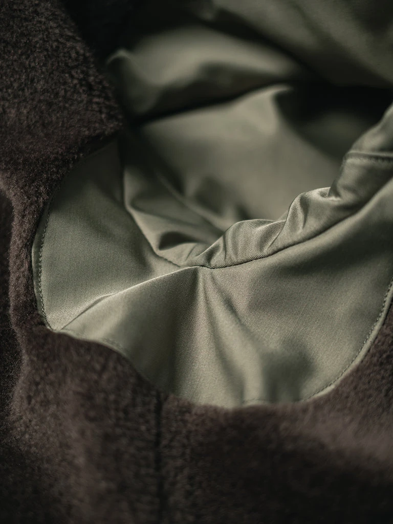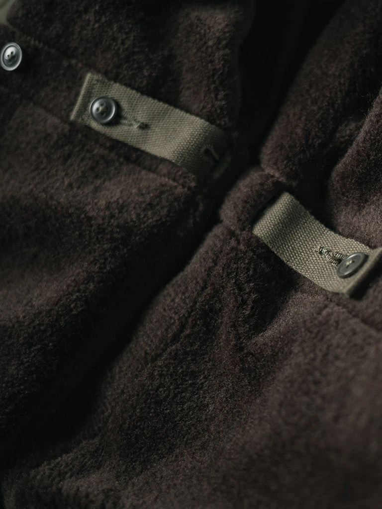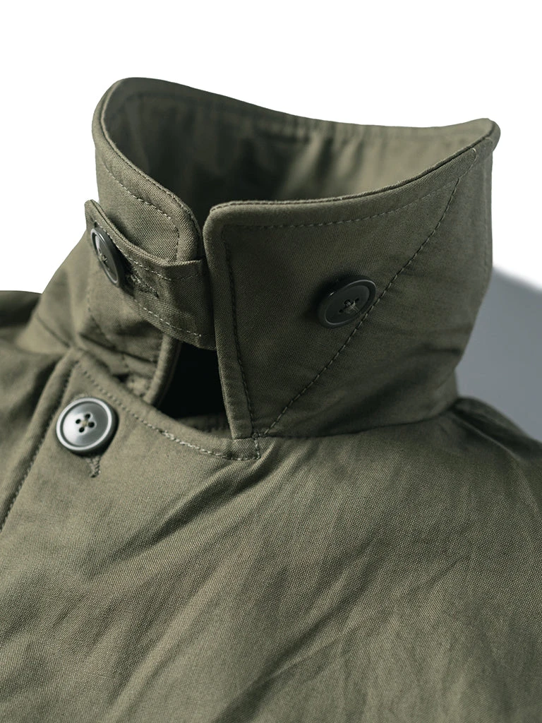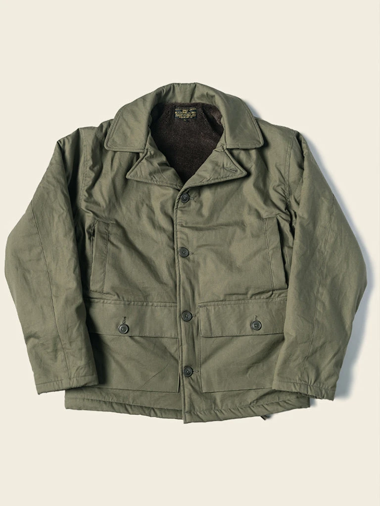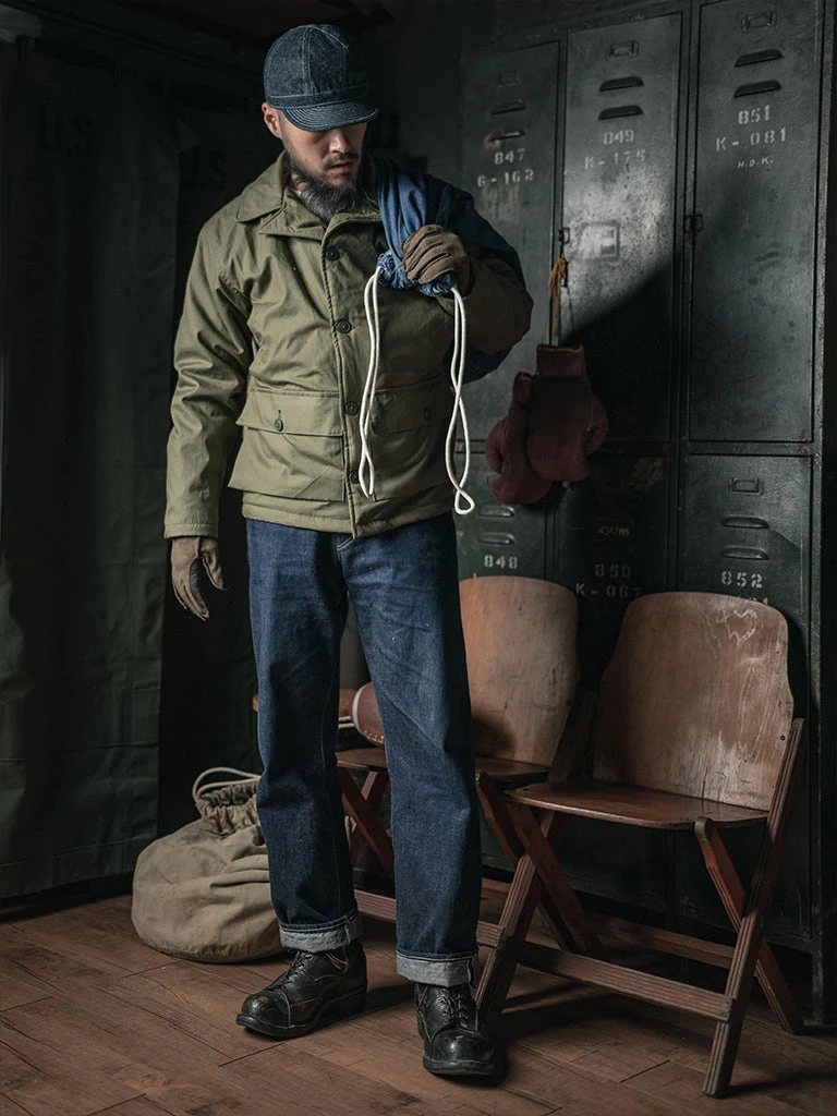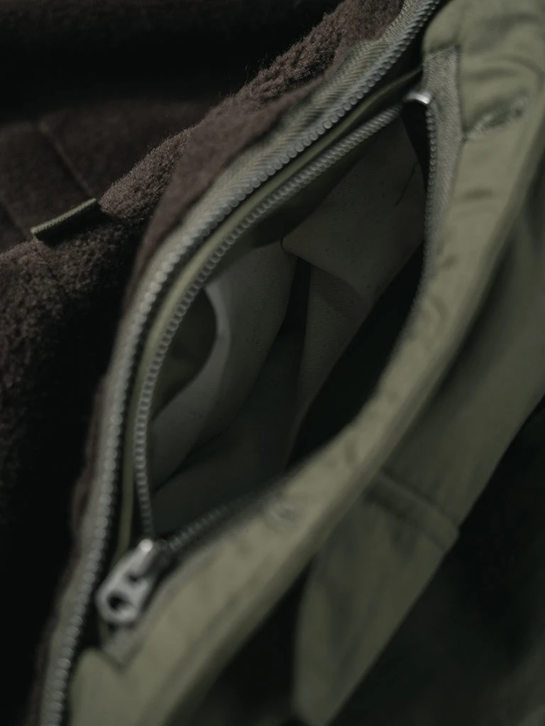 The AL-1 (55J13) is a mid-length jacket with a field jacket-like lapel appearance. The jacket is closed by a zipper and had the button-type front fly provides good warmth. The body is made of flocking wool, the sleeve is made of wool, there are hand pockets on both sides of the chest, and there are wool threaded cuffs to strengthen warmth, there are two large three-dimensional storage bags at the hem. Inside the jacket, there is a pocket on each side, one side is zipped closed, the other side is button closed.
