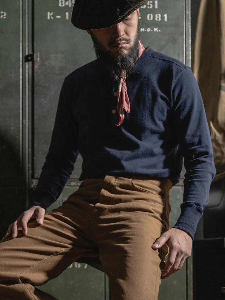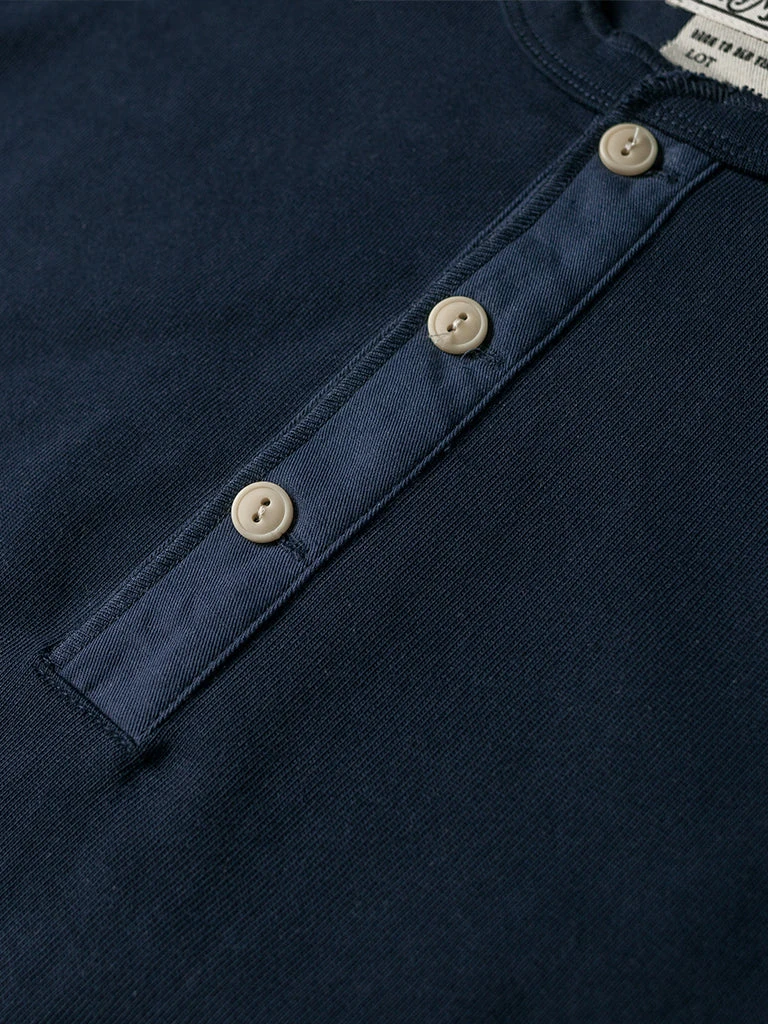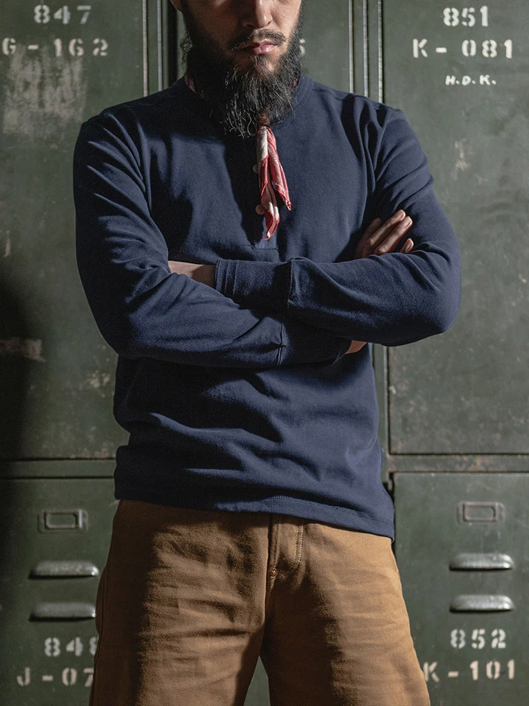 The Henley T-Shirt was designed as a rowing shirt two hundred years ago before hitting its stride in combat. This Henley is 3 buttons style, made of heavyweight 9.7 oz cotton fabric, standard fit, not too tight, not too loose, easy throughout the body, has a great texture, is comfortable to wear, and will look more retro after long wear and multiple washes.