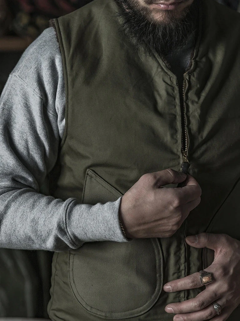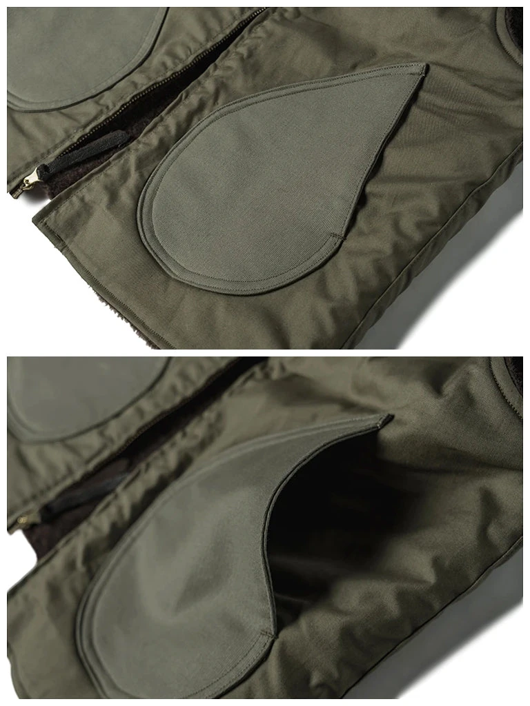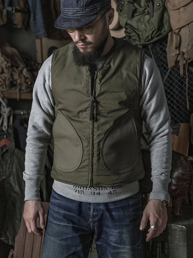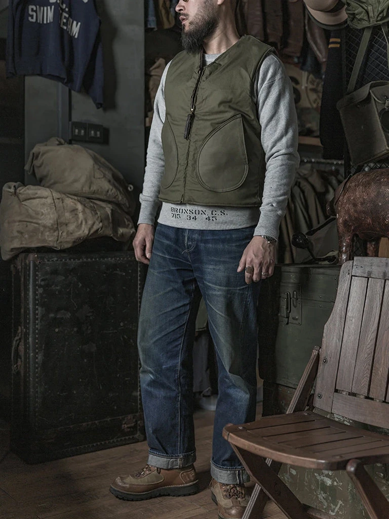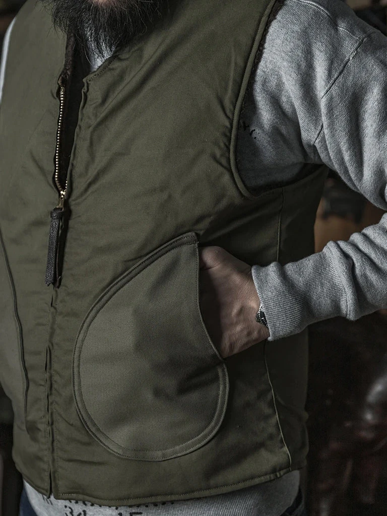 This vest is made of OD color custom-made poplin cotton fabric (about 7 oz, which is similar to the gram weight of the original version). It is water and oil-proof, but which will weaken with the increase of washing times. Based on the original version, two pockets were added similar to those on the deck jacket, making it less monotonous and more practical. It can be worn with a shirt, or in a sweatshirt, or with a leather jacket.
