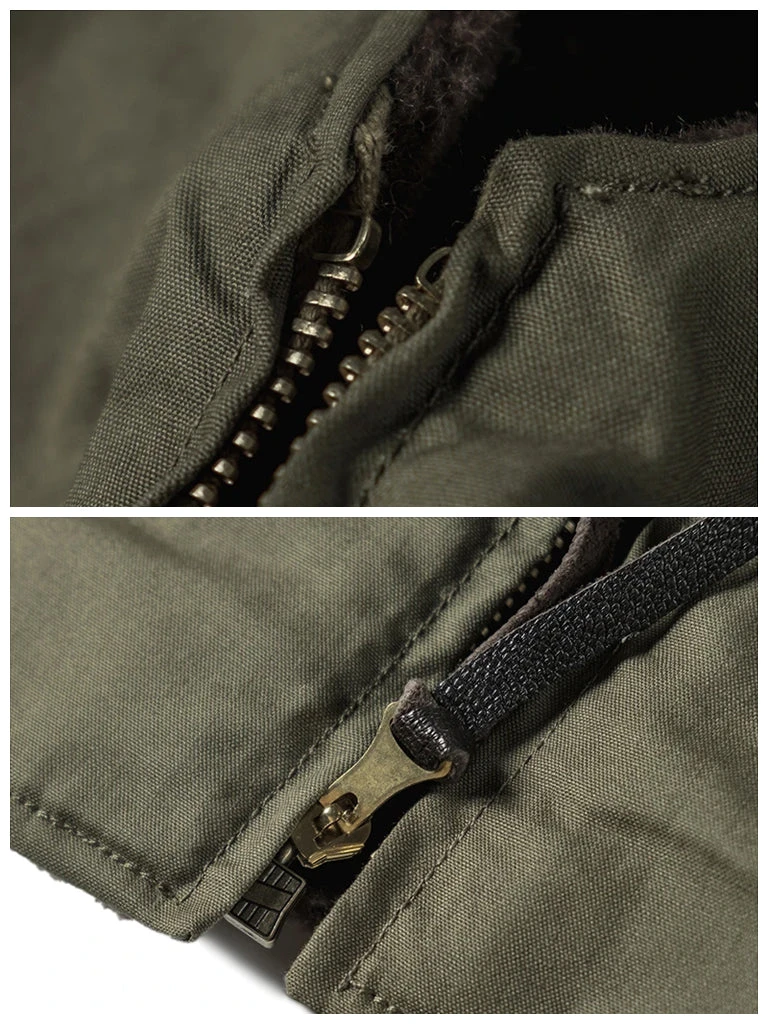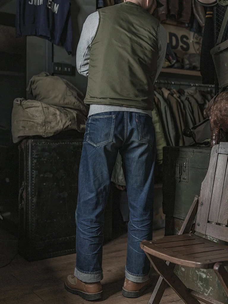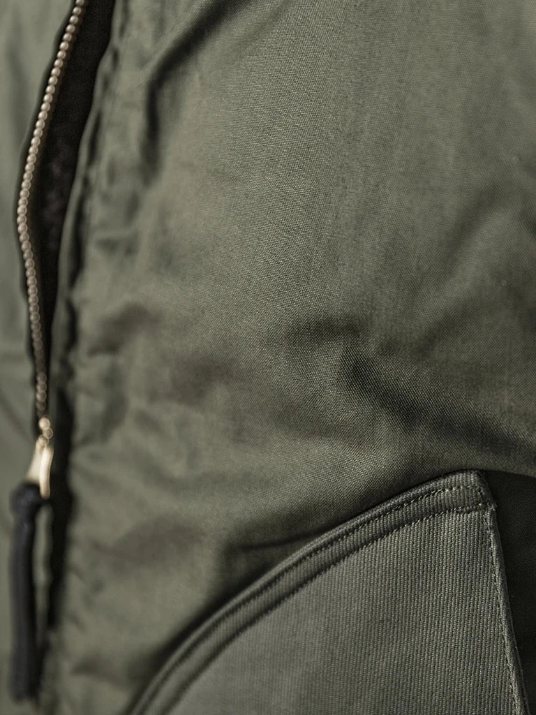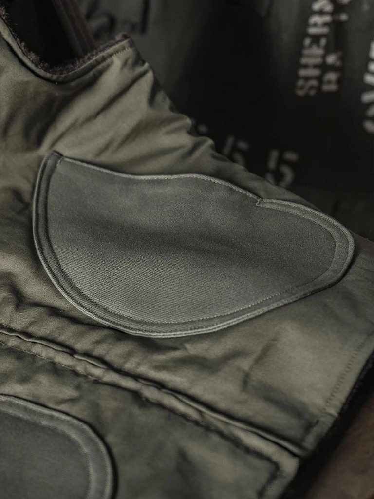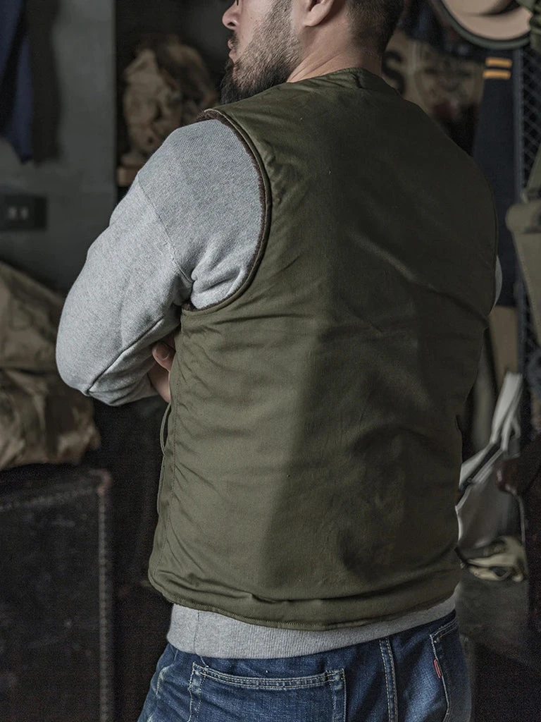 This vest is made of OD color custom-made poplin cotton fabric (about 7 oz, which is similar to the gram weight of the original version). It is water and oil-proof, but which will weaken with the increase of washing times. Based on the original version, two pockets were added similar to those on the deck jacket, making it less monotonous and more practical. It can be worn with a shirt, or in a sweatshirt, or with a leather jacket.