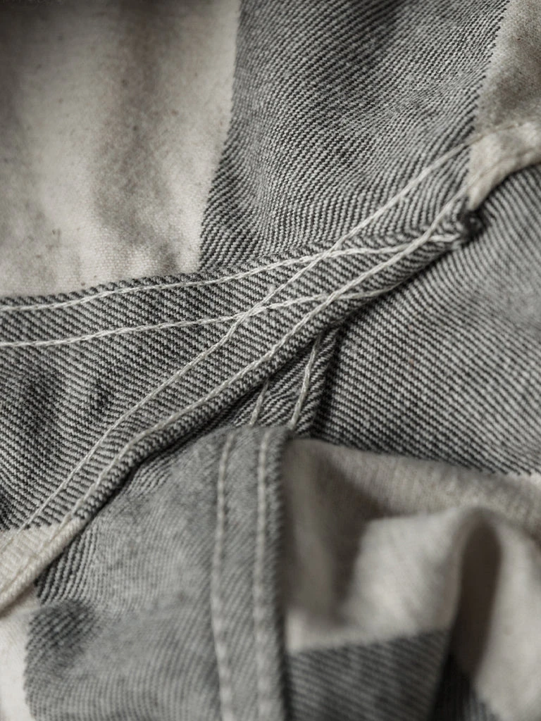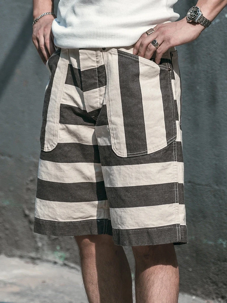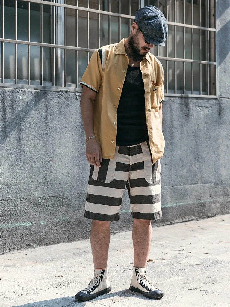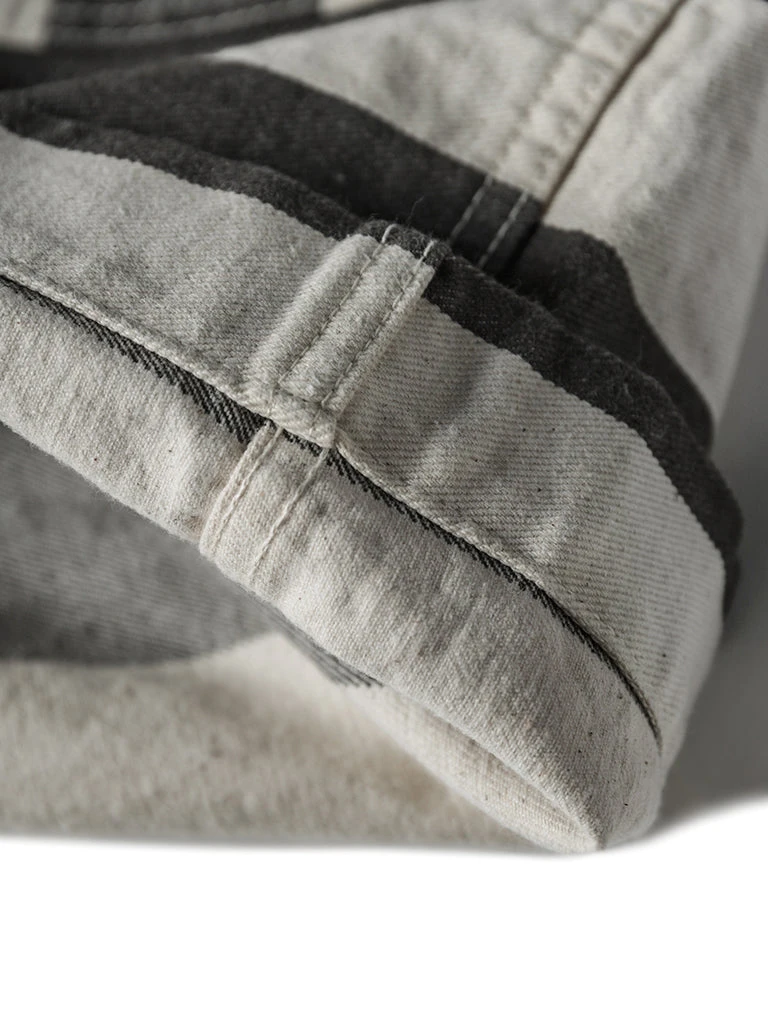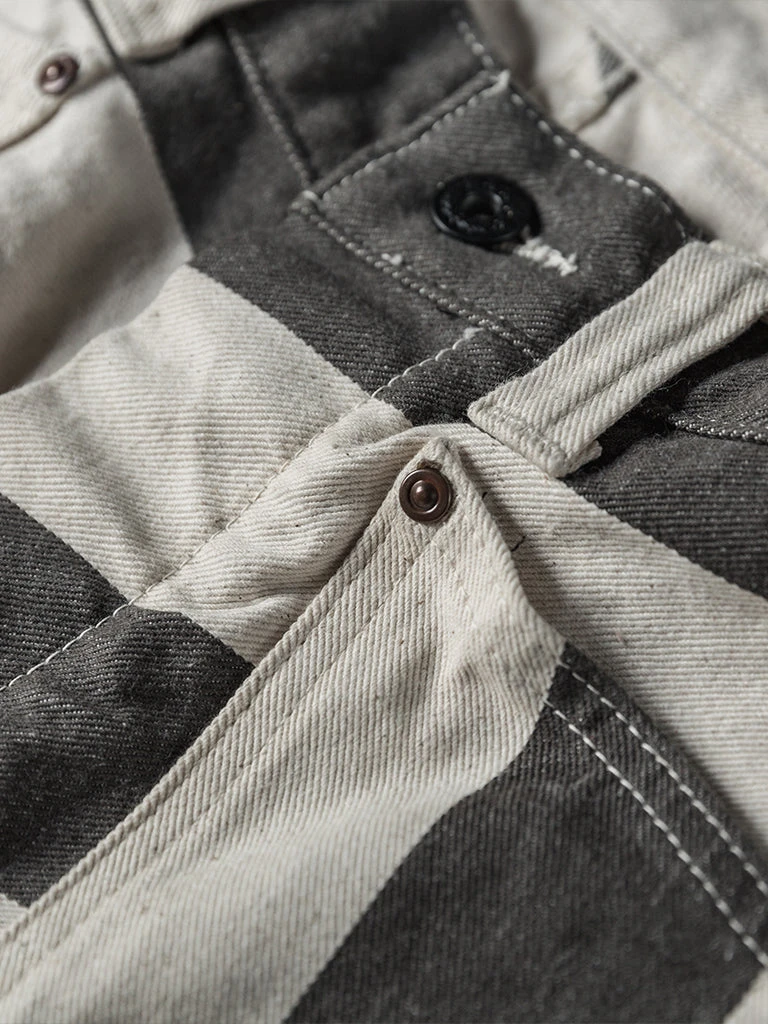 The shorts feature a color scheme of gray-black and creamy white stripes, with cottonseed shell particles on the fabric, and this features a color scheme and style that existed in the 1930s and 1940s. It’s made of yarn-dyed 11.5 oz twill cotton fabric, two patch pockets on the front and back of each side, using brass doughnut button and brass rivet, high waist, slightly loose, comfortable to wear.