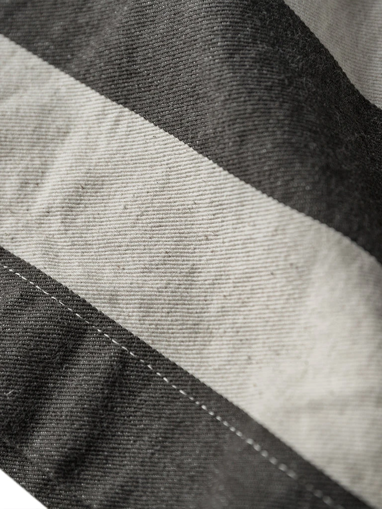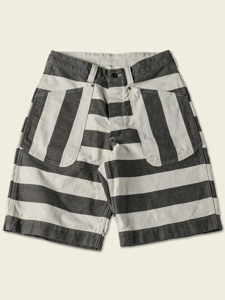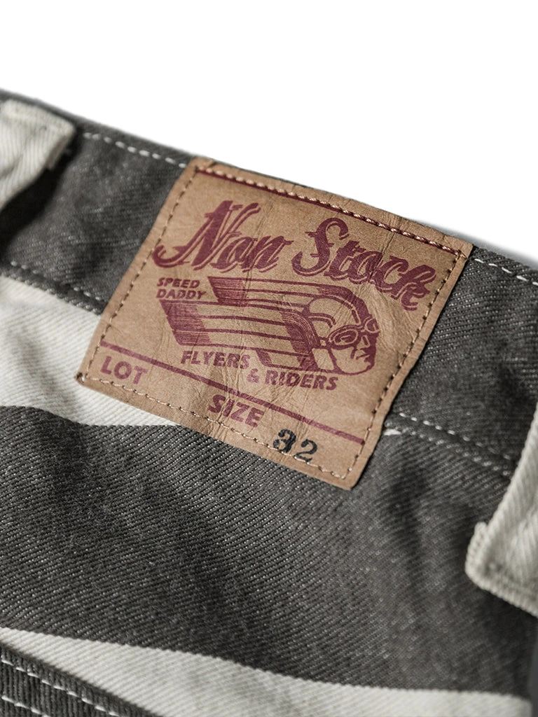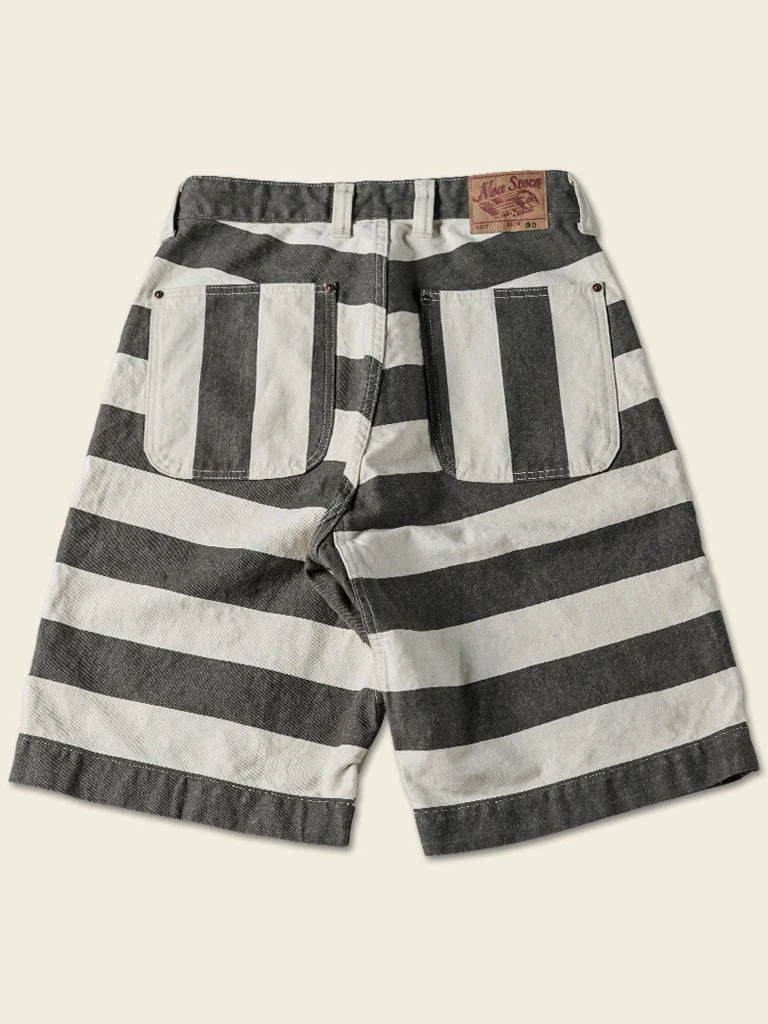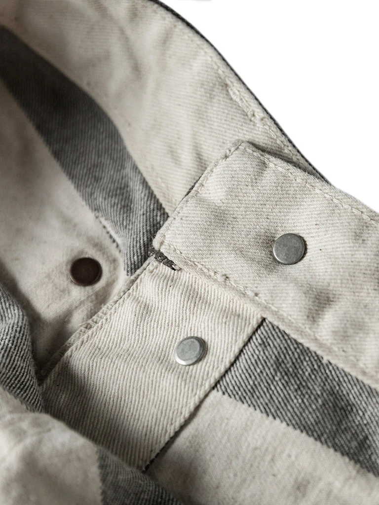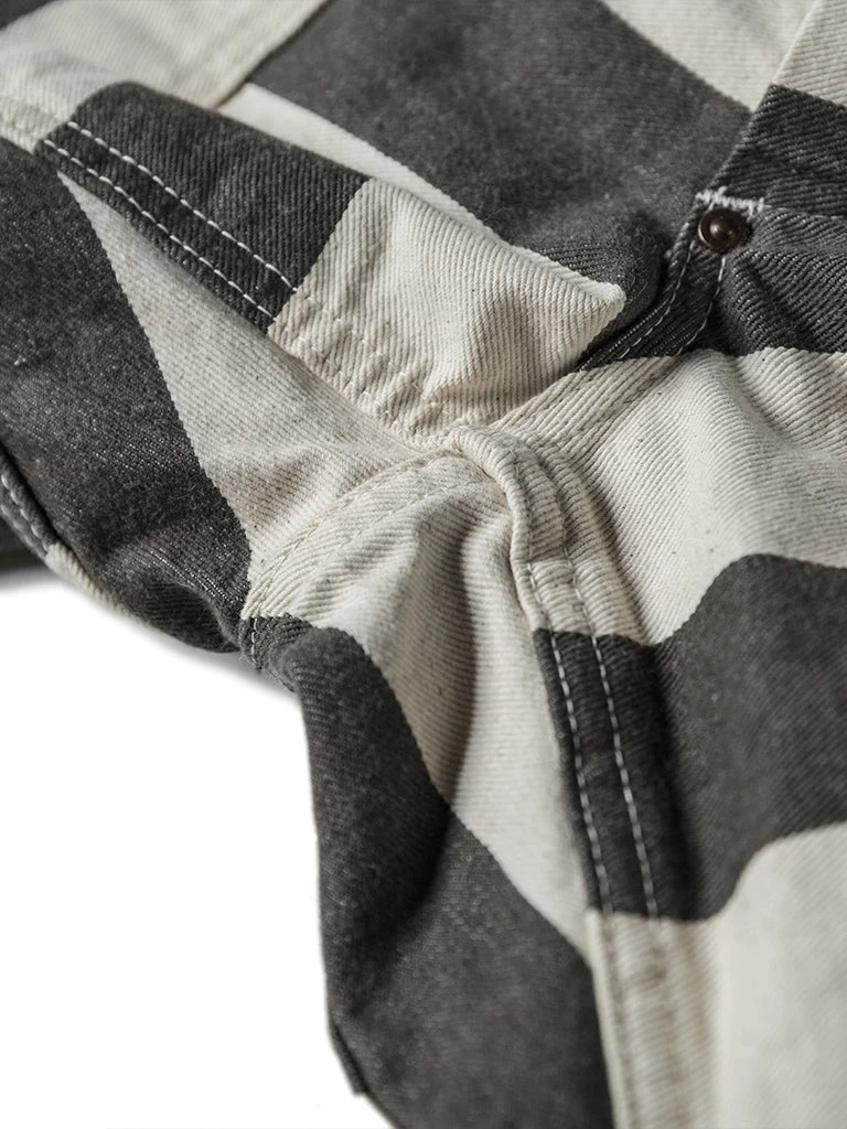 The shorts feature a color scheme of gray-black and creamy white stripes, with cottonseed shell particles on the fabric, and this features a color scheme and style that existed in the 1930s and 1940s. It’s made of yarn-dyed 11.5 oz twill cotton fabric, two patch pockets on the front and back of each side, using brass doughnut button and brass rivet, high waist, slightly loose, comfortable to wear.