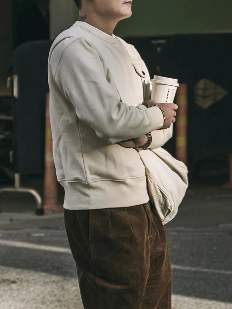 This sweatshirt is made of 17.5 oz terry cloth. It is soft, comfortable, has no static electricity, can be worn close to the skin, and has good elasticity. The sewing technology adopts the old-time classical sewing process: overlocking and then interlocking. Compared with an ordinary single overlock, it’s stronger and more beautiful. It can be worn outside in spring and autumn and can also be worn as a base in autumn and winter. It is available to choose khaki, black and white. Bring more possibilities for daily wear.