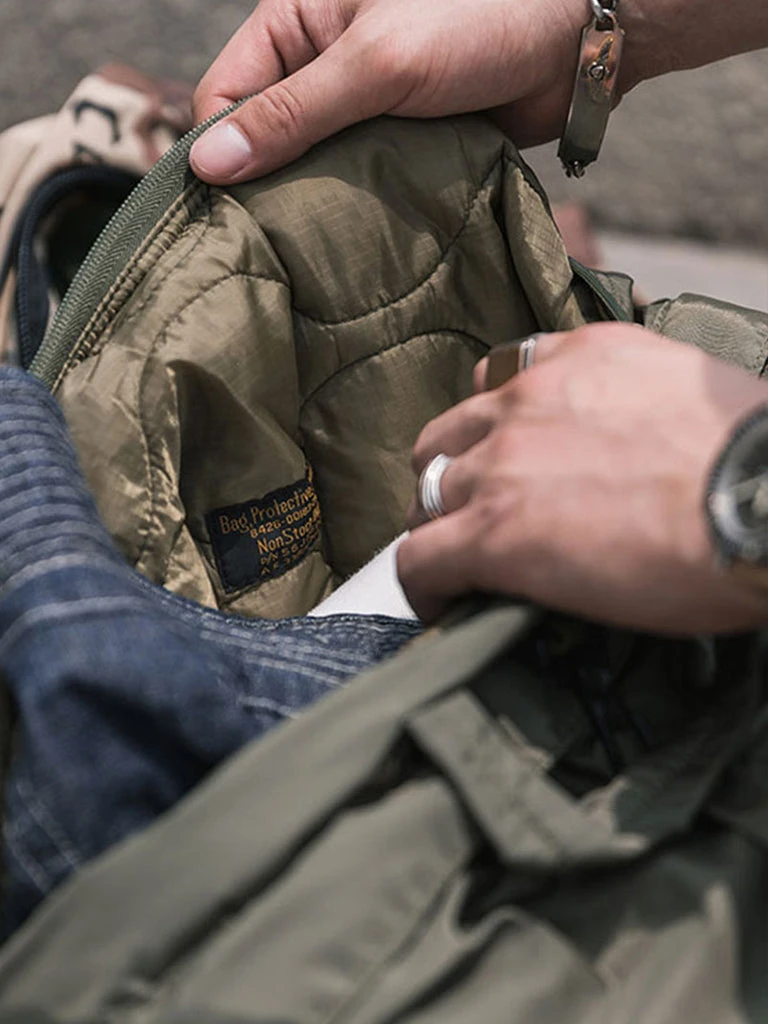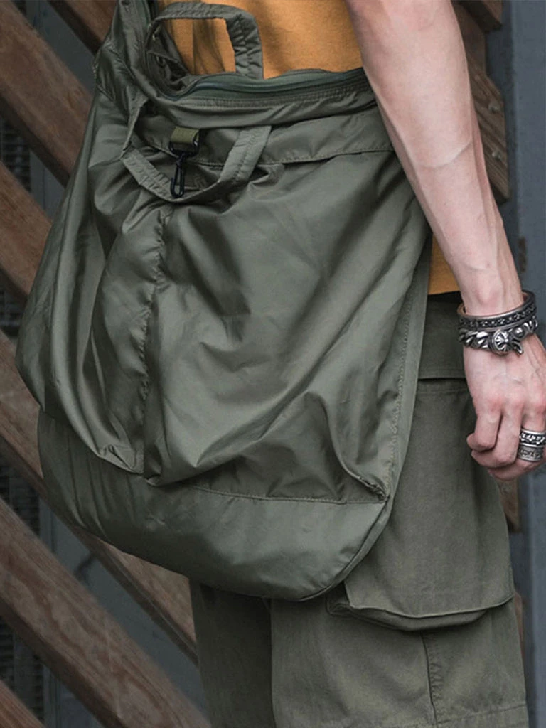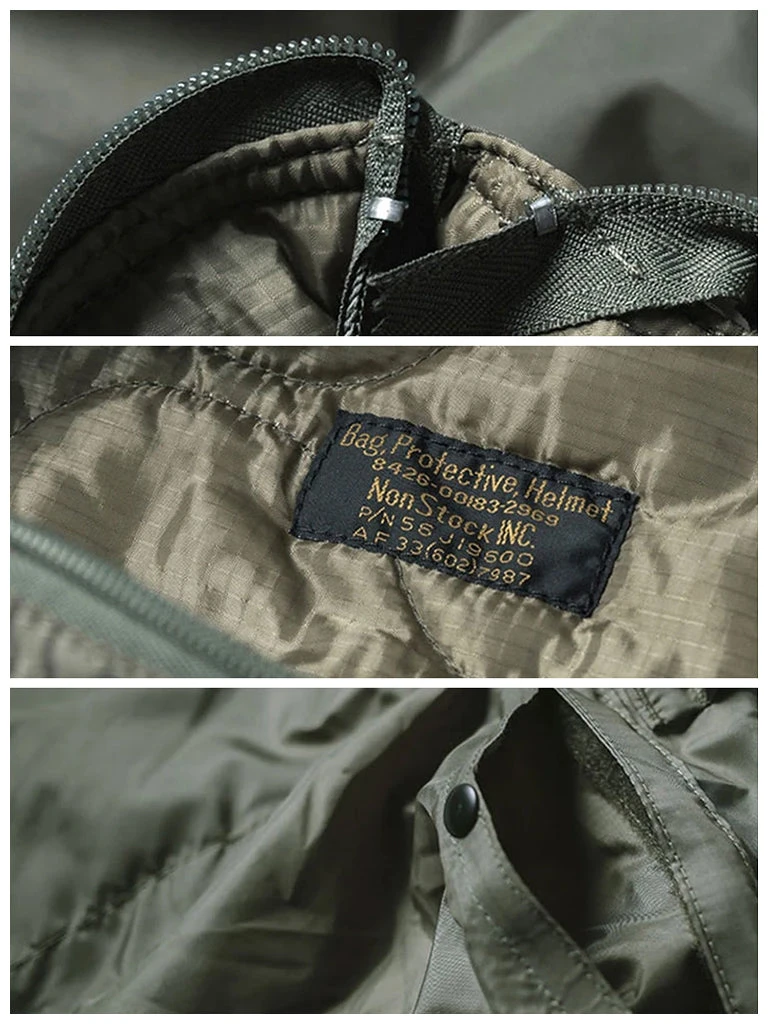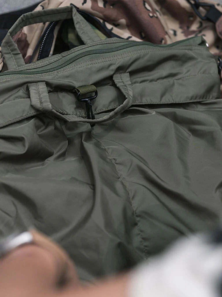 The prototype is taken from the 80’S nylon helmet bag, the shell is waterproof nylon, and the inside is a quilted cotton liner. The body weight is light,the same size as the military version.