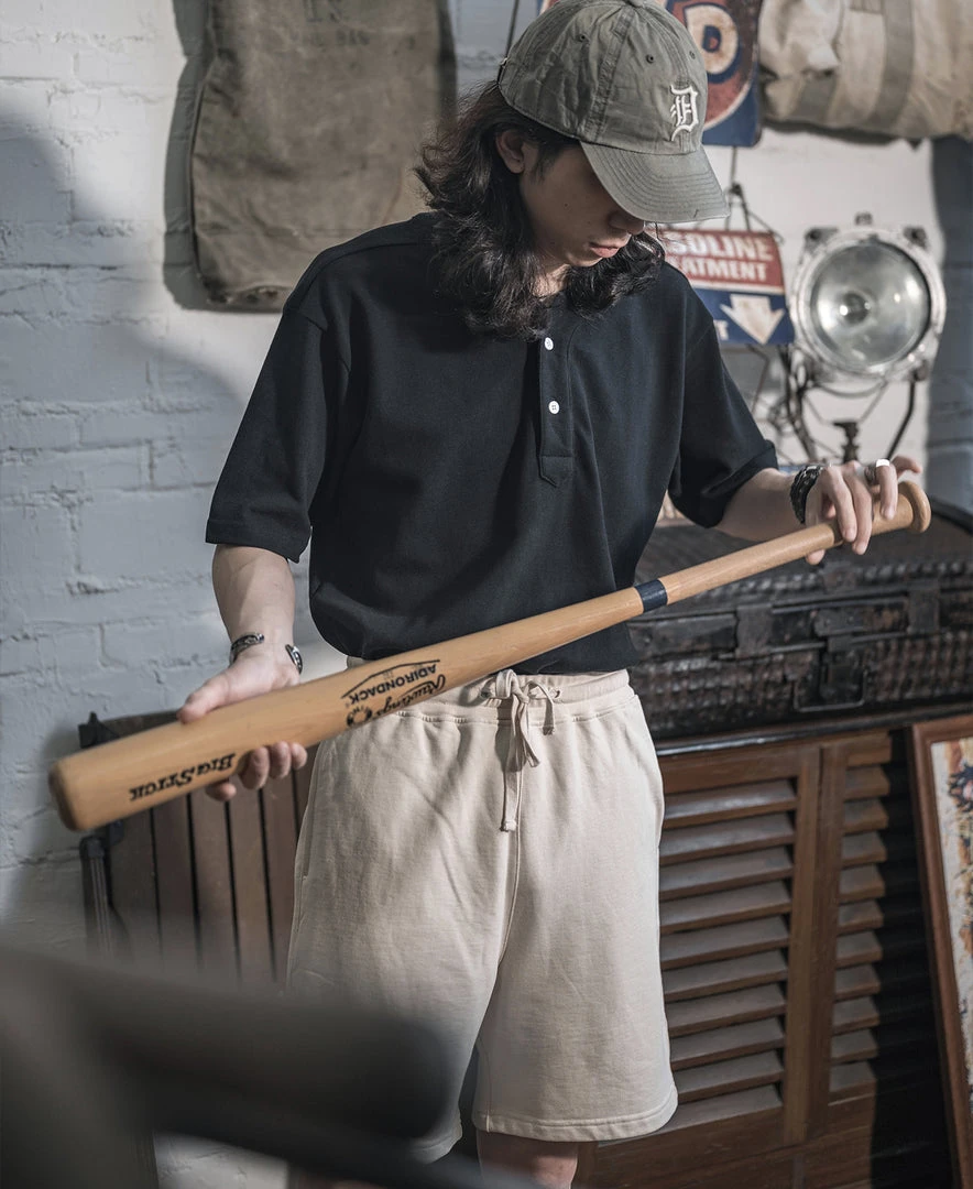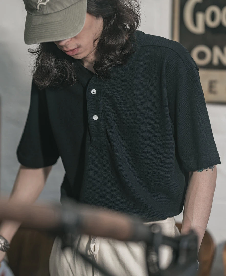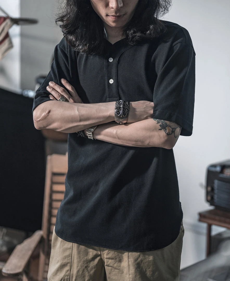 This T-Shirt is made of cotton pique, breathable and durable, with two white natural shell buttons fastening. Classic baseball shirt front placket, and dropped shoulders cut. Create casual style modeling easily.