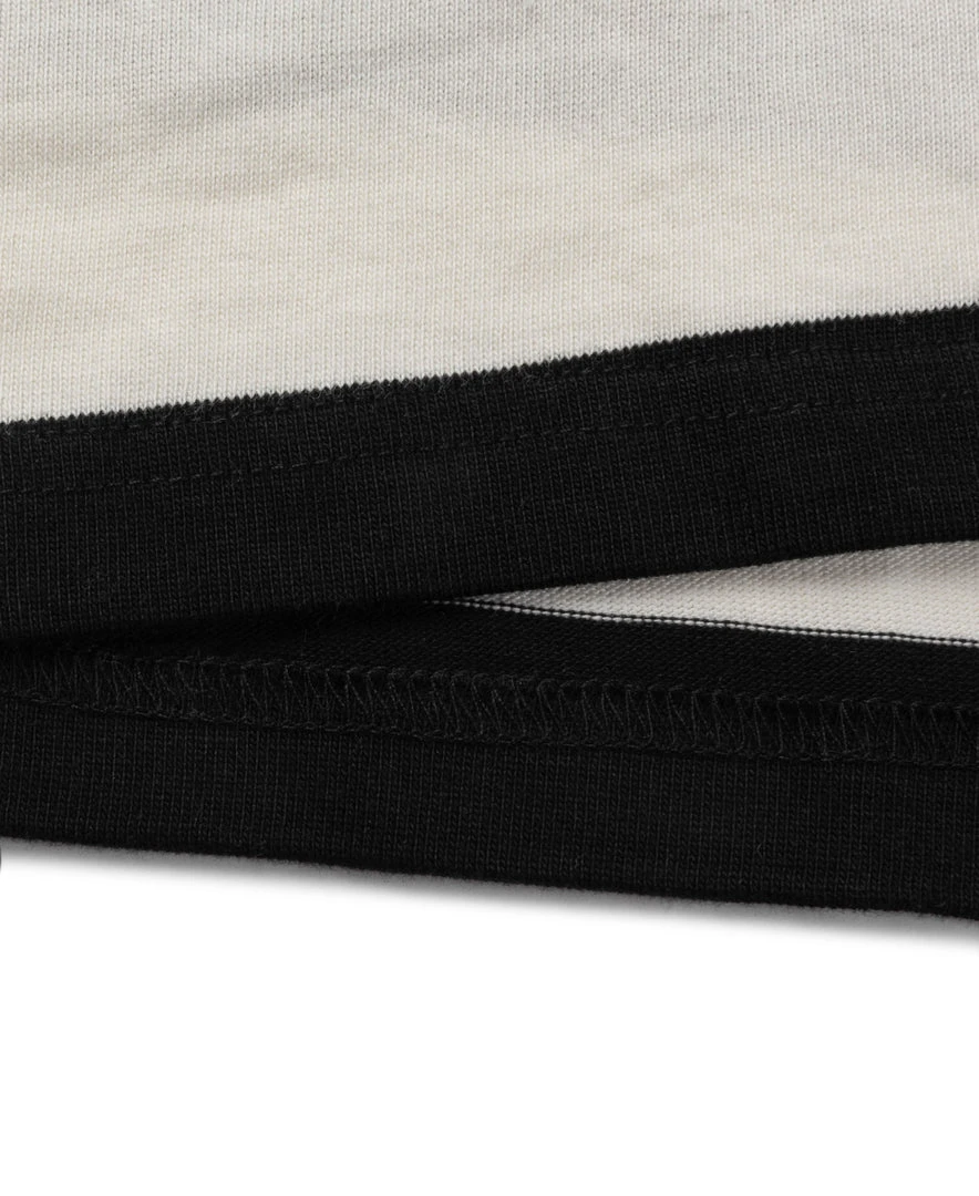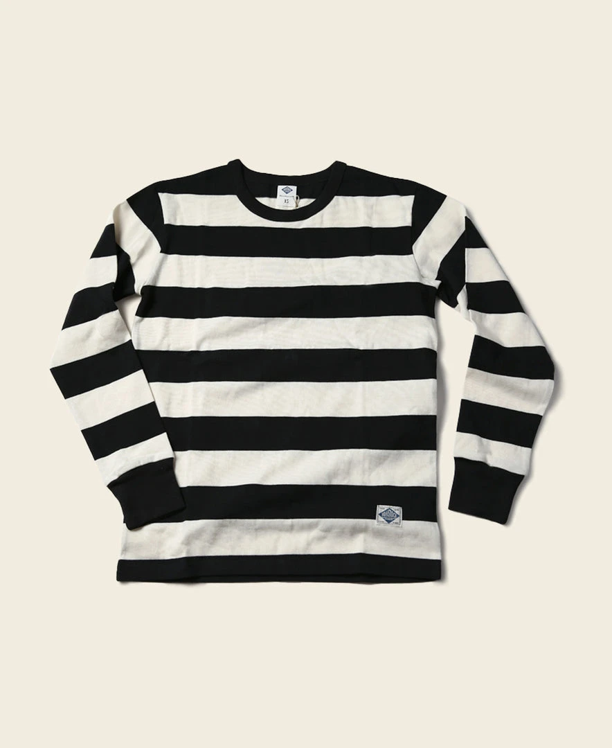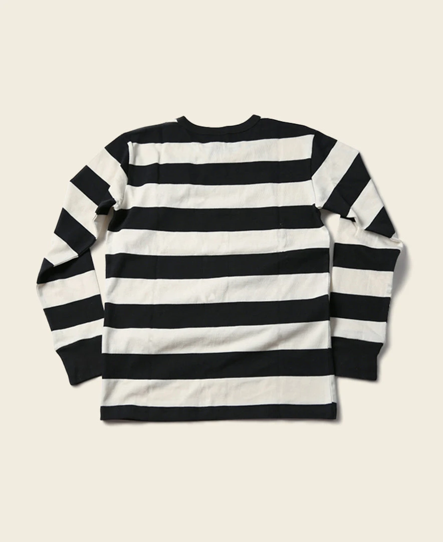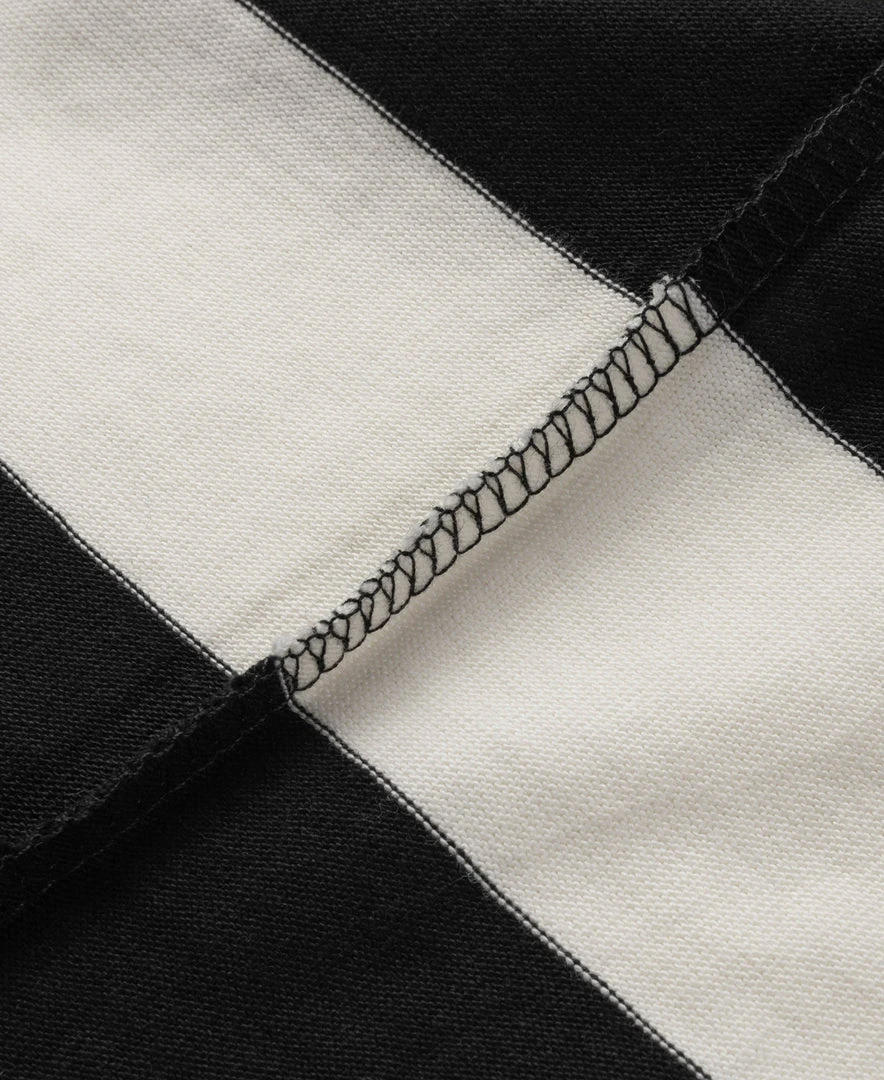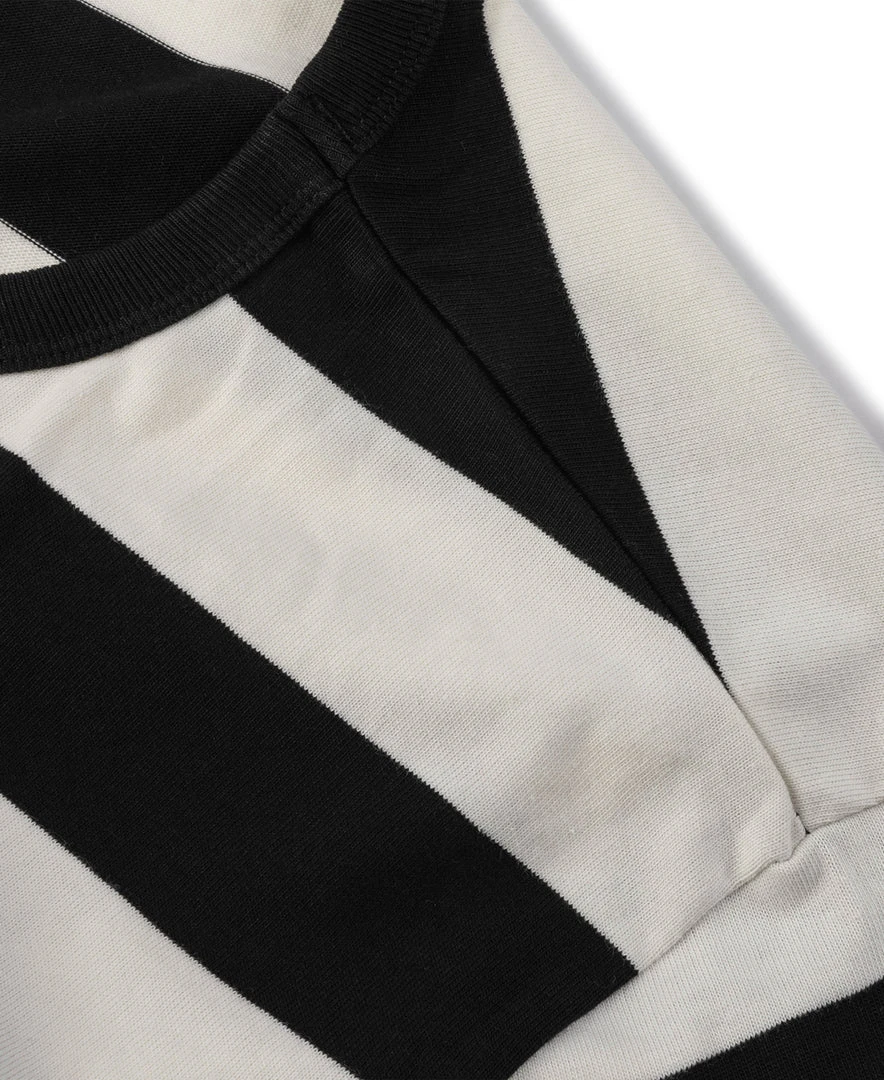This is a black and white striped t-shirt made from heavyweight 9 oz cotton fabric, comfortable and textured, primitive and durable.