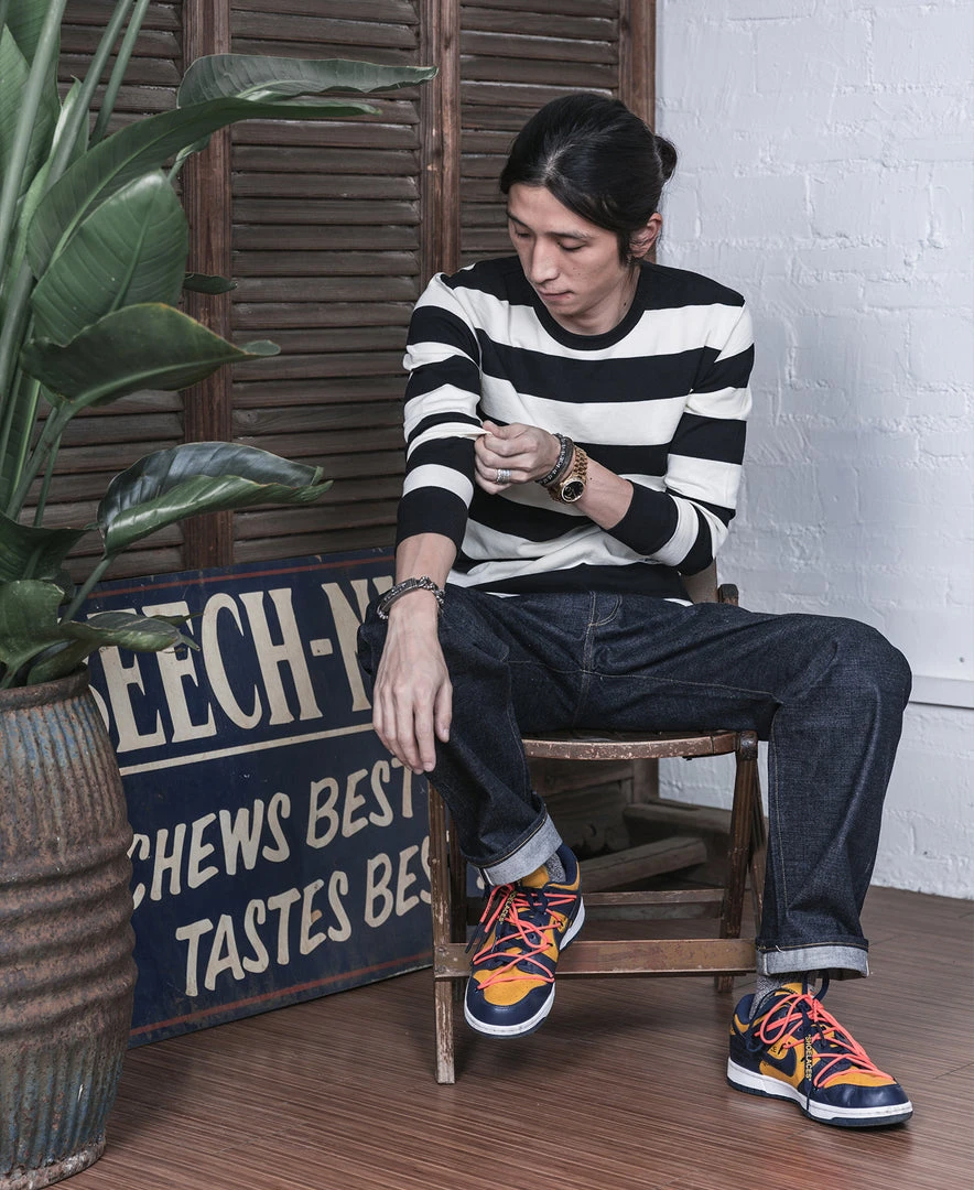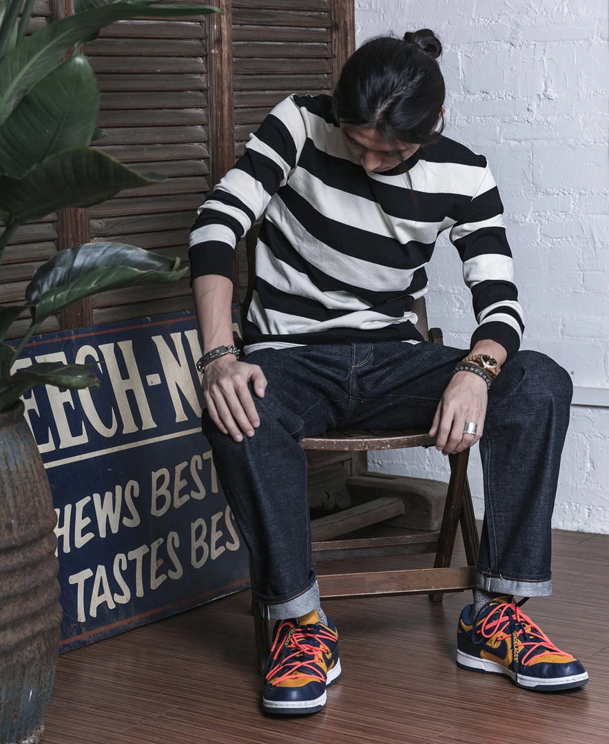 It’s a 1950s inspired striped T-shirt that became popular with motorcyclists in mid-century America.