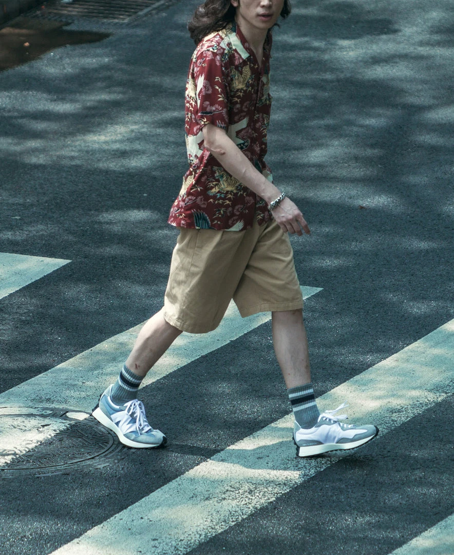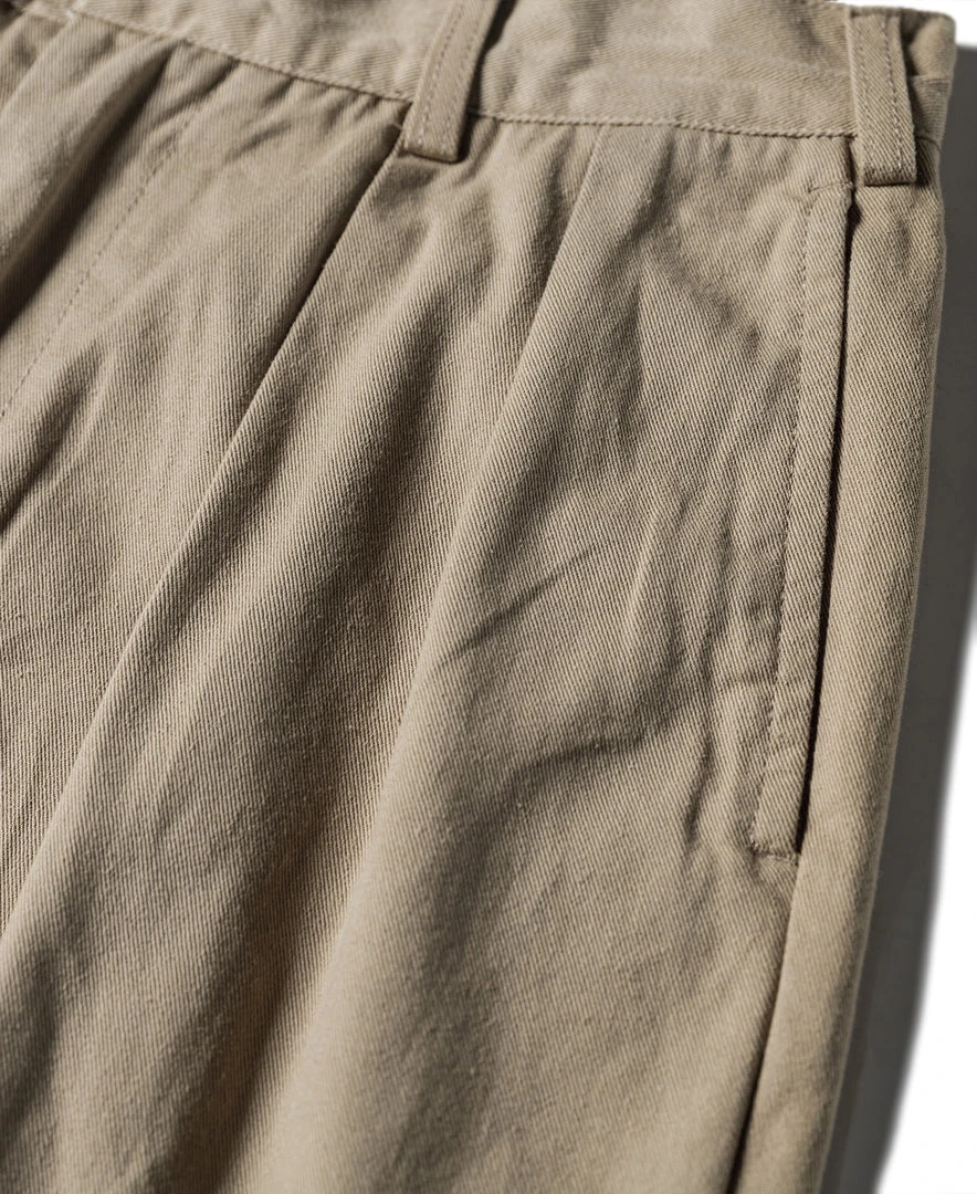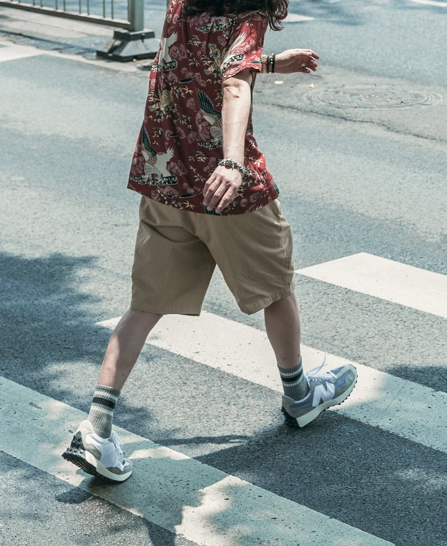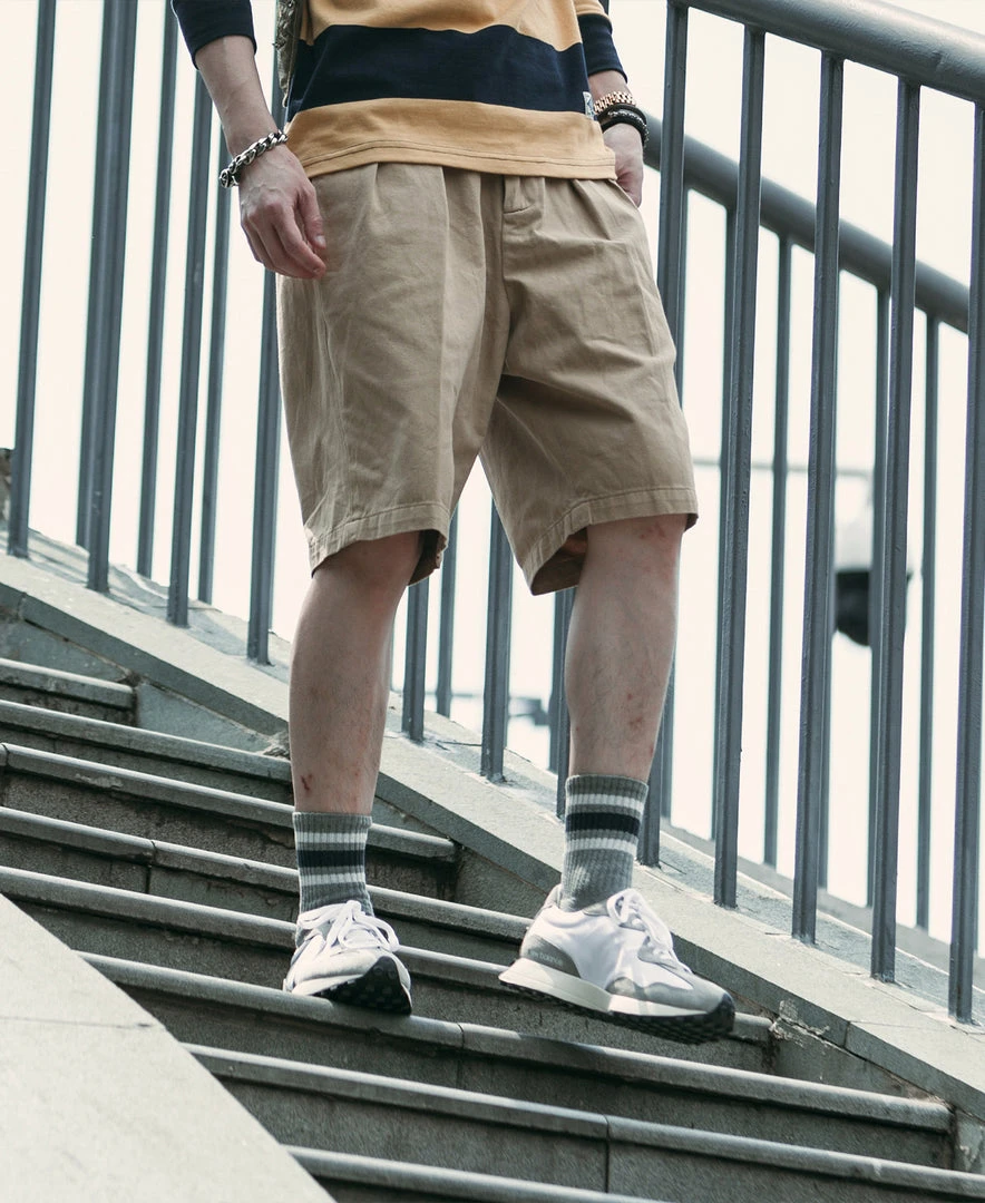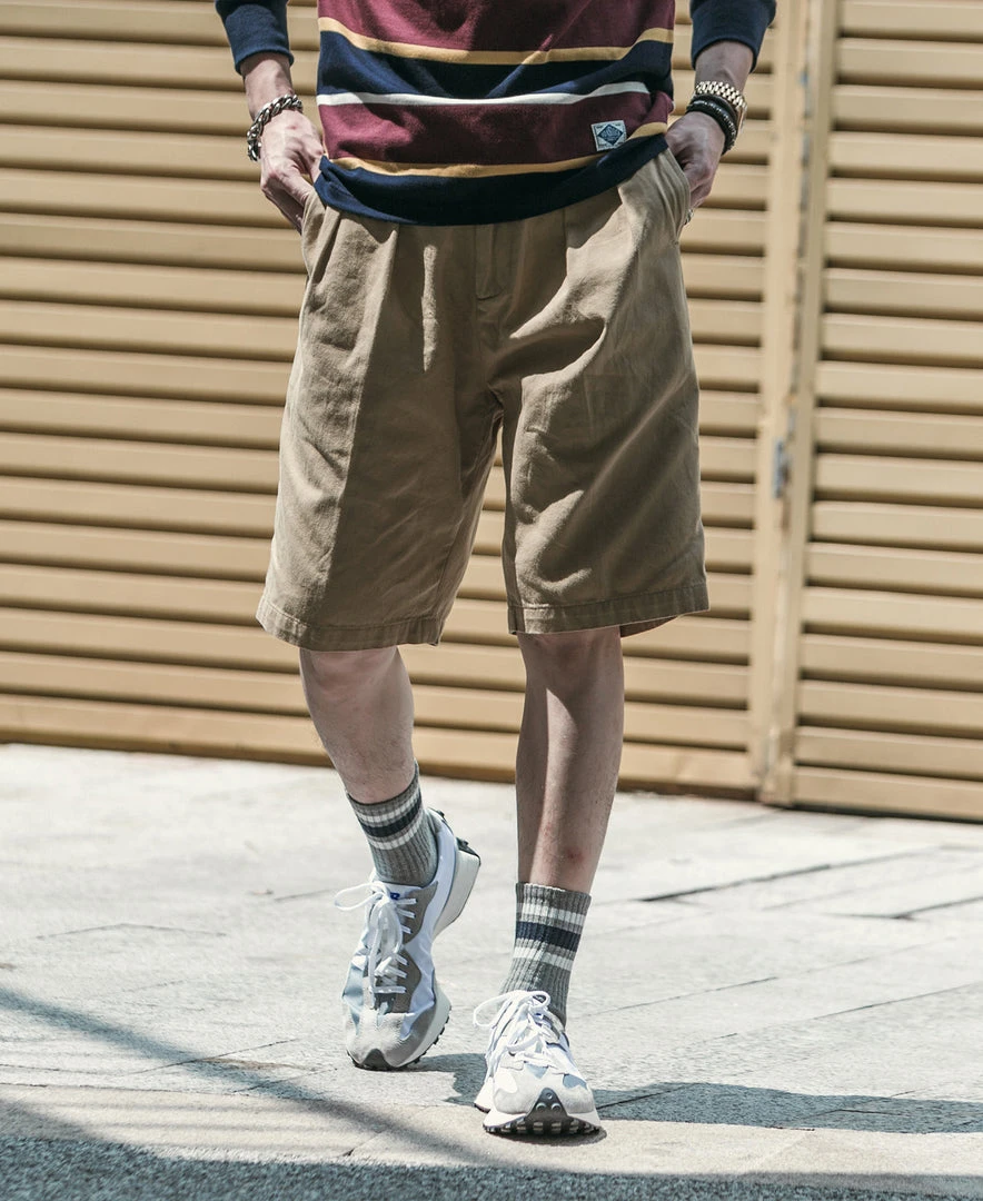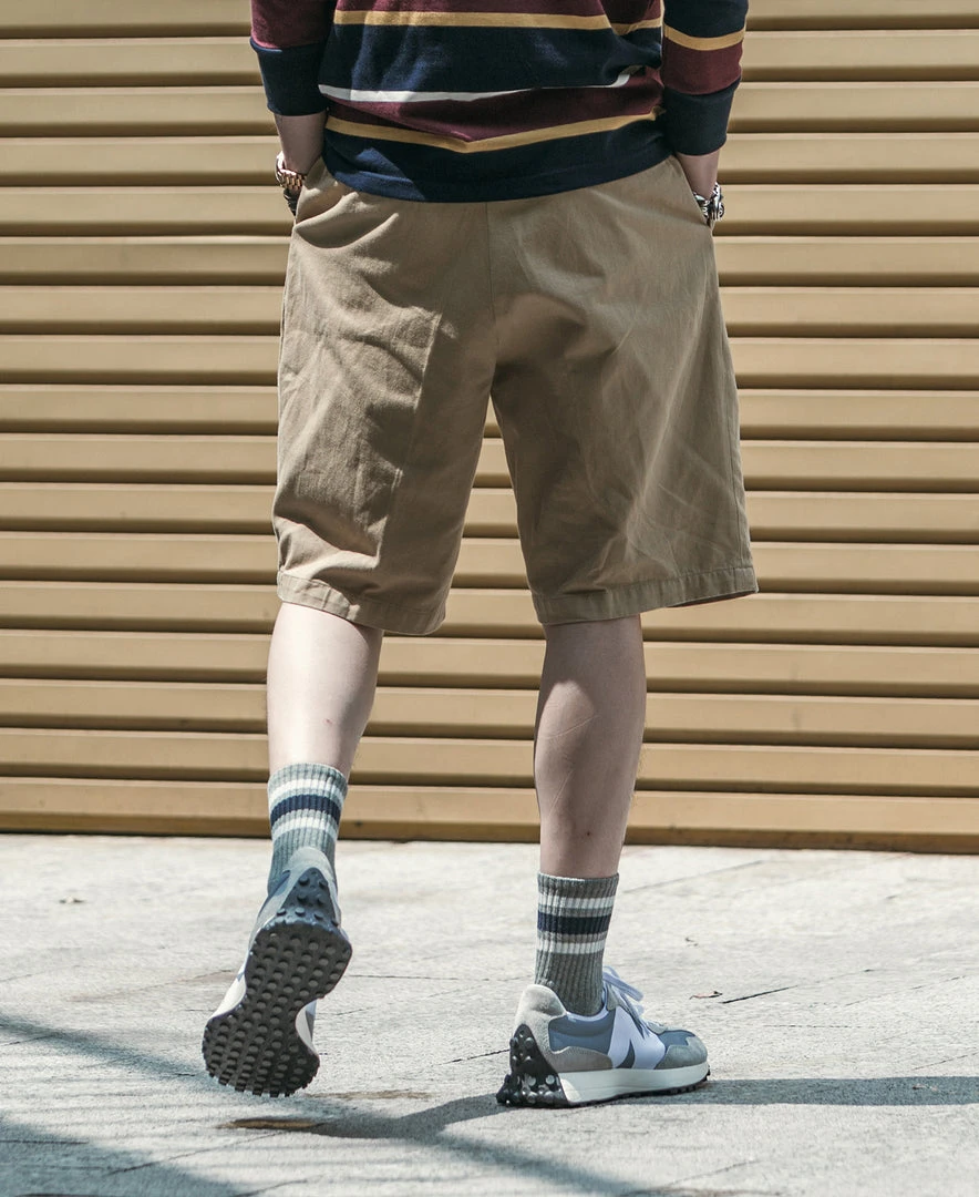 These are classic straight-leg shorts with double pleats. It is draping well and not tight. They can be matched easily with a T-shirt or shirt. In spring and fall, It can also be matched with a hoodie or trench coat. These are very popular orthodox shorts.