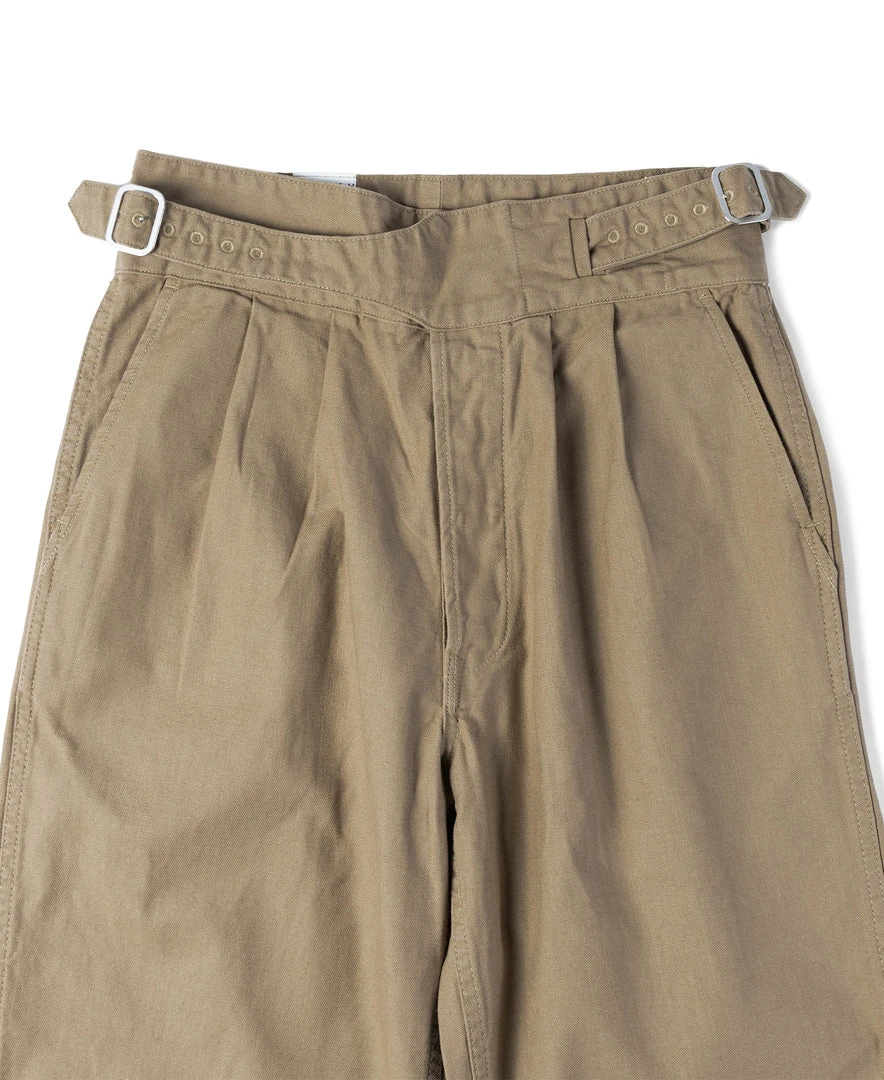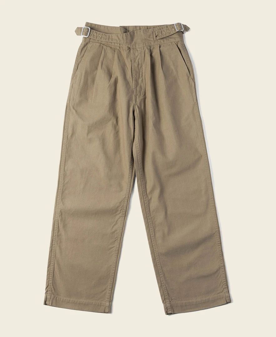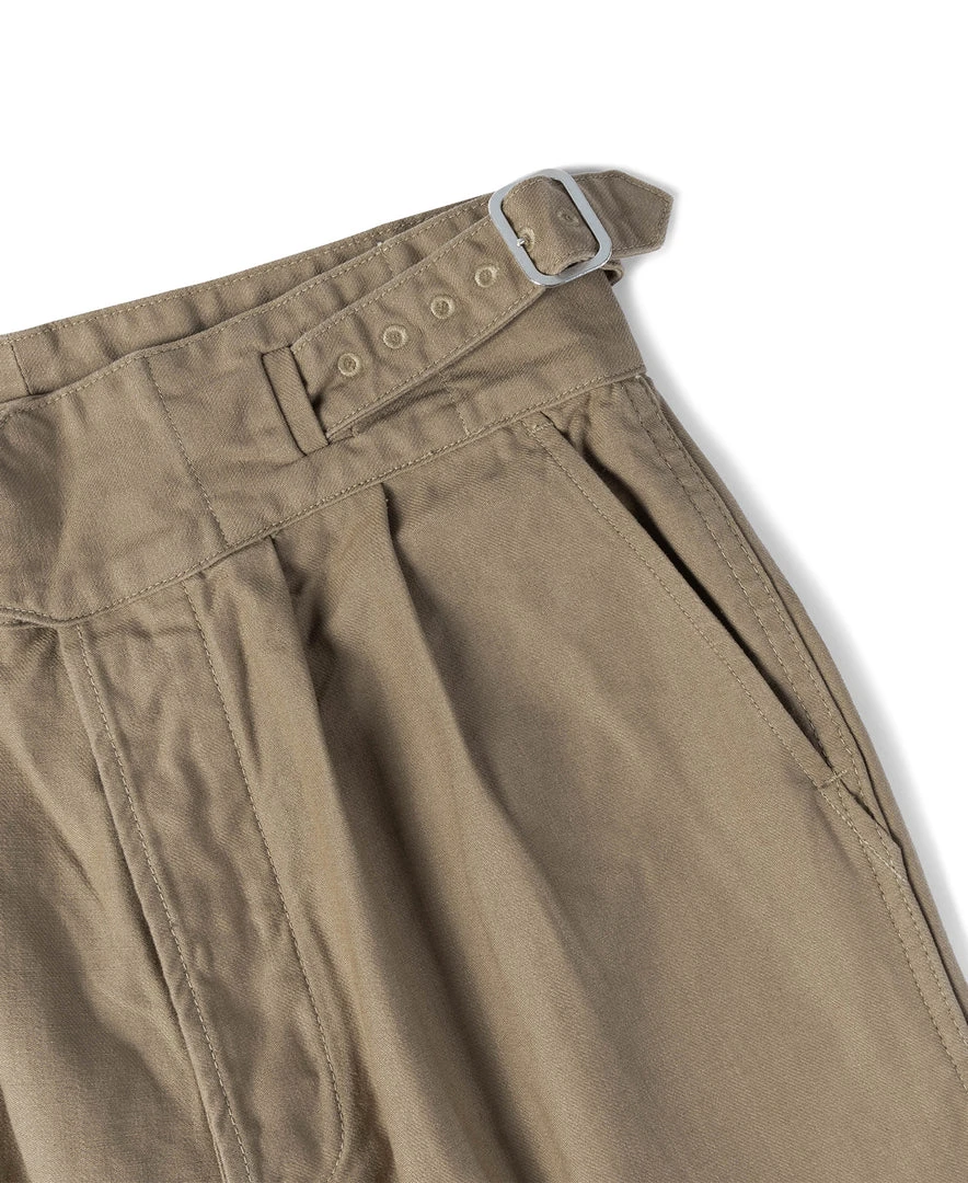 The Gurkha trouser was borne out of this alliance as well – rooted in British military tradition but explicitly modified for use by the Nepalese. The pant is defined by its double-pleated front and high, cummerbund-style waistband with buckle fastenings.