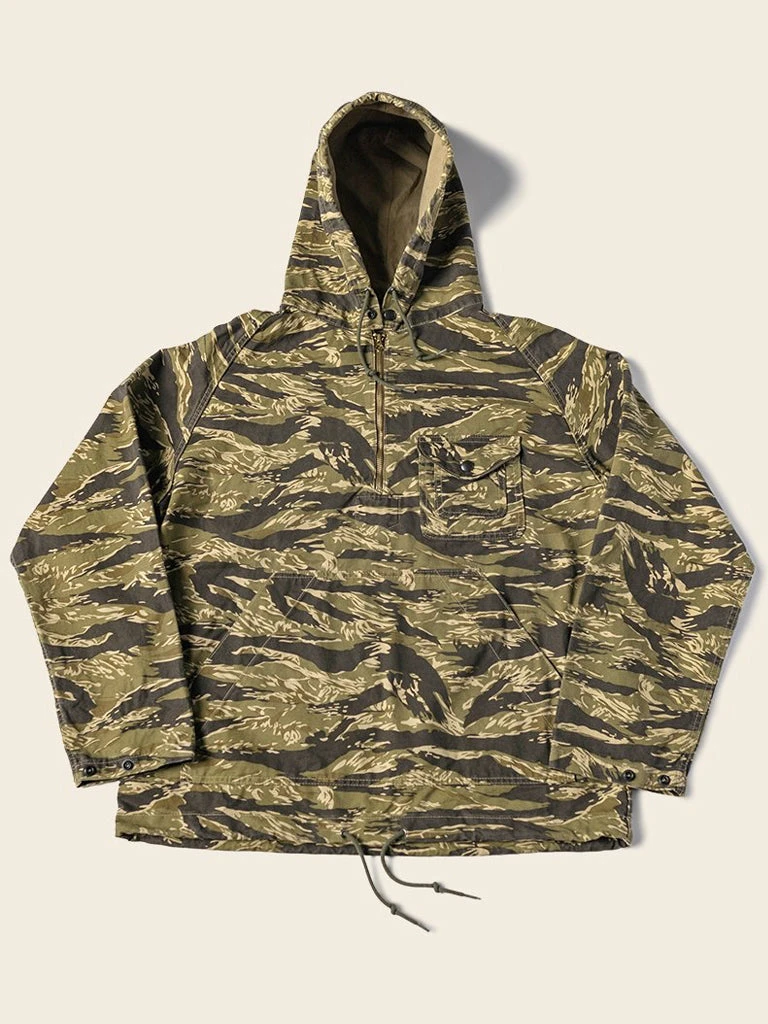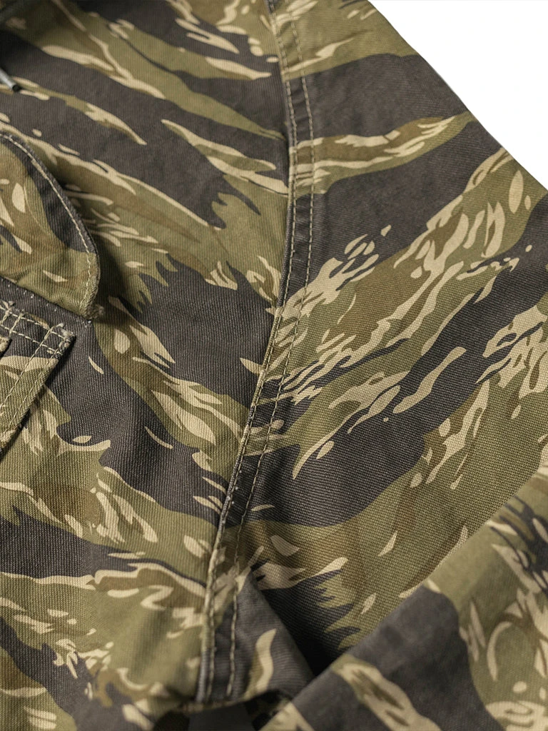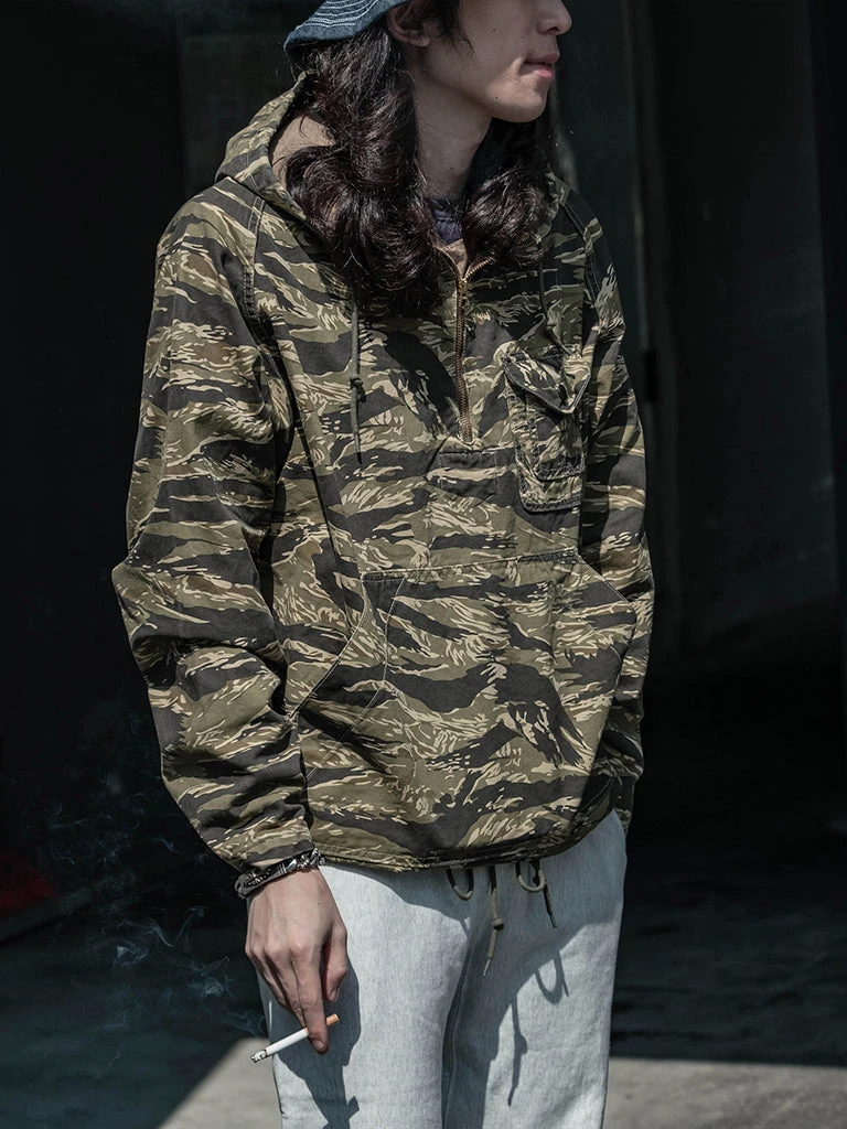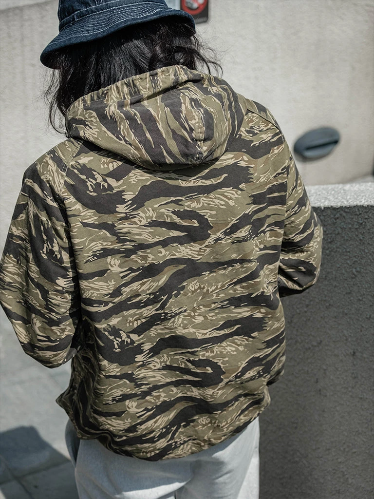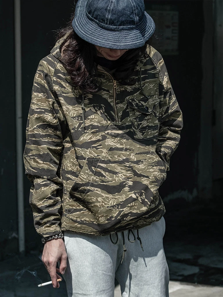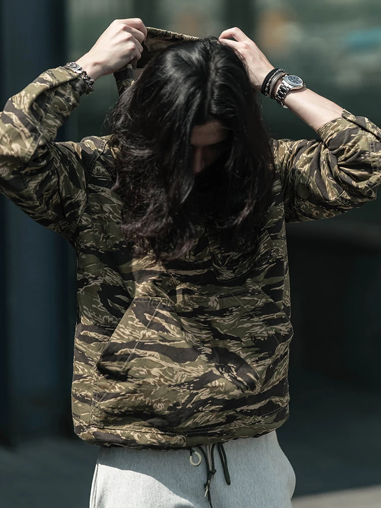 Based on jungle raincoat smock. This smock has a loose silhouette, a huge hood, a small chest pocket for important items, a large pocket at the waist (Through the type), and a drawstring to tighten the hem. This smock adopts the famous golden tiger stripe in the Vietnam War’s tiger camouflage, adopts cotton twill fabric and multiple color printing process, and has a retro charm after long washing and fading.