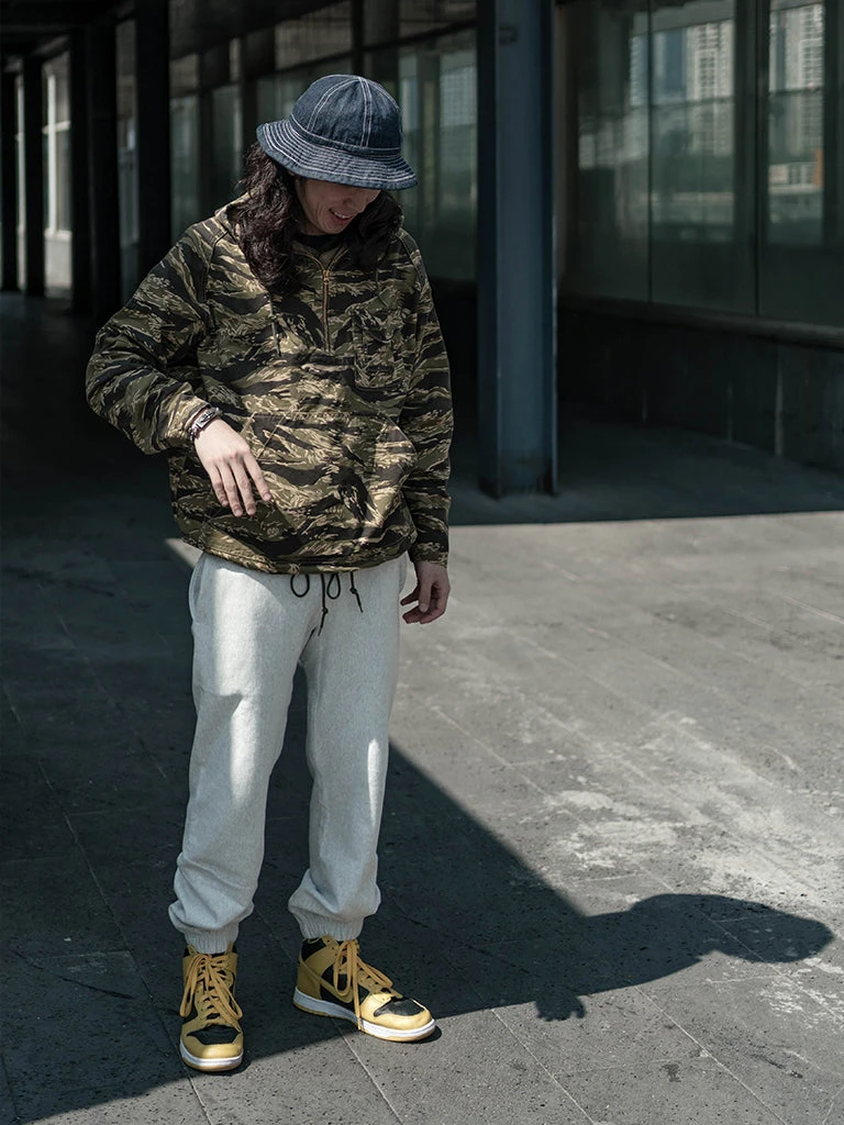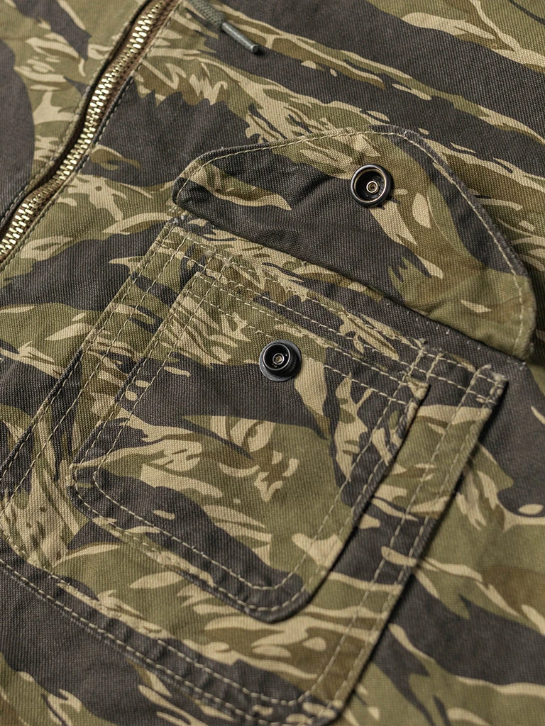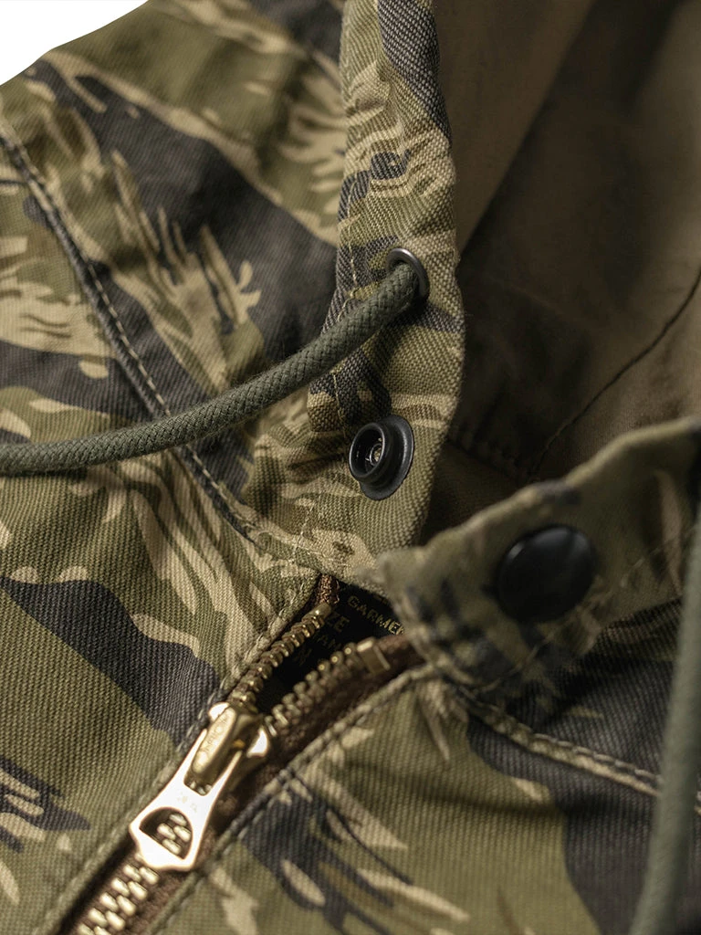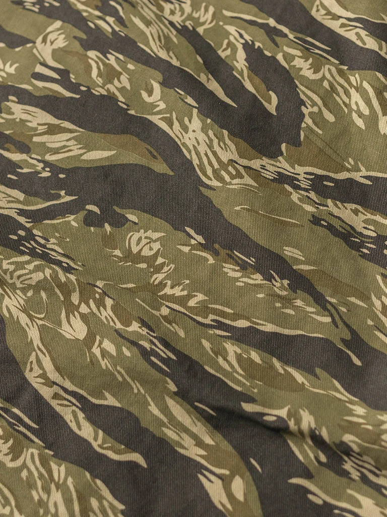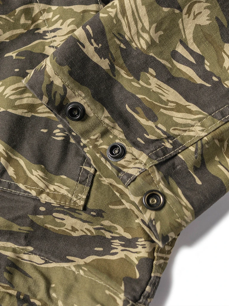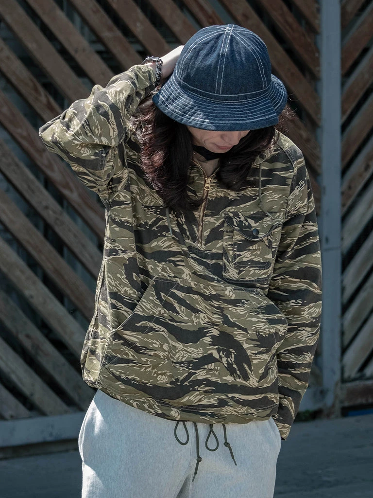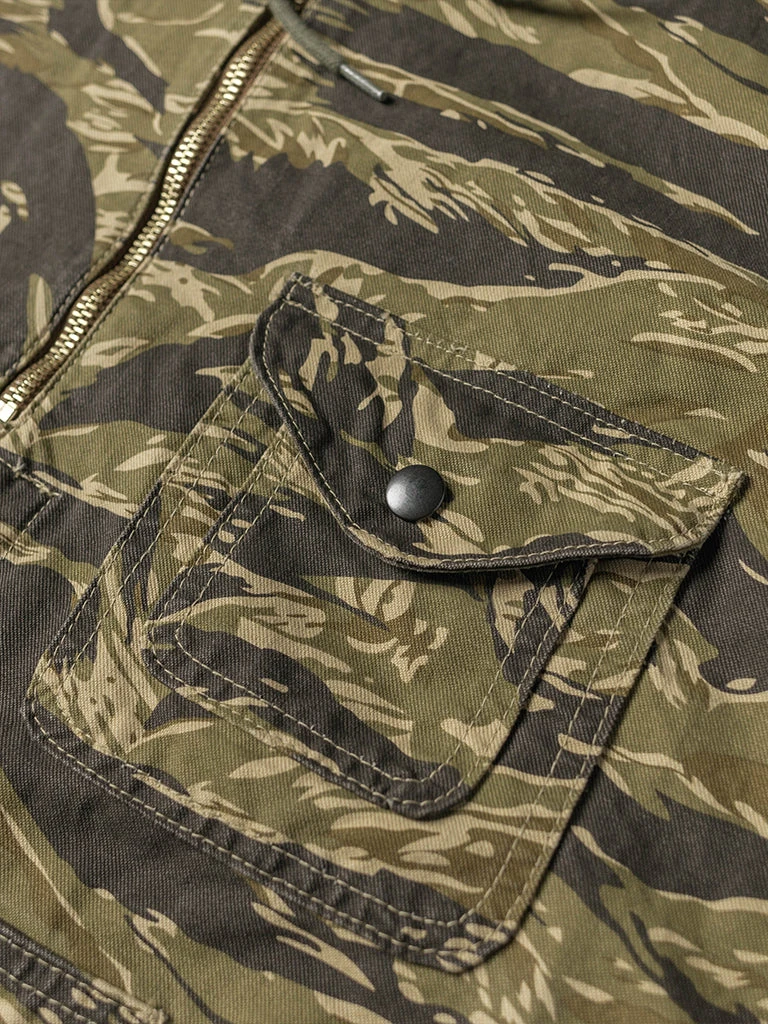 Based on jungle raincoat smock. This smock has a loose silhouette, a huge hood, a small chest pocket for important items, a large pocket at the waist (Through the type), and a drawstring to tighten the hem. This smock adopts the famous golden tiger stripe in the Vietnam War’s tiger camouflage, adopts cotton twill fabric and multiple color printing process, and has a retro charm after long washing and fading.