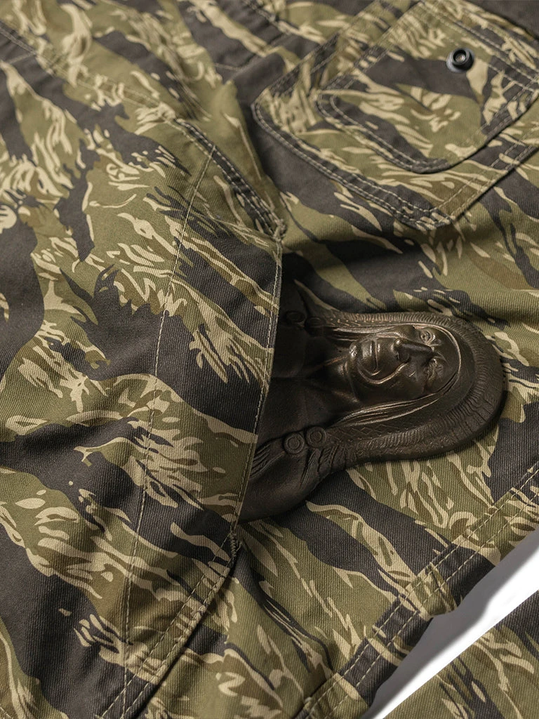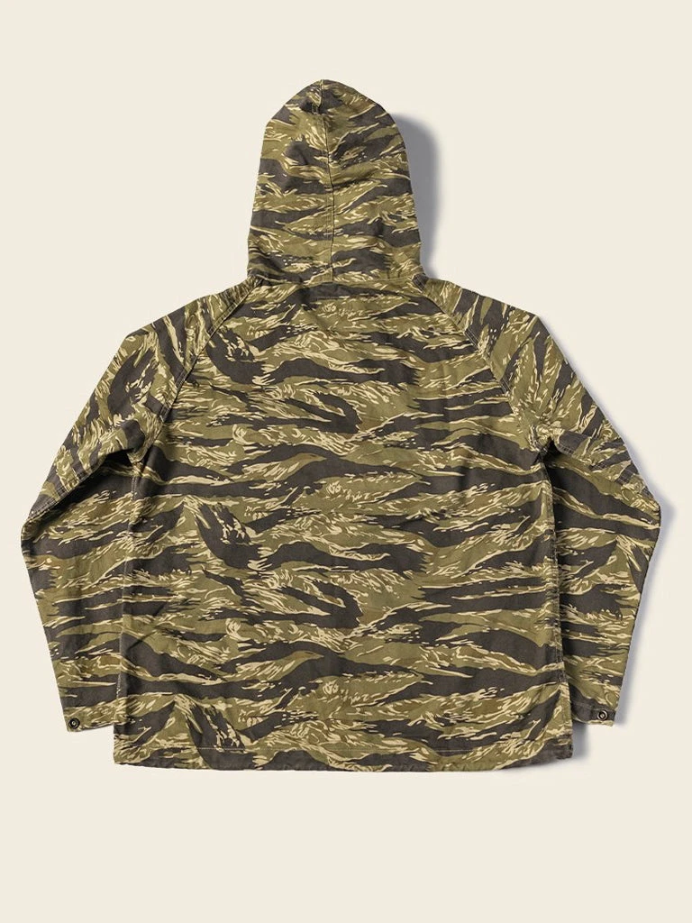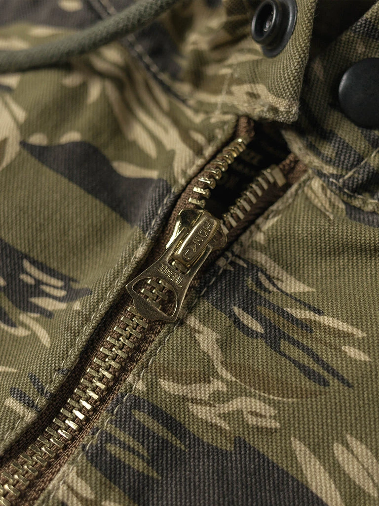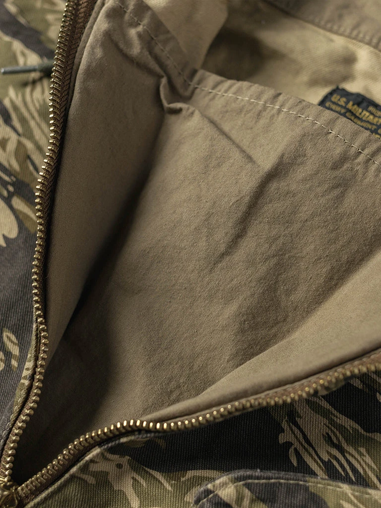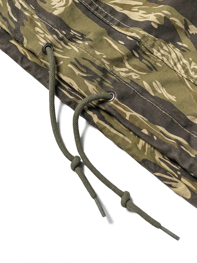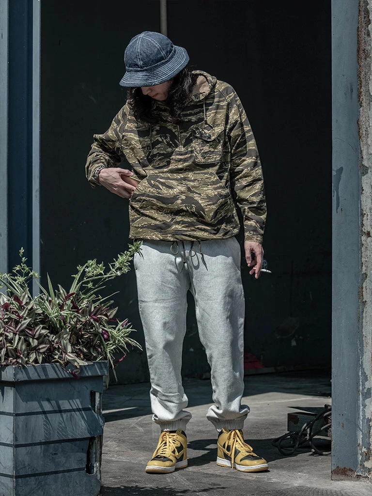 Based on jungle raincoat smock. This smock has a loose silhouette, a huge hood, a small chest pocket for important items, a large pocket at the waist (Through the type), and a drawstring to tighten the hem. This smock adopts the famous golden tiger stripe in the Vietnam War’s tiger camouflage, adopts cotton twill fabric and multiple color printing process, and has a retro charm after long washing and fading.