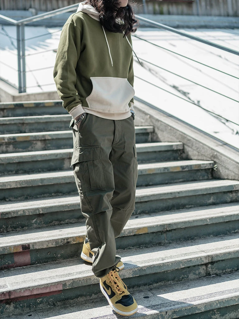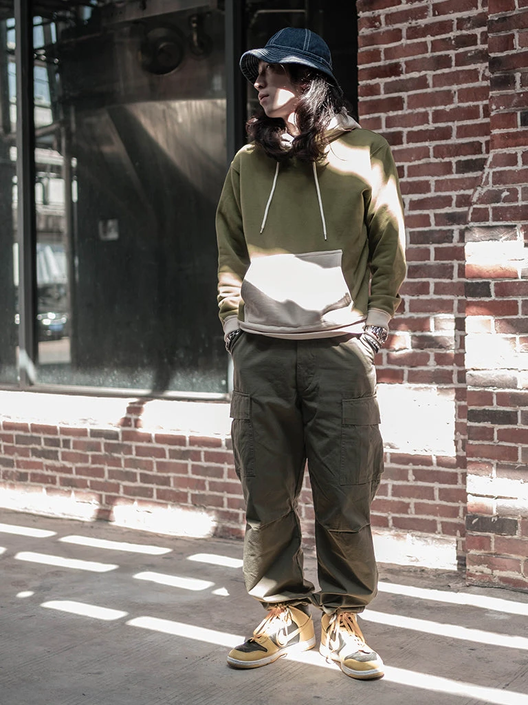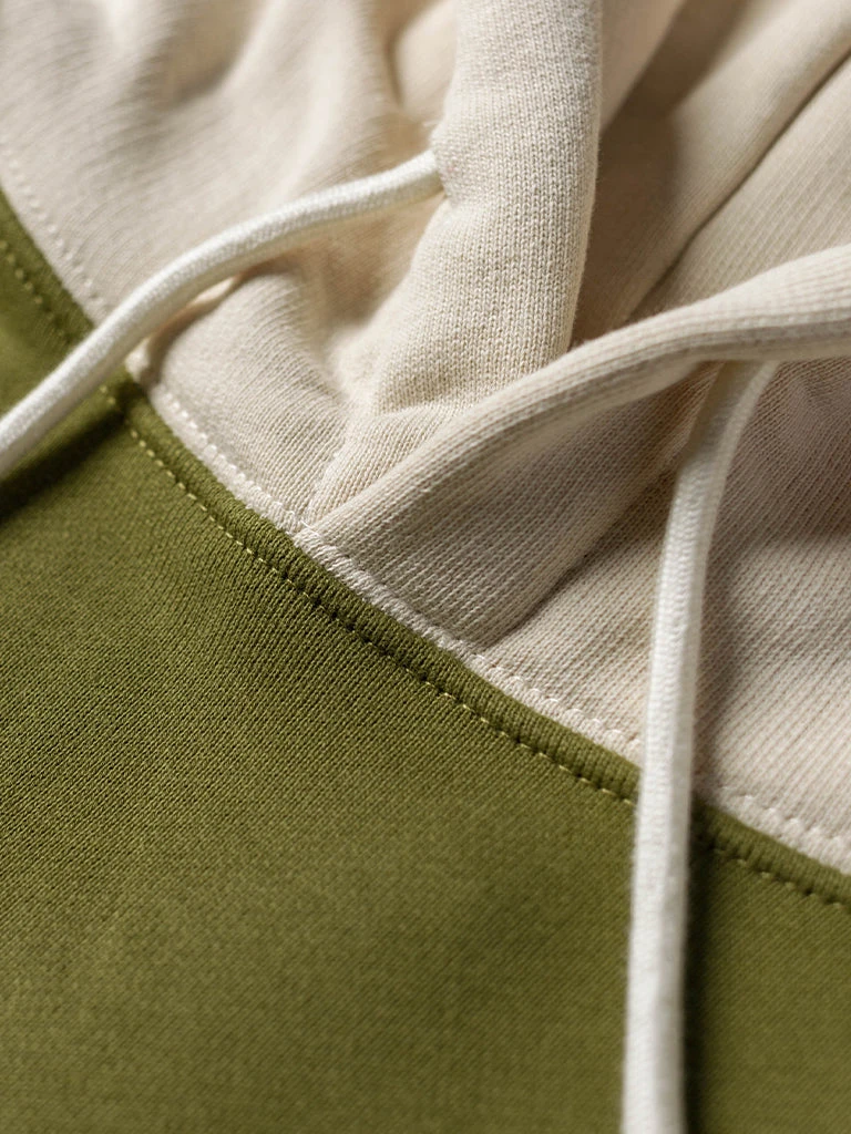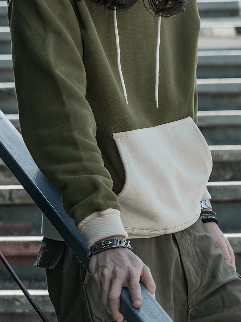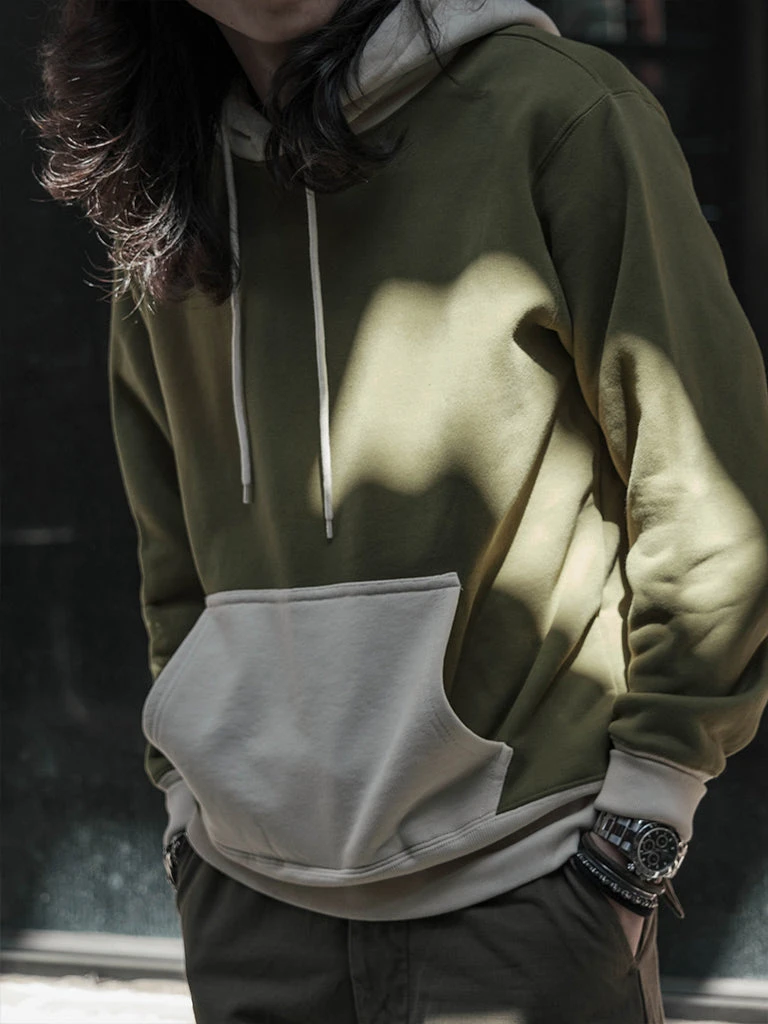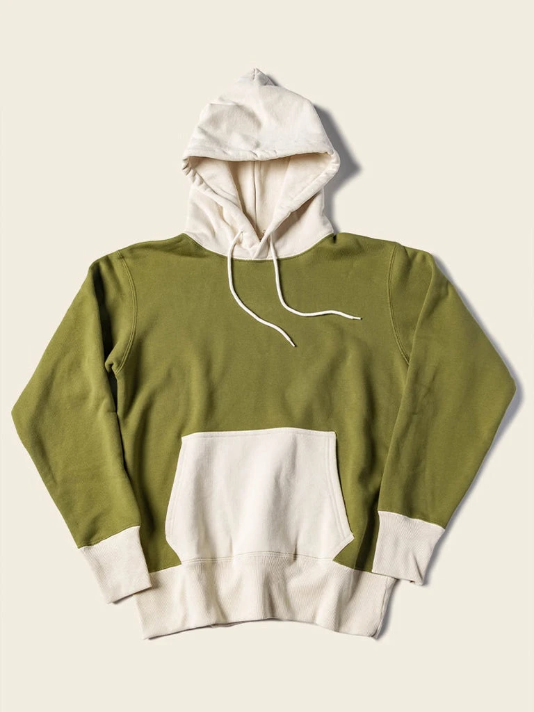 Based on a two-color hoodie from the 1930s to the 1950s. At that time, due to the shortage of materials, the fabric should be used as much as possible, and the factory would splice the remaining fabric or cut pieces into a piece of clothing. Typically sold in grocery stores, the product became popular with young people, leading to the creation of many IVY-Style hoodies and tracksuits.