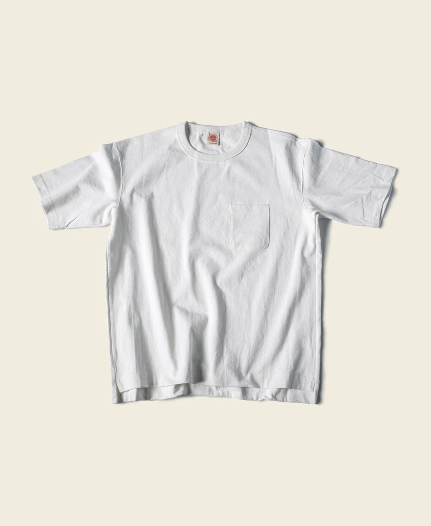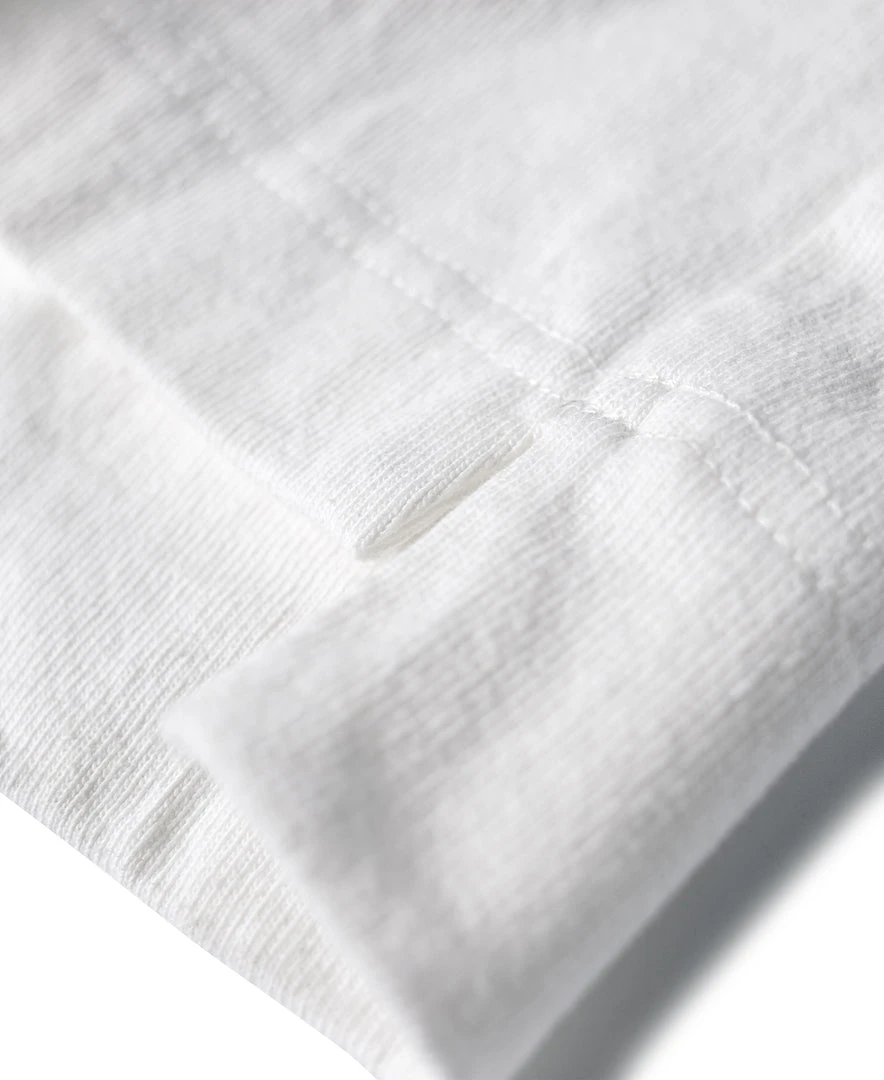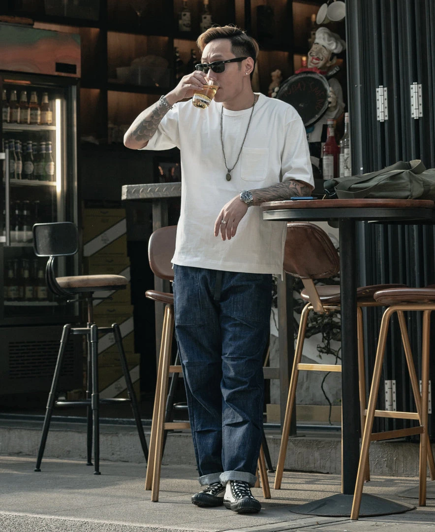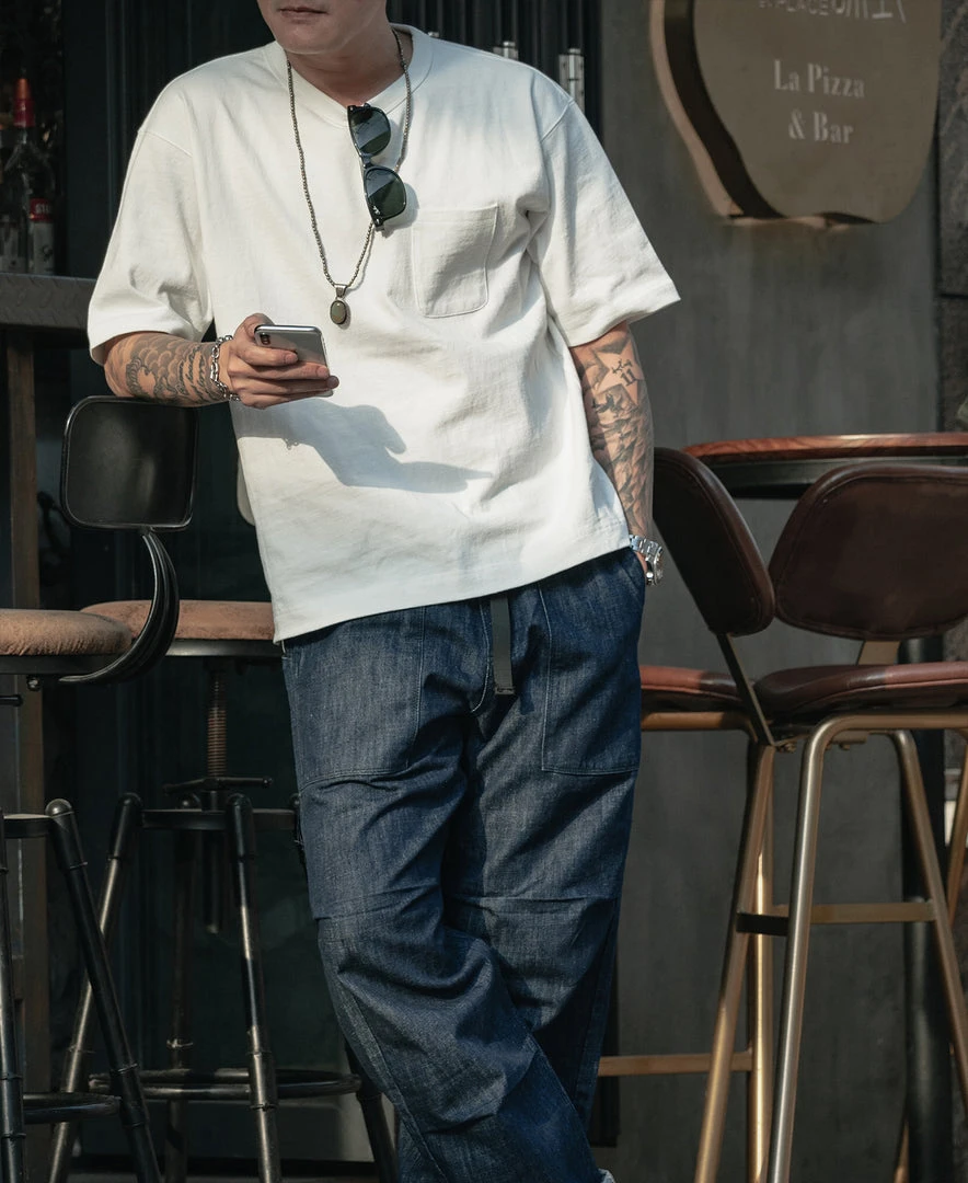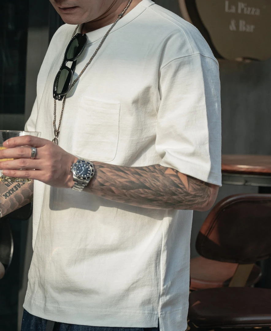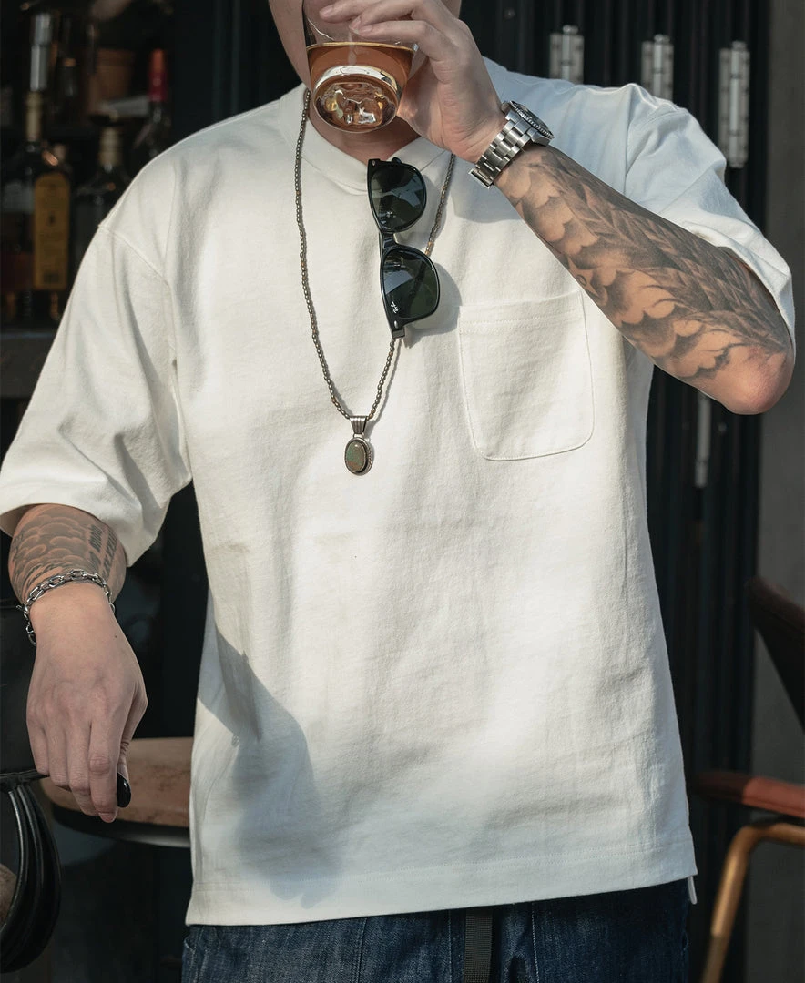 With a vintage-inspired loose fit, dropped shoulders, a U-shaped chest pocket and a split hem, this is the kind of T-shirt that’ll never go out of style. Made of roving cotton fabric, the fabric has a strong texture and a rough touch, just like blending flax into the fabric.