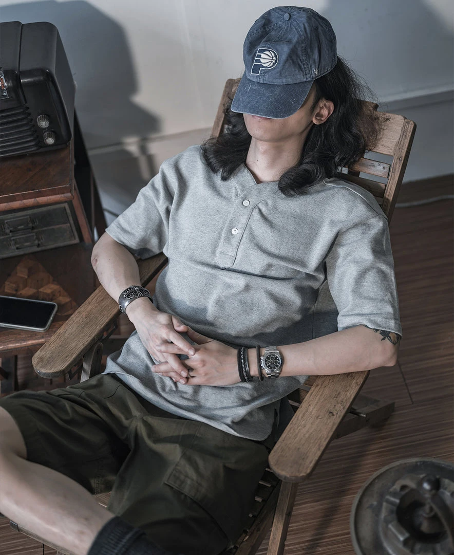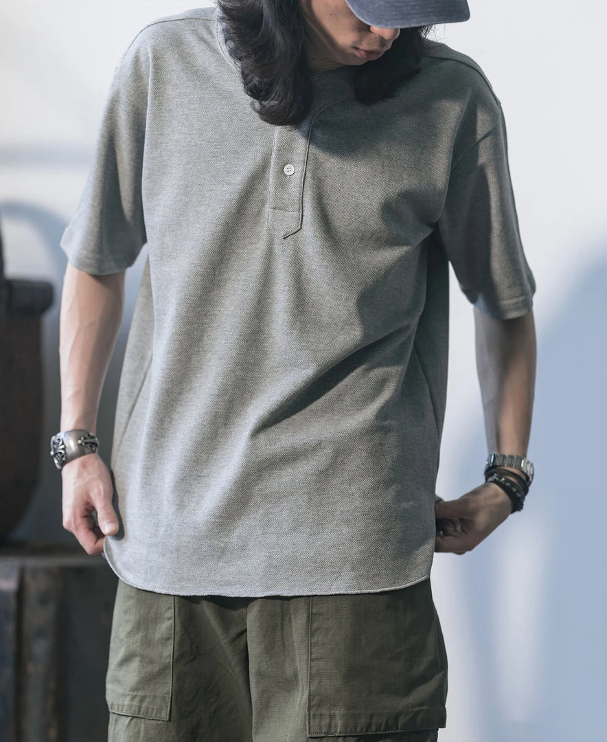This T-Shirt is made of cotton pique, breathable and durable, with two white natural shell buttons fastening. Classic baseball shirt front placket, and dropped shoulders cut. Create casual style modeling easily.