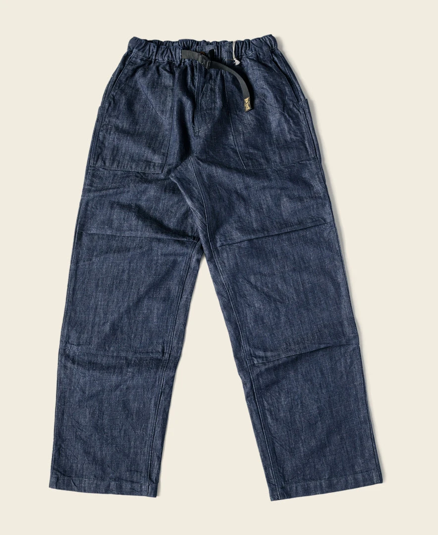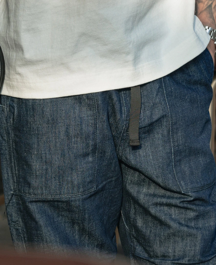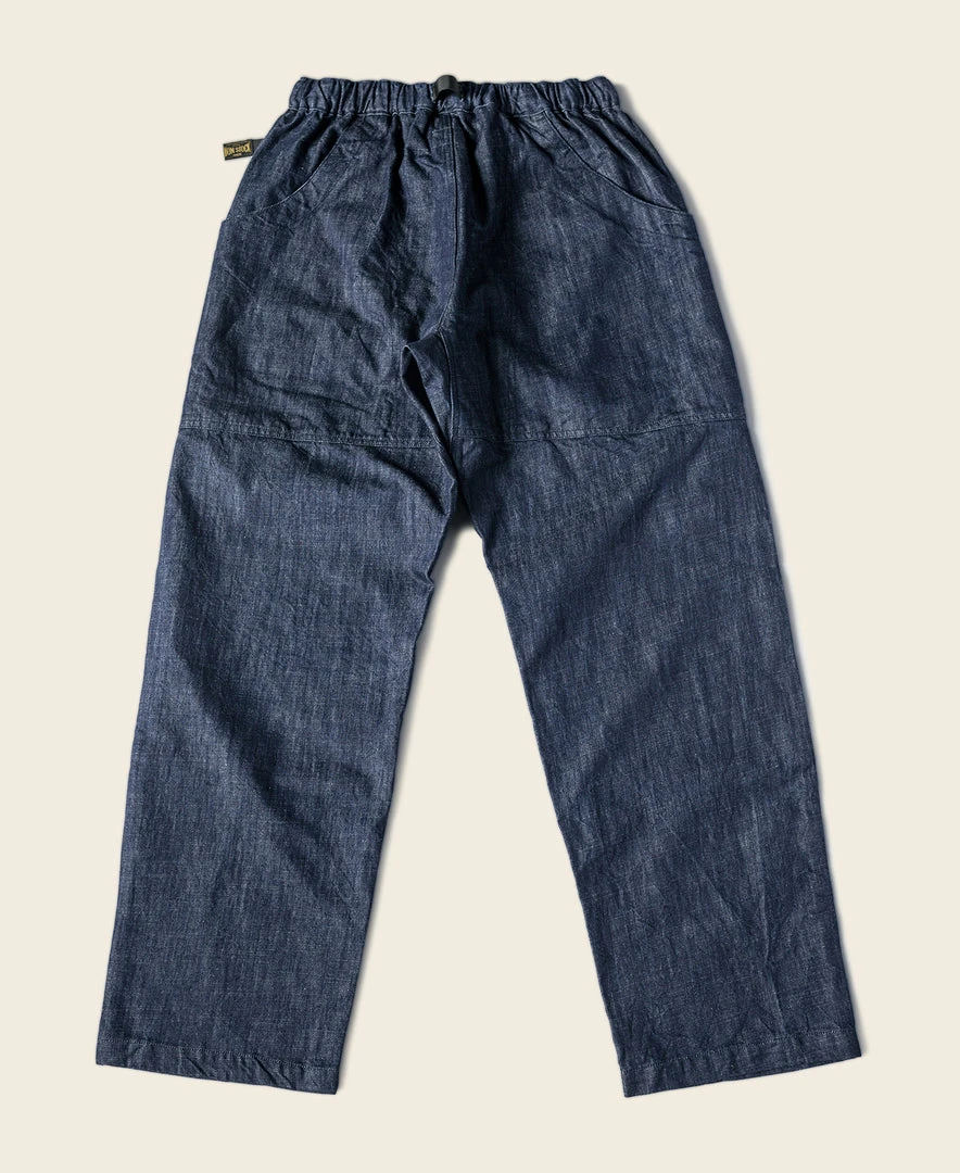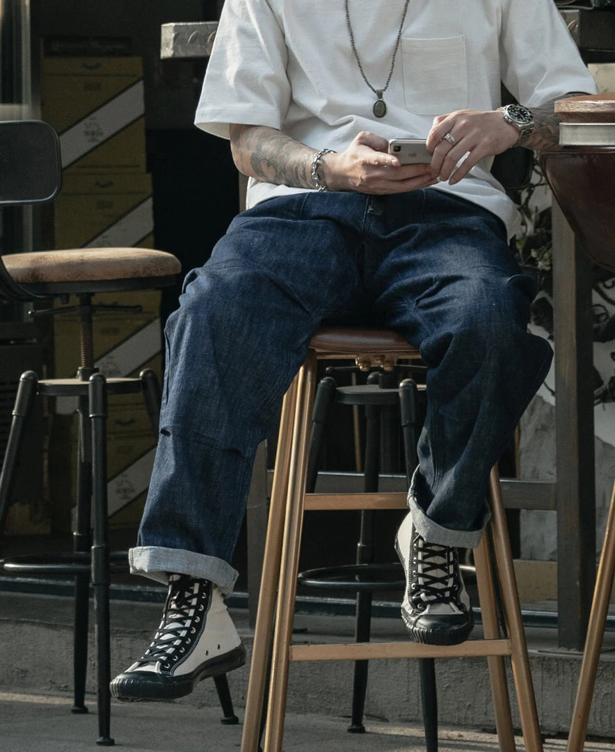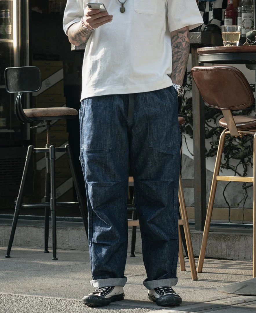 It is made of 11 oz cotton and linen-blend fabric, it is slightly grainy but more breathable than cotton denim. Its gusseted crotch, which allowed greater movement, and two front slant pockets, and two patch pockets on the back for storing items easily. A thickened nylon adjustment strap at the waist can be used for fit adjustment at any time which is very convenient. The trouser legs opening narrow slightly, which can be matched with military style or outdoor style, Very practical.