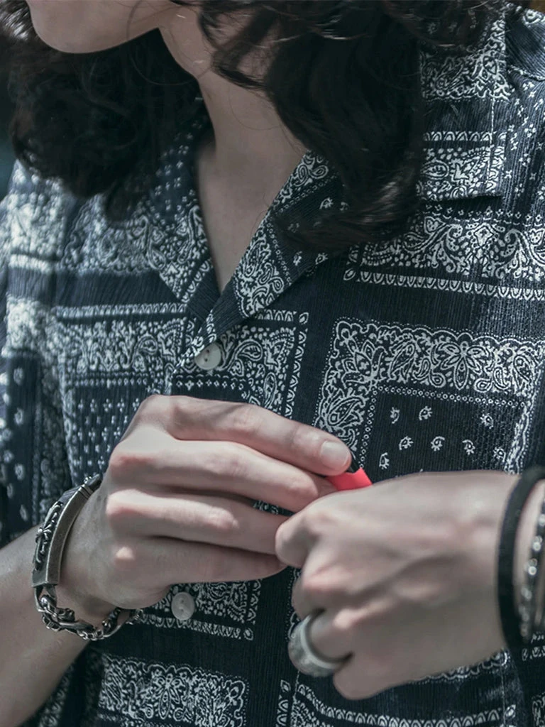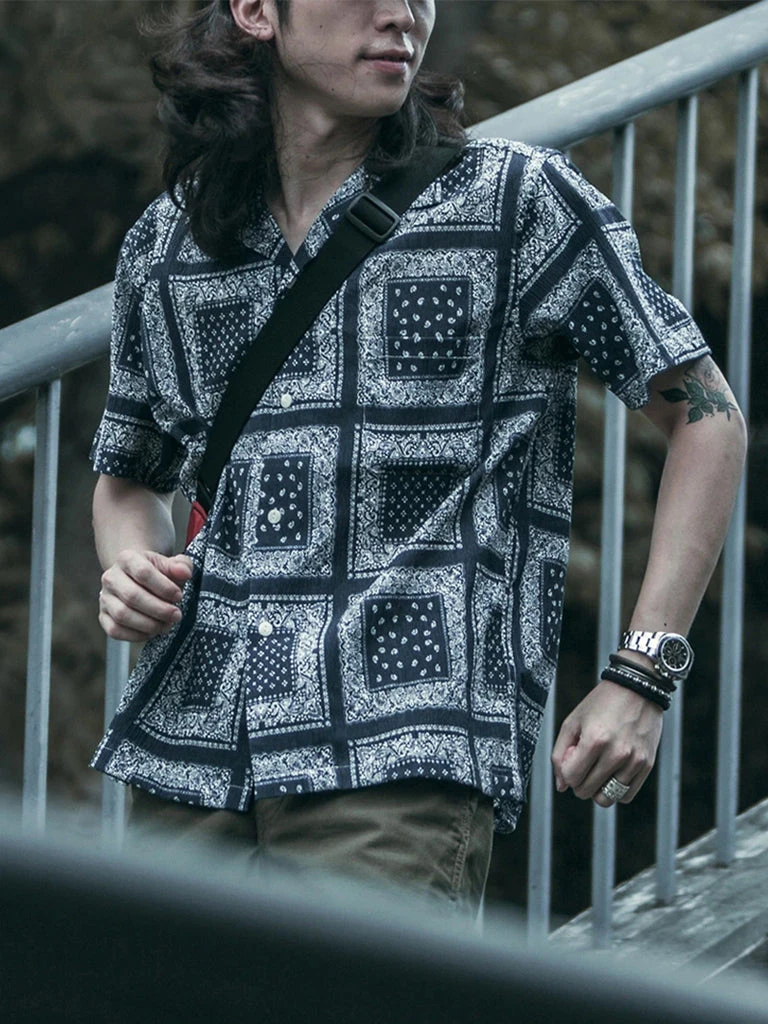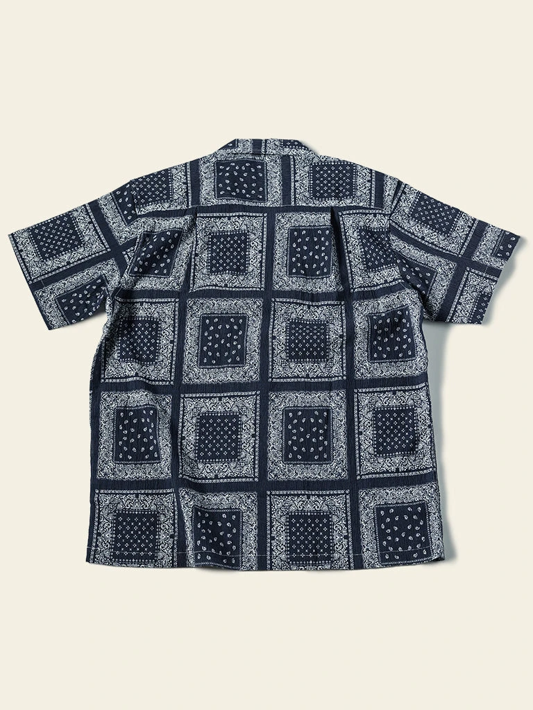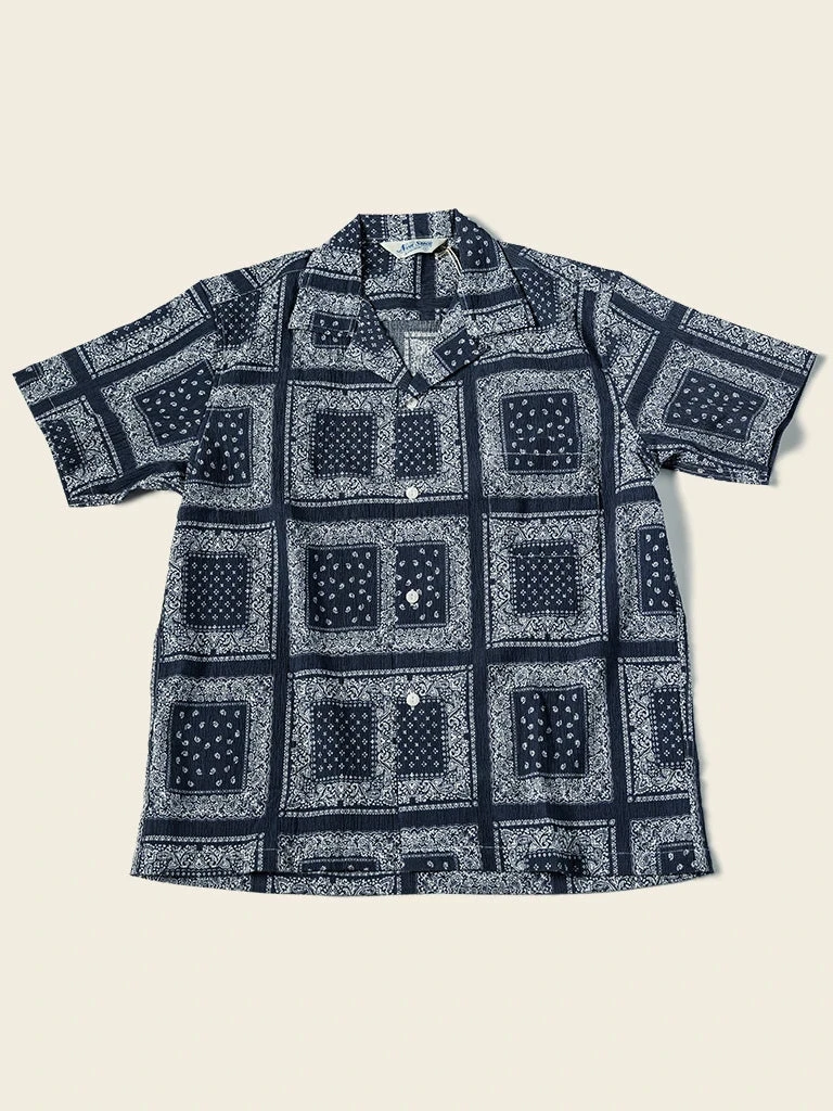 This shirt is reminiscent of the open collar shirts of the 1950s, made of rayon seersucker, uses paisley print, has navy & sky blue, two colors.