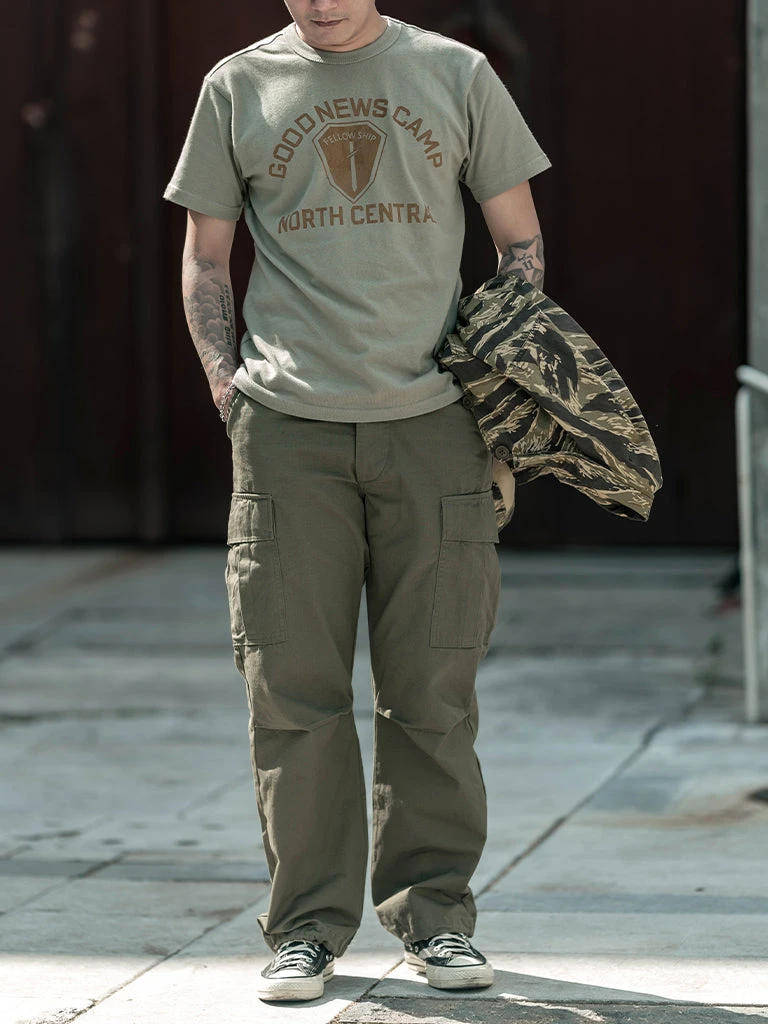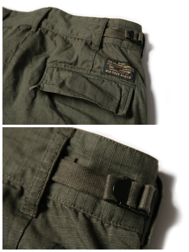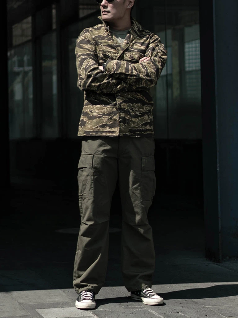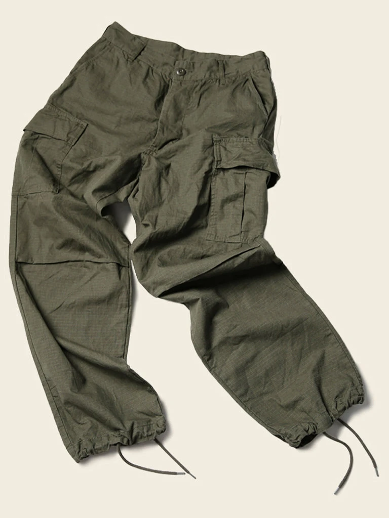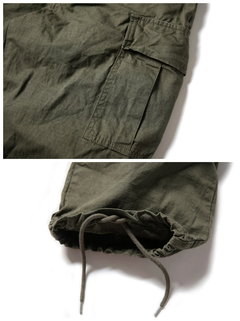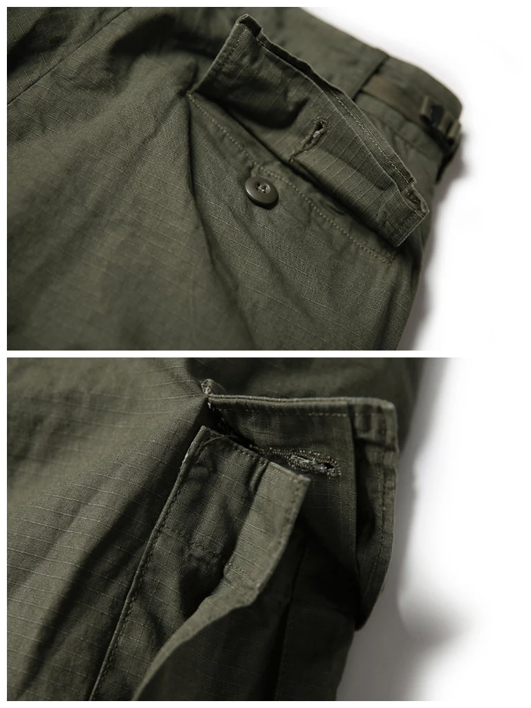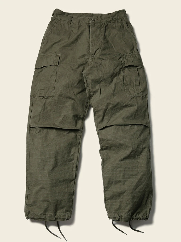 Based on the 1969 5th Tropical Combat Pants, the epaulet and adjustable waistband were removed. The ripstop fabric introduced in 1968 was used. With hidden type pocket buttons, the drawstring was removed inside the pocket and add pleats at the knees. These pants are very close to the original in both color and texture.